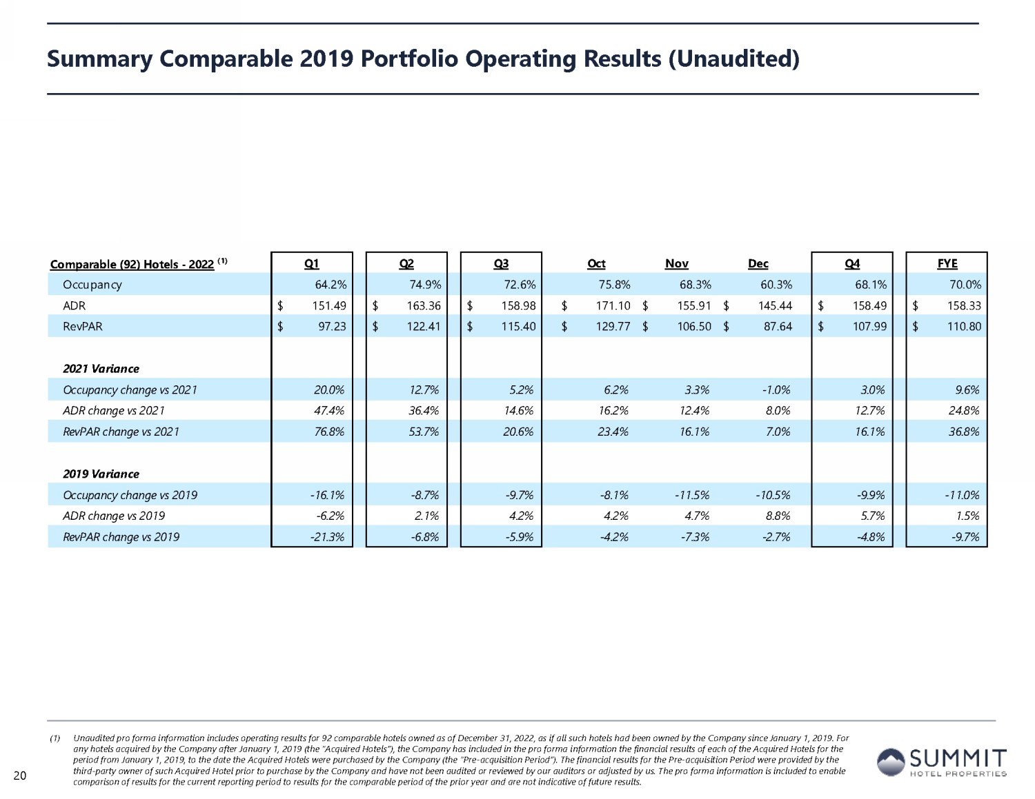 Summary Comparable 2019 Portfolio Operating Results (1) Unaudited pro forma information includes operating results for 92 comparable hotels owned as of December 31, 2022, as if all suc h hotels had been owned by the Company since January 1, 2019. For any hotels acquired by the Company after January 1, 2019 (the “Acquired Hotels”), the Company has included in the pro forma i nfo rmation the financial results of each of the Acquired Hotels for the period from January 1, 2019, to the date the Acquired Hotels were purchased by the Company (the “Pre - acquisition Period”). The f inancial results for the Pre - acquisition Period were provided by the third - party owner of such Acquired Hotel prior to purchase by the Company and have not been audited or reviewed by our auditors or adjusted by us. The pro forma information is included to enable comparison of results for the current reporting period to results for the comparable period of the prior year and are not ind ica tive of future results. Comparable (92) Hotels - 2022 (1) Q1 Q2 Q3 Oct Nov Dec Q4 FYE Occupancy 64.2% 74.9% 72.6% 75.8% 68.3% 60.3% 68.1% 70.0% ADR 151.49$ 163.36$ 158.98$ 171.10$ 155.91$ 145.44$ 158.49$ 158.33$ RevPAR 97.23$ 122.41$ 115.40$ 129.77$ 106.50$ 87.64$ 107.99$ 110.80$ 2021 Variance Occupancy change vs 2021 20.0% 12.7% 5.2% 6.2% 3.3% -1.0% 3.0% 9.6% ADR change vs 2021 47.4% 36.4% 14.6% 16.2% 12.4% 8.0% 12.7% 24.8% RevPAR change vs 2021 76.8% 53.7% 20.6% 23.4% 16.1% 7.0% 16.1% 36.8% 2019 Variance Occupancy change vs 2019 -16.1% -8.7% -9.7% -8.1% -11.5% -10.5% -9.9% -11.0% ADR change vs 2019 -6.2% 2.1% 4.2% 4.2% 4.7% 8.8% 5.7% 1.5% RevPAR change vs 2019 -21.3% -6.8% -5.9% -4.2% -7.3% -2.7% -4.8% -9.7% 20