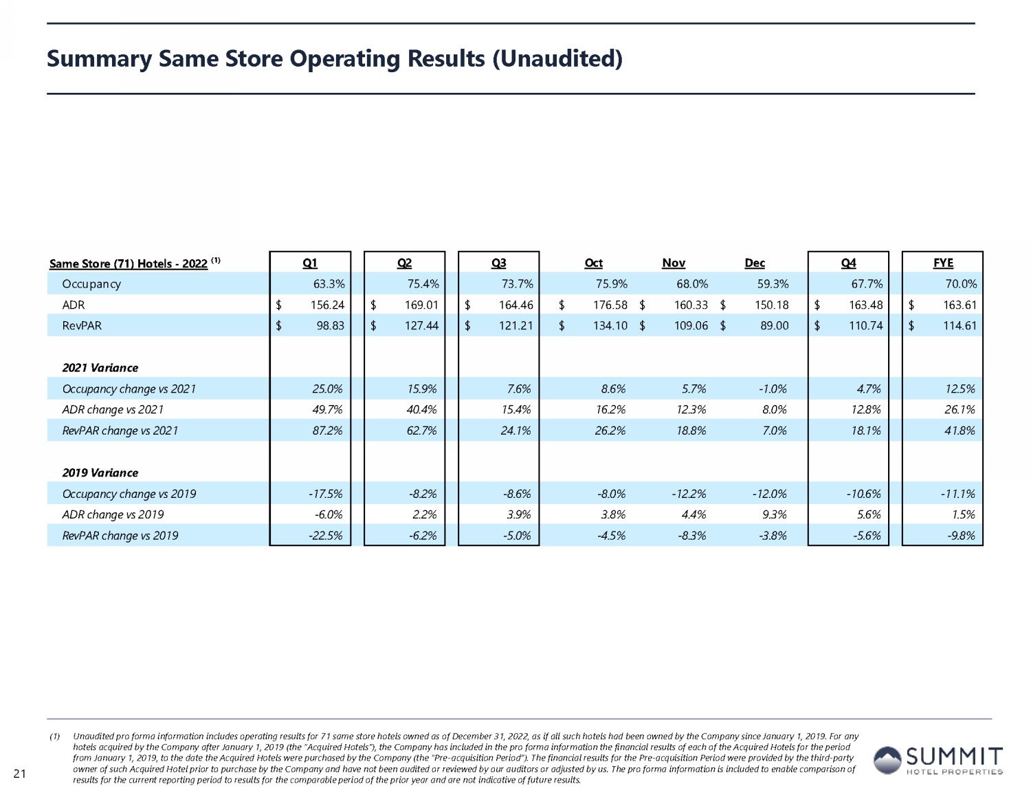 Summary Same Store Operating Results (1) Unaudited pro forma information includes operating results for 71 same store hotels owned as of December 31, 2022, as if all suc h hotels had been owned by the Company since January 1, 2019. For any hotels acquired by the Company after January 1, 2019 (the “Acquired Hotels”), the Company has included in the pro forma infor mat ion the financial results of each of the Acquired Hotels for the period from January 1, 2019, to the date the Acquired Hotels were purchased by the Company (the “Pre - acquisition Period”). The financia l results for the Pre - acquisition Period were provided by the third - party owner of such Acquired Hotel prior to purchase by the Company and have not been audited or reviewed by our auditors or adjust ed by us. The pro forma information is included to enable comparison of results for the current reporting period to results for the comparable period of the prior year and are not indicative of fut ure results. Same Store (71) Hotels - 2022 (1) Q1 Q2 Q3 Oct Nov Dec Q4 FYE Occupancy 64.0% 74.5% 72.2% 75.9% 68.2% 60.4% 68.2% 69.7% ADR 152.30$ 162.57$ 158.61$ 170.65$ 155.35$ 145.88$ 158.26$ 158.15$ RevPAR 97.46$ 121.10$ 114.50$ 129.53$ 106.02$ 88.15$ 107.92$ 110.29$ 2021 Variance Occupancy change vs 2021 20.3% 13.0% 5.1% 6.3% 3.0% -0.6% 3.1% 9.7% ADR change vs 2021 47.6% 36.2% 15.0% 16.9% 12.8% 8.4% 13.3% 25.0% RevPAR change vs 2021 77.6% 53.8% 20.9% 24.3% 16.2% 7.7% 16.7% 37.2% 2019 Variance Occupancy change vs 2019 -16.3% -9.3% -9.2% -7.6% -11.2% -9.7% -9.4% -10.9% ADR change vs 2019 -5.7% 1.6% 3.9% 4.0% 4.7% 9.5% 5.8% 1.5% RevPAR change vs 2019 -21.1% -7.8% -5.6% -3.8% -7.0% -1.2% -4.1% -9.7% 21