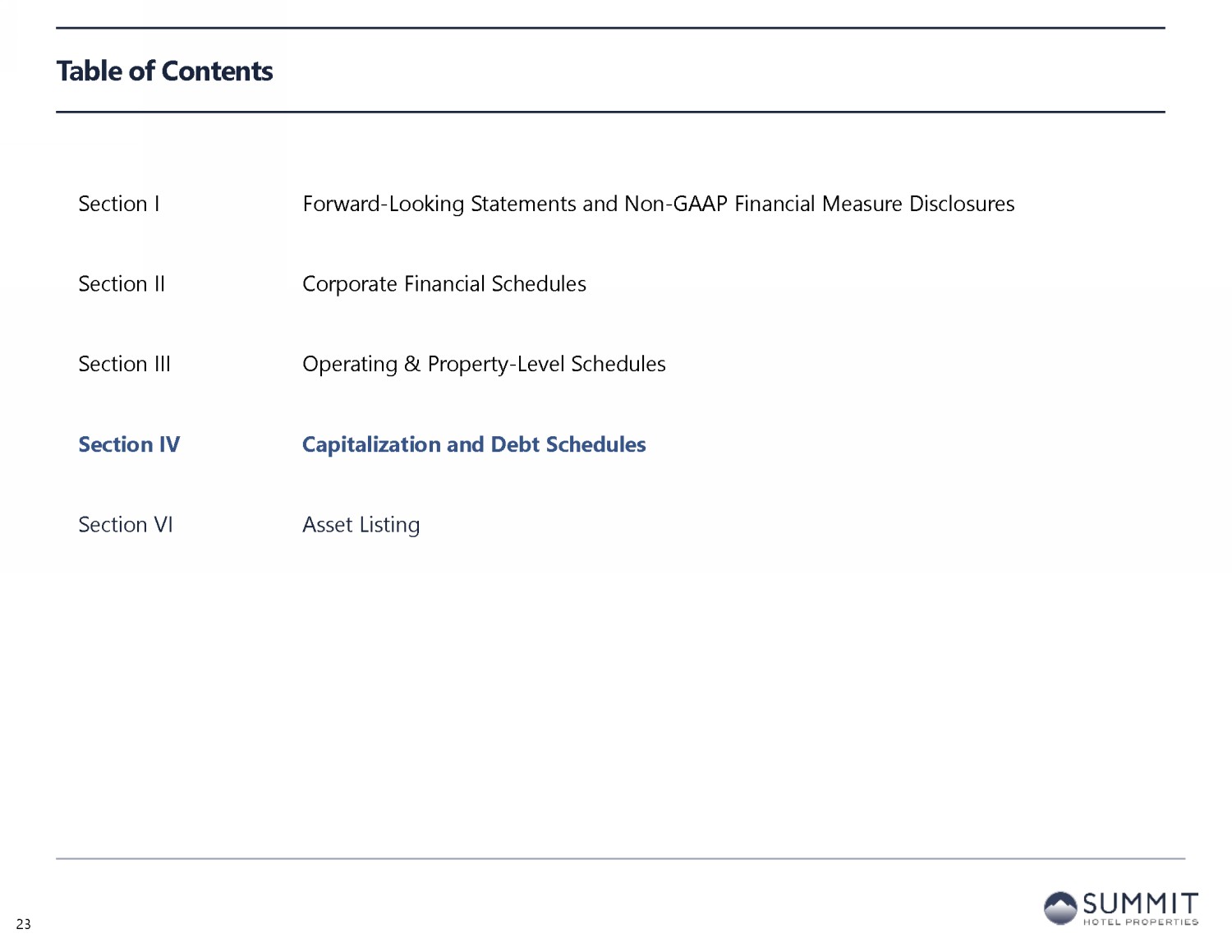 Table of Contents Section I Forward - Looking Statements and Non - GAAP Financial Measure Disclosures Section II Corporate Financial Schedules Section III Operating & Property - Level Schedules Section IV Capitalization and Debt Schedules Section VI Asset Listing 23