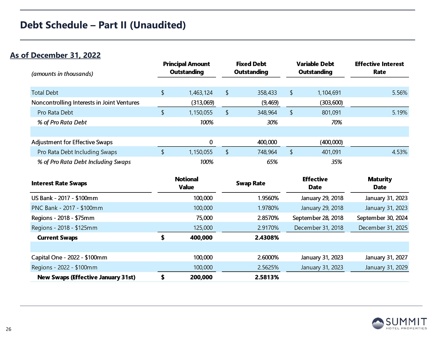 Debt Schedule – Part II As of December 31, 2022 (amounts in thousands) Principal Amount Outstanding Fixed Debt Outstanding Variable Debt Outstanding Effective Interest Rate Total Debt 1,463,124$ 358,433$ 1,104,691$ 5.56% Noncontrolling Interests in Joint Ventures (313,069) (9,469) (303,600) Pro Rata Debt 1,150,055$ 348,964$ 801,091$ 5.19% % of Pro Rata Debt 100% 30% 70% Adjustment for Effective Swaps 0 400,000 (400,000) Pro Rata Debt Including Swaps 1,150,055$ 748,964$ 401,091$ 4.53% % of Pro Rata Debt Including Swaps 100% 65% 35% Interest Rate Swaps Notional Value Swap Rate Effective Date Maturity Date US Bank - 2017 - $100mm 100,000 1.9560% January 29, 2018 January 31, 2023 PNC Bank - 2017 - $100mm 100,000 1.9780% January 29, 2018 January 31, 2023 Regions - 2018 - $75mm 75,000 2.8570% September 28, 2018 September 30, 2024 Regions - 2018 - $125mm 125,000 2.9170% December 31, 2018 December 31, 2025 Current Swaps 400,000$ 2.4308% Capital One - 2022 - $100mm 100,000 2.6000% January 31, 2023 January 31, 2027 Regions - 2022 - $100mm 100,000 2.5625% January 31, 2023 January 31, 2029 New Swaps (Effective January 31st) 200,000$ 1.2906% 26
