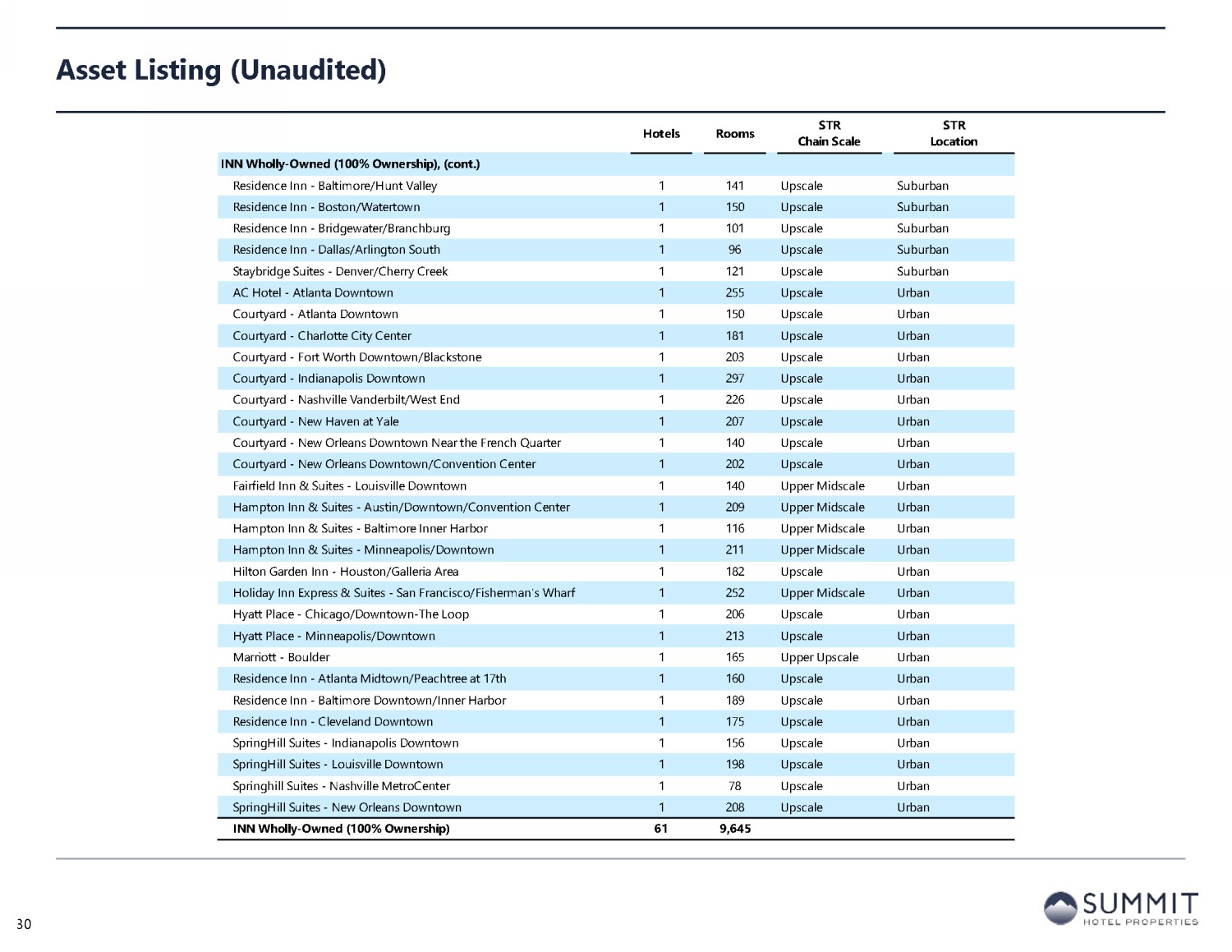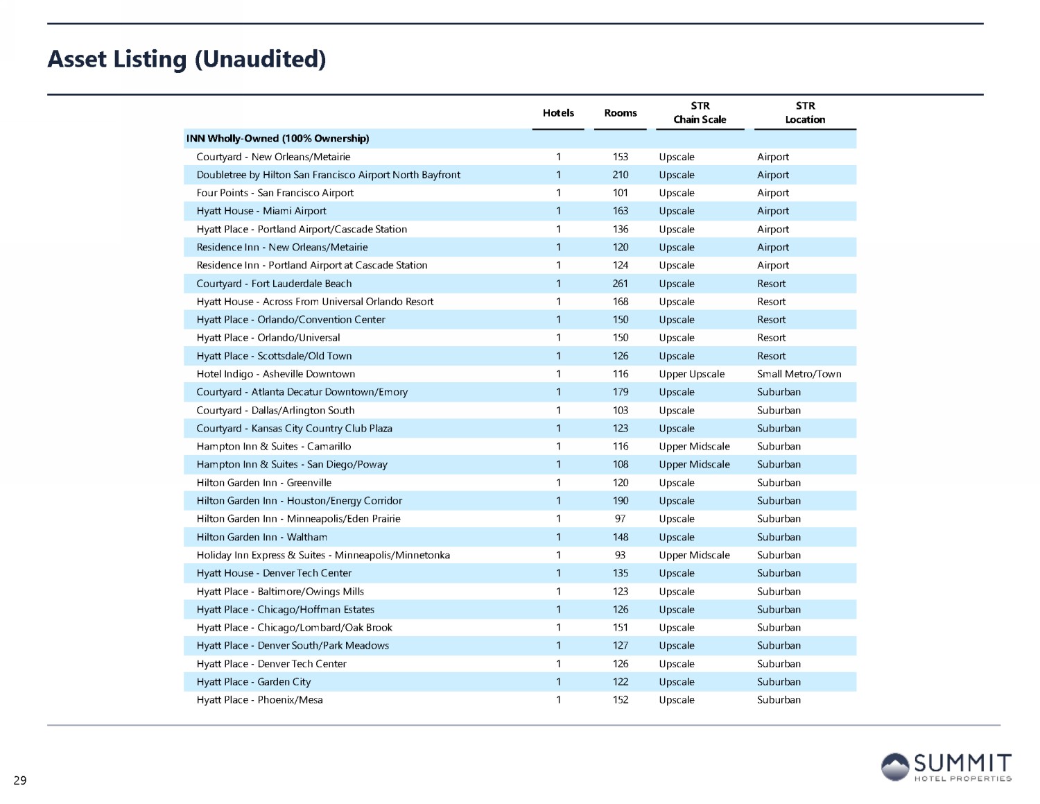 Asset Listing Hotels Rooms STR Chain Scale STR Location INN Wholly-Owned (100% Ownership) Courtyard - New Orleans/Metairie 1 153 Upscale Airport Doubletree by Hilton San Francisco Airport North Bayfront 1 210 Upscale Airport Four Points - San Francisco Airport 1 101 Upscale Airport Hyatt House - Miami Airport 1 163 Upscale Airport Hyatt Place - Portland Airport/Cascade Station 1 136 Upscale Airport Residence Inn - New Orleans/Metairie 1 120 Upscale Airport Residence Inn - Portland Airport at Cascade Station 1 124 Upscale Airport Courtyard - Fort Lauderdale Beach 1 261 Upscale Resort Hyatt House - Across From Universal Orlando Resort 1 168 Upscale Resort Hyatt Place - Orlando/Convention Center 1 150 Upscale Resort Hyatt Place - Orlando/Universal 1 150 Upscale Resort Hyatt Place - Scottsdale/Old Town 1 126 Upscale Resort Hotel Indigo - Asheville Downtown 1 116 Upper Upscale Small Metro/Town Courtyard - Atlanta Decatur Downtown/Emory 1 179 Upscale Suburban Courtyard - Dallas/Arlington South 1 103 Upscale Suburban Courtyard - Kansas City Country Club Plaza 1 123 Upscale Suburban Hampton Inn & Suites - Camarillo 1 116 Upper Midscale Suburban Hampton Inn & Suites - San Diego/Poway 1 108 Upper Midscale Suburban Hilton Garden Inn - Greenville 1 120 Upscale Suburban Hilton Garden Inn - Houston/Energy Corridor 1 190 Upscale Suburban Hilton Garden Inn - Minneapolis/Eden Prairie 1 97 Upscale Suburban Hilton Garden Inn - Waltham 1 148 Upscale Suburban Holiday Inn Express & Suites - Minneapolis/Minnetonka 1 93 Upper Midscale Suburban Hyatt House - Denver Tech Center 1 135 Upscale Suburban Hyatt Place - Baltimore/Owings Mills 1 123 Upscale Suburban Hyatt Place - Chicago/Hoffman Estates 1 126 Upscale Suburban Hyatt Place - Chicago/Lombard/Oak Brook 1 151 Upscale Suburban Hyatt Place - Denver South/Park Meadows 1 127 Upscale Suburban Hyatt Place - Denver Tech Center 1 126 Upscale Suburban Hyatt Place - Garden City 1 122 Upscale Suburban Hyatt Place - Phoenix/Mesa 1 152 Upscale Suburban 29