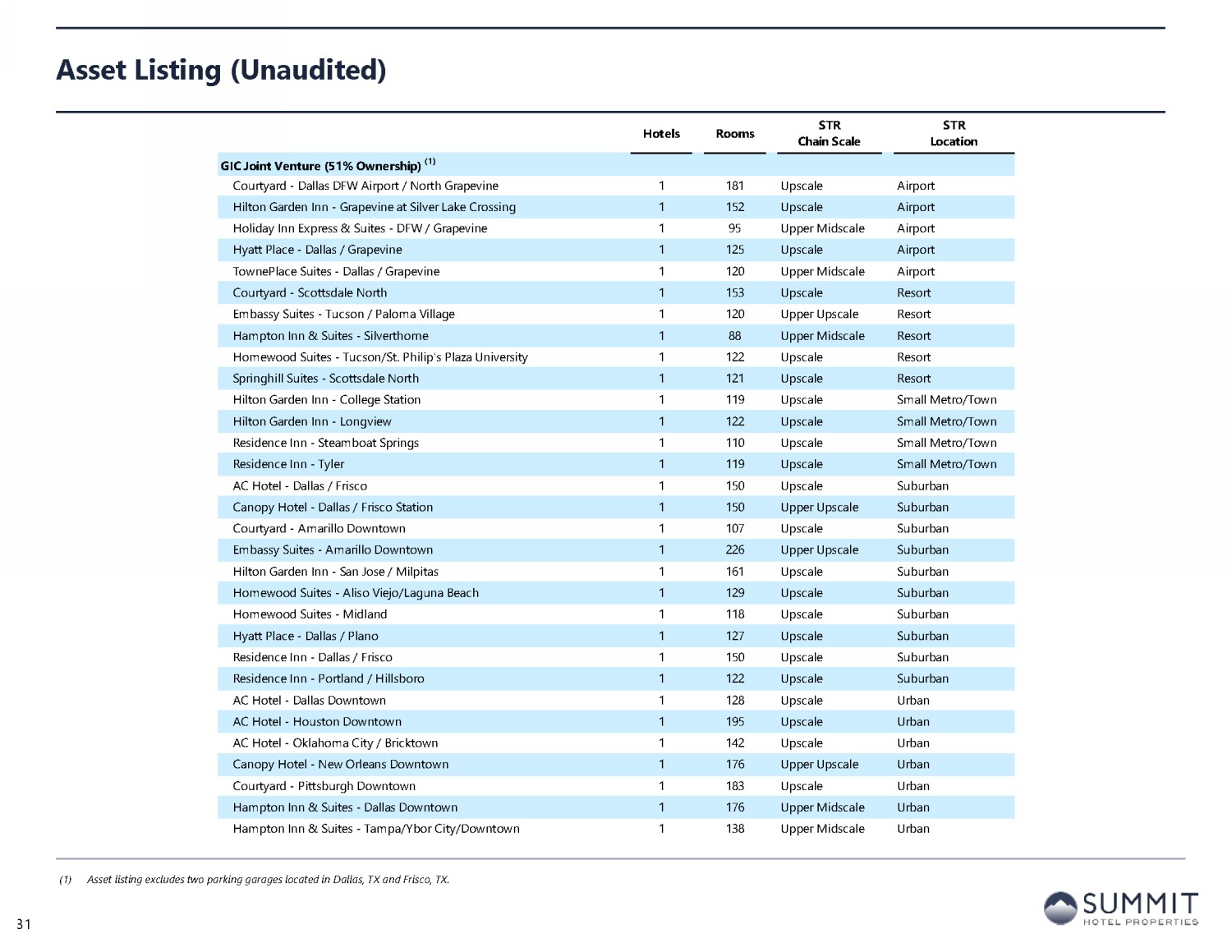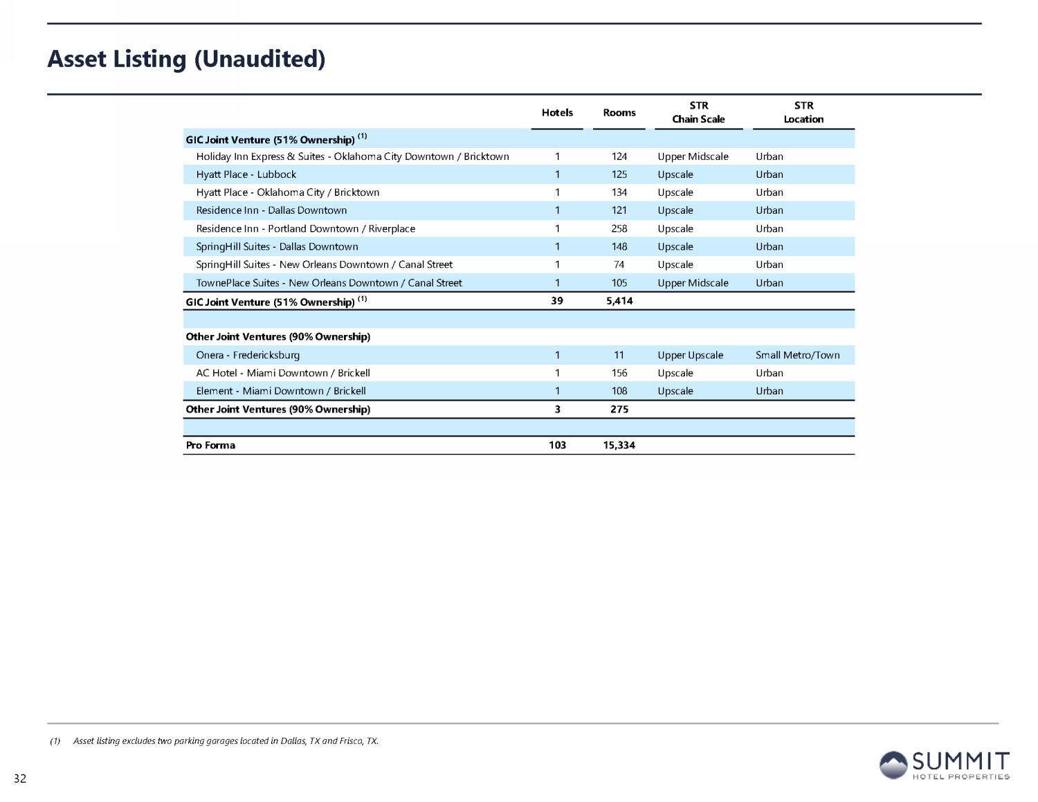 Asset Listing (cont.) (1) Asset listing excludes two parking garages located in Dallas, TX and Frisco, TX. Hotels Rooms STR Chain Scale STR Location GIC Joint Venture (51% Ownership) (1) Holiday Inn Express & Suites - Oklahoma City Downtown / Bricktown 1 124 Upper Midscale Urban Hyatt Place - Lubbock 1 125 Upscale Urban Hyatt Place - Oklahoma City / Bricktown 1 134 Upscale Urban Residence Inn - Dallas Downtown 1 121 Upscale Urban Residence Inn - Portland Downtown / Riverplace 1 258 Upscale Urban SpringHill Suites - Dallas Downtown 1 148 Upscale Urban SpringHill Suites - New Orleans Downtown / Canal Street 1 74 Upscale Urban TownePlace Suites - New Orleans Downtown / Canal Street 1 105 Upper Midscale Urban GIC Joint Venture (51% Ownership) (1) 39 5,414 Other Joint Ventures (90% Ownership) Onera - Fredericksburg 1 11 Upper Upscale Small Metro/Town AC Hotel - Miami Downtown / Brickell 1 156 Upscale Urban Element - Miami Downtown / Brickell 1 108 Upscale Urban Other Joint Ventures (90% Ownership) 3 275 Pro Forma 103 15,334 32
