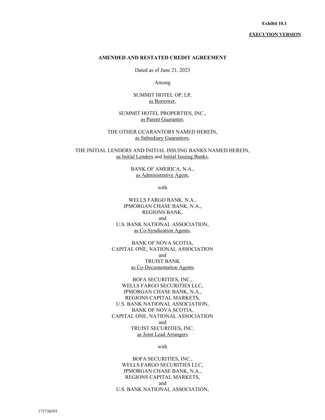 173730593 Exhibit 10.1 EXECUTION VERSION AMENDED AND RESTATED CREDIT AGREEMENT Dated as of June 21, 2023 Among SUMMIT HOTEL OP, LP, as Borrower, SUMMIT HOTEL PROPERTIES, INC., as Parent Guarantor, THE OTHER GUARANTORS NAMED HEREIN, as Subsidiary Guarantors, THE INITIAL LENDERS AND INITIAL ISSUING BANKS NAMED HEREIN, as Initial Lenders and Initial Issuing Banks, BANK OF AMERICA, N.A., as Administrative Agent, with WELLS FARGO BANK, N.A., JPMORGAN CHASE BANK, N.A., REGIONS BANK, and U.S. BANK NATIONAL ASSOCIATION, as Co-Syndication Agents, BANK OF NOVA SCOTIA, CAPITAL ONE, NATIONAL ASSOCIATION and TRUIST BANK as Co-Documentation Agents BOFA SECURITIES, INC., WELLS FARGO SECURITIES LLC, JPMORGAN CHASE BANK, N.A., REGIONS CAPITAL MARKETS, U.S. BANK NATIONAL ASSOCIATION, BANK OF NOVA SCOTIA, CAPITAL ONE, NATIONAL ASSOCIATION and TRUIST SECURITIES, INC. as Joint Lead Arrangers with BOFA SECURITIES, INC., WELLS FARGO SECURITIES LLC, JPMORGAN CHASE BANK, N.A., REGIONS CAPITAL MARKETS, and U.S. BANK NATIONAL ASSOCIATION,