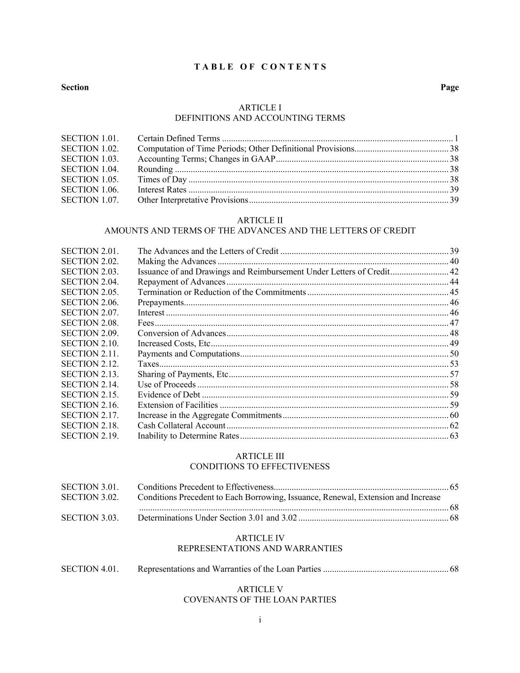 i T A B L E O F C O N T E N T S Section Page ARTICLE I DEFINITIONS AND ACCOUNTING TERMS SECTION 1.01. Certain Defined Terms ....................................................................................................... 1 SECTION 1.02. Computation of Time Periods; Other Definitional Provisions .......................................... 38 SECTION 1.03. Accounting Terms; Changes in GAAP ............................................................................. 38 SECTION 1.04. Rounding .......................................................................................................................... 38 SECTION 1.05. Times of Day .................................................................................................................... 38 SECTION 1.06. Interest Rates .................................................................................................................... 39 SECTION 1.07. Other Interpretative Provisions ......................................................................................... 39 ARTICLE II AMOUNTS AND TERMS OF THE ADVANCES AND THE LETTERS OF CREDIT SECTION 2.01. The Advances and the Letters of Credit ........................................................................... 39 SECTION 2.02. Making the Advances ....................................................................................................... 40 SECTION 2.03. Issuance of and Drawings and Reimbursement Under Letters of Credit .......................... 42 SECTION 2.04. Repayment of Advances ................................................................................................... 44 SECTION 2.05. Termination or Reduction of the Commitments ............................................................... 45 SECTION 2.06. Prepayments ...................................................................................................................... 46 SECTION 2.07. Interest .............................................................................................................................. 46 SECTION 2.08. Fees ................................................................................................................................... 47 SECTION 2.09. Conversion of Advances ................................................................................................... 48 SECTION 2.10. Increased Costs, Etc .......................................................................................................... 49 SECTION 2.11. Payments and Computations ............................................................................................. 50 SECTION 2.12. Taxes ................................................................................................................................. 53 SECTION 2.13. Sharing of Payments, Etc .................................................................................................. 57 SECTION 2.14. Use of Proceeds ................................................................................................................ 58 SECTION 2.15. Evidence of Debt .............................................................................................................. 59 SECTION 2.16. Extension of Facilities ...................................................................................................... 59 SECTION 2.17. Increase in the Aggregate Commitments .......................................................................... 60 SECTION 2.18. Cash Collateral Account ................................................................................................... 62 SECTION 2.19. Inability to Determine Rates ............................................................................................. 63 ARTICLE III CONDITIONS TO EFFECTIVENESS SECTION 3.01. Conditions Precedent to Effectiveness.............................................................................. 65 SECTION 3.02. Conditions Precedent to Each Borrowing, Issuance, Renewal, Extension and Increase .......................................................................................................................................... 68 SECTION 3.03. Determinations Under Section 3.01 and 3.02 ................................................................... 68 ARTICLE IV REPRESENTATIONS AND WARRANTIES SECTION 4.01. Representations and Warranties of the Loan Parties ........................................................ 68 ARTICLE V COVENANTS OF THE LOAN PARTIES