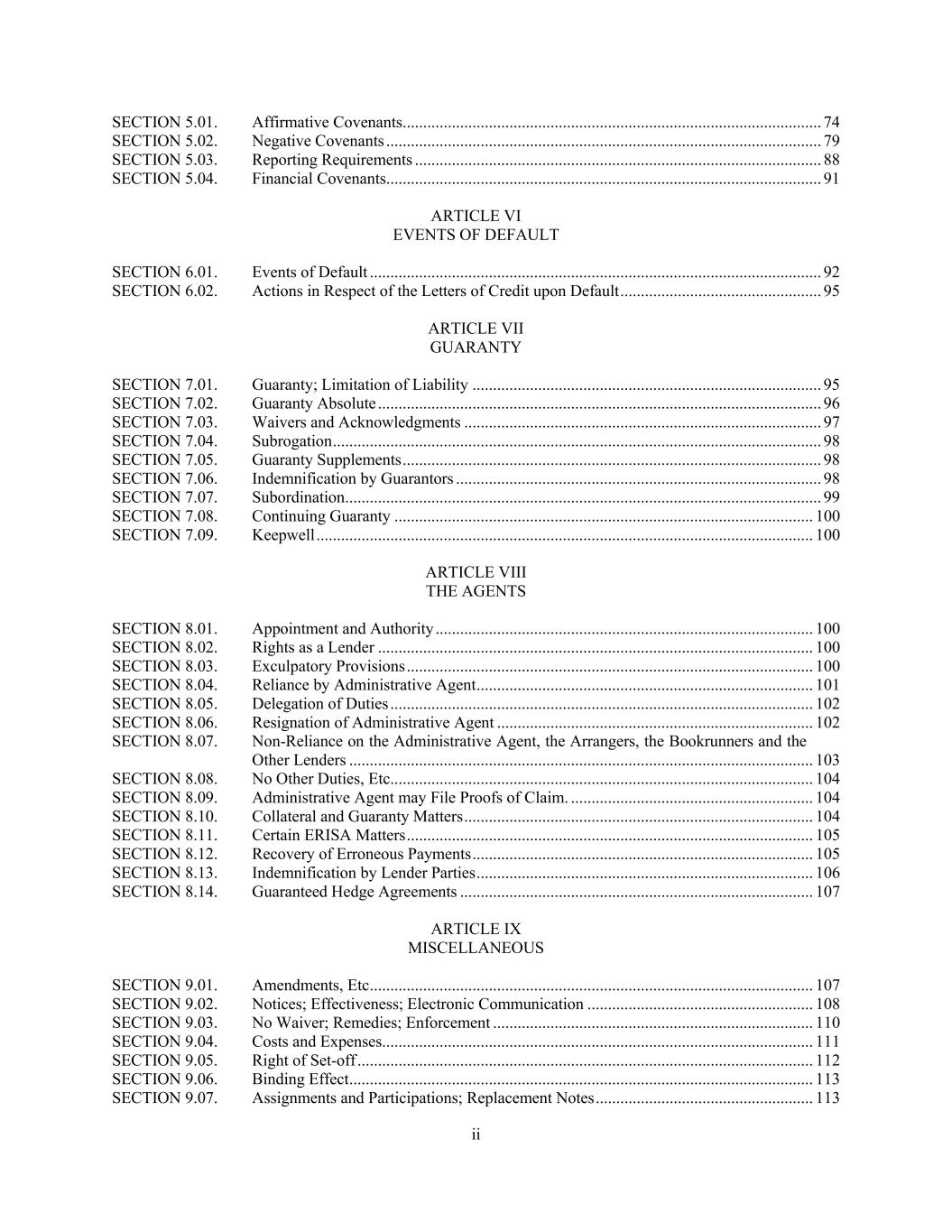 ii SECTION 5.01. Affirmative Covenants ...................................................................................................... 74 SECTION 5.02. Negative Covenants .......................................................................................................... 79 SECTION 5.03. Reporting Requirements ................................................................................................... 88 SECTION 5.04. Financial Covenants .......................................................................................................... 91 ARTICLE VI EVENTS OF DEFAULT SECTION 6.01. Events of Default .............................................................................................................. 92 SECTION 6.02. Actions in Respect of the Letters of Credit upon Default ................................................. 95 ARTICLE VII GUARANTY SECTION 7.01. Guaranty; Limitation of Liability ..................................................................................... 95 SECTION 7.02. Guaranty Absolute ............................................................................................................ 96 SECTION 7.03. Waivers and Acknowledgments ....................................................................................... 97 SECTION 7.04. Subrogation ....................................................................................................................... 98 SECTION 7.05. Guaranty Supplements ...................................................................................................... 98 SECTION 7.06. Indemnification by Guarantors ......................................................................................... 98 SECTION 7.07. Subordination .................................................................................................................... 99 SECTION 7.08. Continuing Guaranty ...................................................................................................... 100 SECTION 7.09. Keepwell ......................................................................................................................... 100 ARTICLE VIII THE AGENTS SECTION 8.01. Appointment and Authority ............................................................................................ 100 SECTION 8.02. Rights as a Lender .......................................................................................................... 100 SECTION 8.03. Exculpatory Provisions ................................................................................................... 100 SECTION 8.04. Reliance by Administrative Agent .................................................................................. 101 SECTION 8.05. Delegation of Duties ....................................................................................................... 102 SECTION 8.06. Resignation of Administrative Agent ............................................................................. 102 SECTION 8.07. Non-Reliance on the Administrative Agent, the Arrangers, the Bookrunners and the Other Lenders ................................................................................................................. 103 SECTION 8.08. No Other Duties, Etc. ...................................................................................................... 104 SECTION 8.09. Administrative Agent may File Proofs of Claim. ........................................................... 104 SECTION 8.10. Collateral and Guaranty Matters ..................................................................................... 104 SECTION 8.11. Certain ERISA Matters ................................................................................................... 105 SECTION 8.12. Recovery of Erroneous Payments ................................................................................... 105 SECTION 8.13. Indemnification by Lender Parties .................................................................................. 106 SECTION 8.14. Guaranteed Hedge Agreements ...................................................................................... 107 ARTICLE IX MISCELLANEOUS SECTION 9.01. Amendments, Etc ............................................................................................................ 107 SECTION 9.02. Notices; Effectiveness; Electronic Communication ....................................................... 108 SECTION 9.03. No Waiver; Remedies; Enforcement .............................................................................. 110 SECTION 9.04. Costs and Expenses ......................................................................................................... 111 SECTION 9.05. Right of Set-off ............................................................................................................... 112 SECTION 9.06. Binding Effect ................................................................................................................. 113 SECTION 9.07. Assignments and Participations; Replacement Notes ..................................................... 113