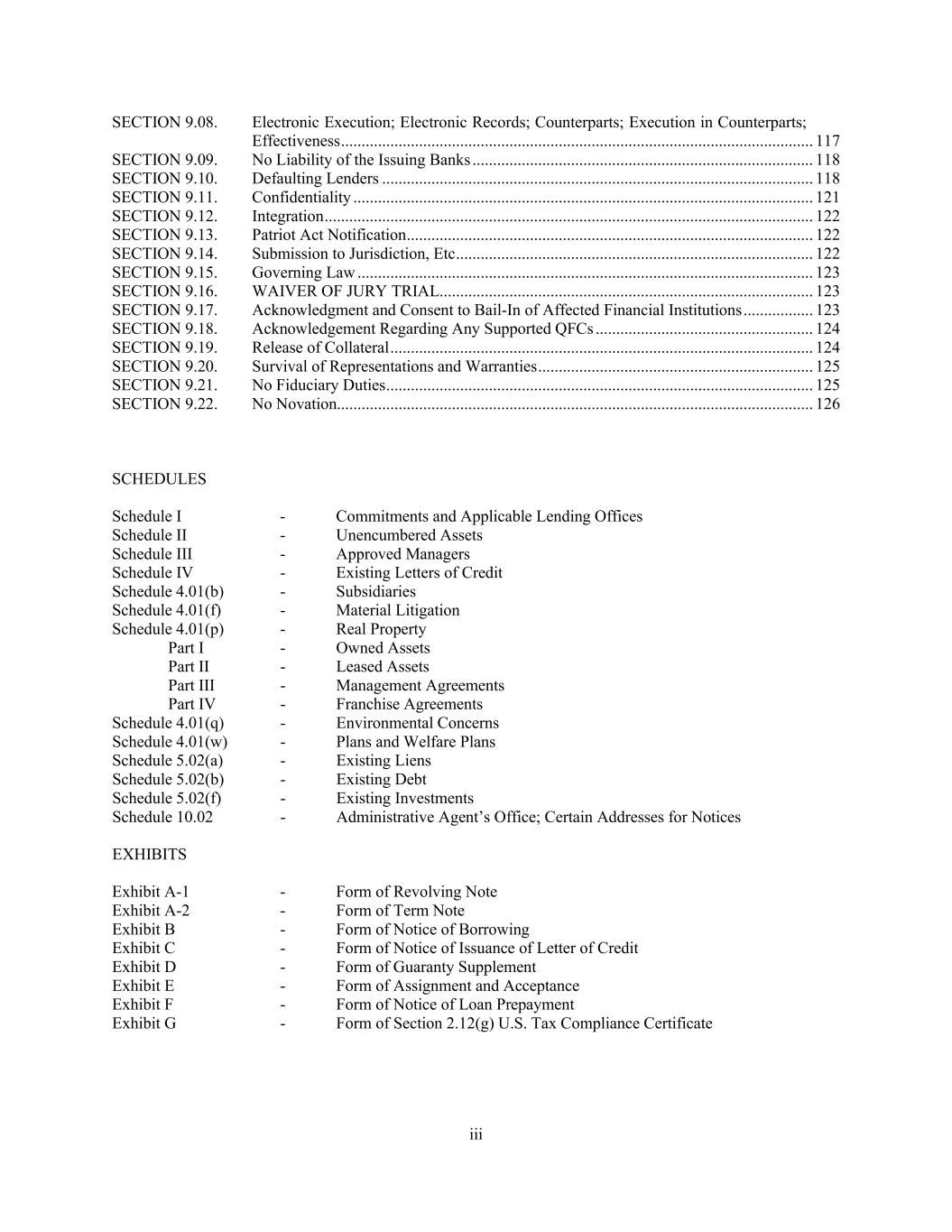 iii SECTION 9.08. Electronic Execution; Electronic Records; Counterparts; Execution in Counterparts; Effectiveness ................................................................................................................... 117 SECTION 9.09. No Liability of the Issuing Banks ................................................................................... 118 SECTION 9.10. Defaulting Lenders ......................................................................................................... 118 SECTION 9.11. Confidentiality ................................................................................................................ 121 SECTION 9.12. Integration ....................................................................................................................... 122 SECTION 9.13. Patriot Act Notification ................................................................................................... 122 SECTION 9.14. Submission to Jurisdiction, Etc ....................................................................................... 122 SECTION 9.15. Governing Law ............................................................................................................... 123 SECTION 9.16. WAIVER OF JURY TRIAL........................................................................................... 123 SECTION 9.17. Acknowledgment and Consent to Bail-In of Affected Financial Institutions ................. 123 SECTION 9.18. Acknowledgement Regarding Any Supported QFCs ..................................................... 124 SECTION 9.19. Release of Collateral ....................................................................................................... 124 SECTION 9.20. Survival of Representations and Warranties ................................................................... 125 SECTION 9.21. No Fiduciary Duties ........................................................................................................ 125 SECTION 9.22. No Novation.................................................................................................................... 126 SCHEDULES Schedule I - Commitments and Applicable Lending Offices Schedule II - Unencumbered Assets Schedule III - Approved Managers Schedule IV - Existing Letters of Credit Schedule 4.01(b) - Subsidiaries Schedule 4.01(f) - Material Litigation Schedule 4.01(p) - Real Property Part I - Owned Assets Part II - Leased Assets Part III - Management Agreements Part IV - Franchise Agreements Schedule 4.01(q) - Environmental Concerns Schedule 4.01(w) - Plans and Welfare Plans Schedule 5.02(a) - Existing Liens Schedule 5.02(b) - Existing Debt Schedule 5.02(f) - Existing Investments Schedule 10.02 - Administrative Agent’s Office; Certain Addresses for Notices EXHIBITS Exhibit A-1 - Form of Revolving Note Exhibit A-2 - Form of Term Note Exhibit B - Form of Notice of Borrowing Exhibit C - Form of Notice of Issuance of Letter of Credit Exhibit D - Form of Guaranty Supplement Exhibit E - Form of Assignment and Acceptance Exhibit F - Form of Notice of Loan Prepayment Exhibit G - Form of Section 2.12(g) U.S. Tax Compliance Certificate
