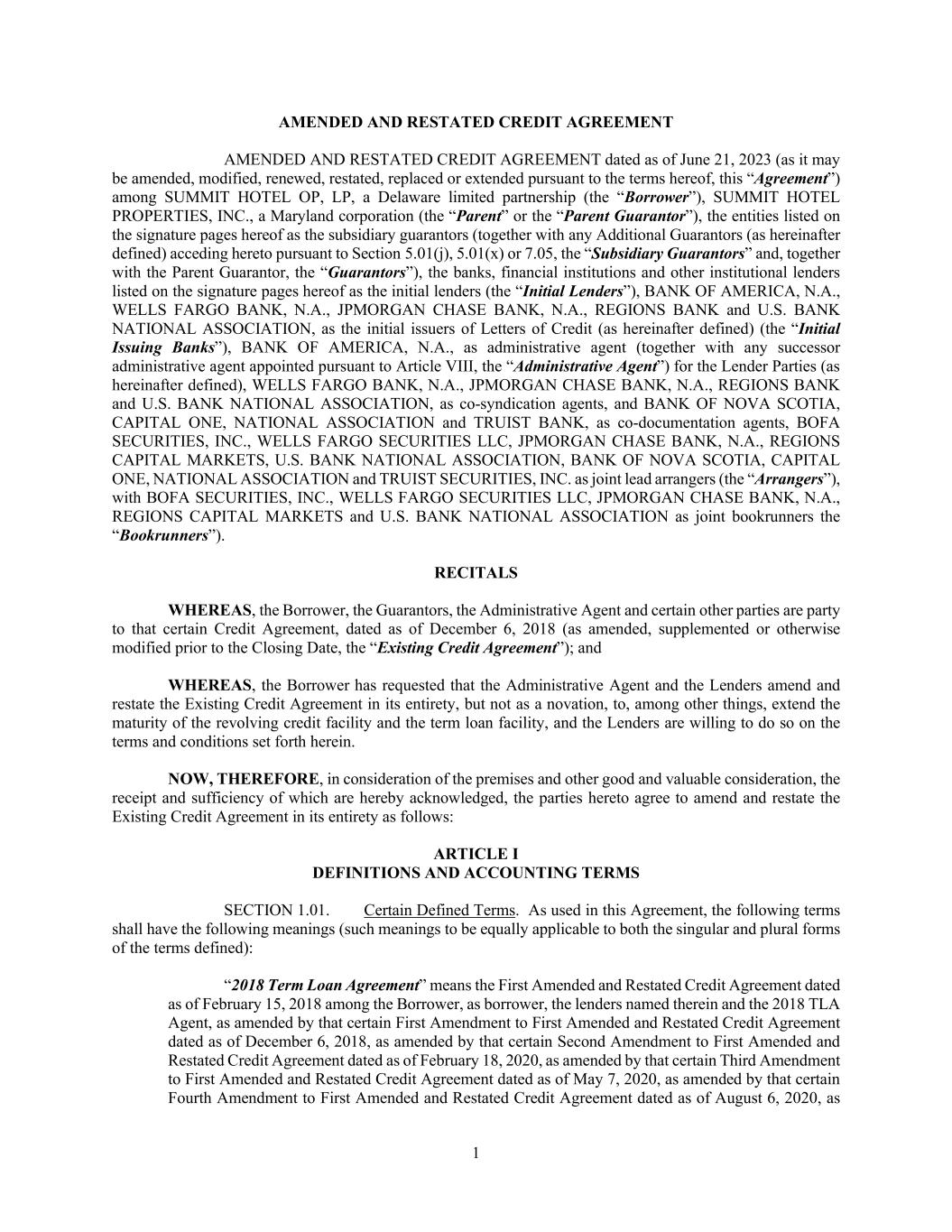 1 AMENDED AND RESTATED CREDIT AGREEMENT AMENDED AND RESTATED CREDIT AGREEMENT dated as of June 21, 2023 (as it may be amended, modified, renewed, restated, replaced or extended pursuant to the terms hereof, this “Agreement”) among SUMMIT HOTEL OP, LP, a Delaware limited partnership (the “Borrower”), SUMMIT HOTEL PROPERTIES, INC., a Maryland corporation (the “Parent” or the “Parent Guarantor”), the entities listed on the signature pages hereof as the subsidiary guarantors (together with any Additional Guarantors (as hereinafter defined) acceding hereto pursuant to Section 5.01(j), 5.01(x) or 7.05, the “Subsidiary Guarantors” and, together with the Parent Guarantor, the “Guarantors”), the banks, financial institutions and other institutional lenders listed on the signature pages hereof as the initial lenders (the “Initial Lenders”), BANK OF AMERICA, N.A., WELLS FARGO BANK, N.A., JPMORGAN CHASE BANK, N.A., REGIONS BANK and U.S. BANK NATIONAL ASSOCIATION, as the initial issuers of Letters of Credit (as hereinafter defined) (the “Initial Issuing Banks”), BANK OF AMERICA, N.A., as administrative agent (together with any successor administrative agent appointed pursuant to Article VIII, the “Administrative Agent”) for the Lender Parties (as hereinafter defined), WELLS FARGO BANK, N.A., JPMORGAN CHASE BANK, N.A., REGIONS BANK and U.S. BANK NATIONAL ASSOCIATION, as co-syndication agents, and BANK OF NOVA SCOTIA, CAPITAL ONE, NATIONAL ASSOCIATION and TRUIST BANK, as co-documentation agents, BOFA SECURITIES, INC., WELLS FARGO SECURITIES LLC, JPMORGAN CHASE BANK, N.A., REGIONS CAPITAL MARKETS, U.S. BANK NATIONAL ASSOCIATION, BANK OF NOVA SCOTIA, CAPITAL ONE, NATIONAL ASSOCIATION and TRUIST SECURITIES, INC. as joint lead arrangers (the “Arrangers”), with BOFA SECURITIES, INC., WELLS FARGO SECURITIES LLC, JPMORGAN CHASE BANK, N.A., REGIONS CAPITAL MARKETS and U.S. BANK NATIONAL ASSOCIATION as joint bookrunners the “Bookrunners”). RECITALS WHEREAS, the Borrower, the Guarantors, the Administrative Agent and certain other parties are party to that certain Credit Agreement, dated as of December 6, 2018 (as amended, supplemented or otherwise modified prior to the Closing Date, the “Existing Credit Agreement”); and WHEREAS, the Borrower has requested that the Administrative Agent and the Lenders amend and restate the Existing Credit Agreement in its entirety, but not as a novation, to, among other things, extend the maturity of the revolving credit facility and the term loan facility, and the Lenders are willing to do so on the terms and conditions set forth herein. NOW, THEREFORE, in consideration of the premises and other good and valuable consideration, the receipt and sufficiency of which are hereby acknowledged, the parties hereto agree to amend and restate the Existing Credit Agreement in its entirety as follows: ARTICLE I DEFINITIONS AND ACCOUNTING TERMS SECTION 1.01. Certain Defined Terms. As used in this Agreement, the following terms shall have the following meanings (such meanings to be equally applicable to both the singular and plural forms of the terms defined): “2018 Term Loan Agreement” means the First Amended and Restated Credit Agreement dated as of February 15, 2018 among the Borrower, as borrower, the lenders named therein and the 2018 TLA Agent, as amended by that certain First Amendment to First Amended and Restated Credit Agreement dated as of December 6, 2018, as amended by that certain Second Amendment to First Amended and Restated Credit Agreement dated as of February 18, 2020, as amended by that certain Third Amendment to First Amended and Restated Credit Agreement dated as of May 7, 2020, as amended by that certain Fourth Amendment to First Amended and Restated Credit Agreement dated as of August 6, 2020, as