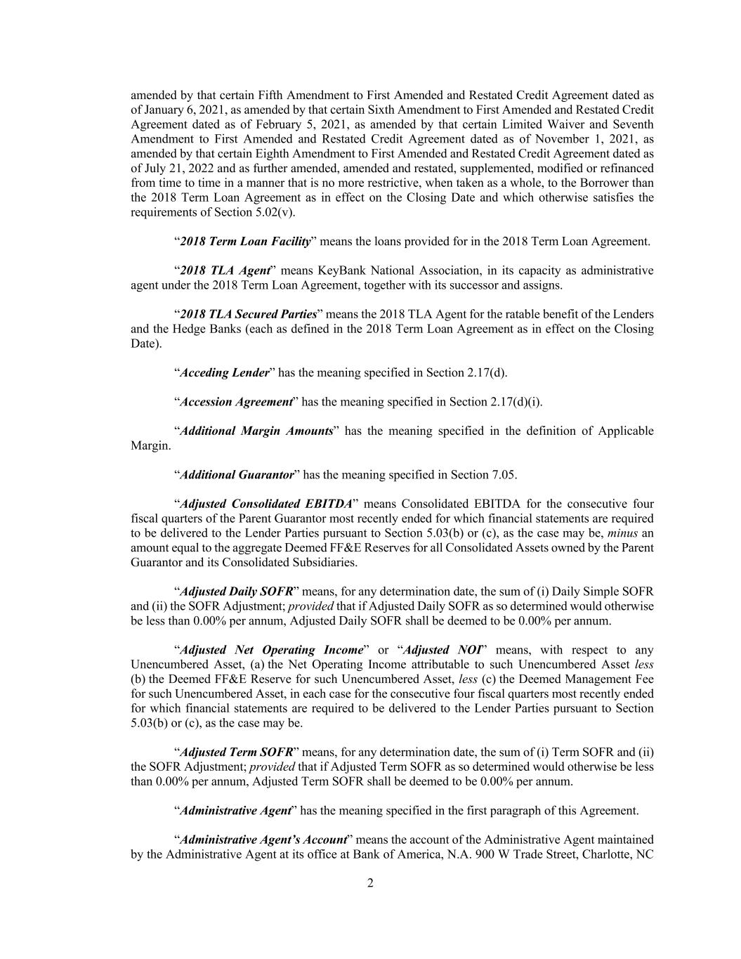 2 amended by that certain Fifth Amendment to First Amended and Restated Credit Agreement dated as of January 6, 2021, as amended by that certain Sixth Amendment to First Amended and Restated Credit Agreement dated as of February 5, 2021, as amended by that certain Limited Waiver and Seventh Amendment to First Amended and Restated Credit Agreement dated as of November 1, 2021, as amended by that certain Eighth Amendment to First Amended and Restated Credit Agreement dated as of July 21, 2022 and as further amended, amended and restated, supplemented, modified or refinanced from time to time in a manner that is no more restrictive, when taken as a whole, to the Borrower than the 2018 Term Loan Agreement as in effect on the Closing Date and which otherwise satisfies the requirements of Section 5.02(v). “2018 Term Loan Facility” means the loans provided for in the 2018 Term Loan Agreement. “2018 TLA Agent” means KeyBank National Association, in its capacity as administrative agent under the 2018 Term Loan Agreement, together with its successor and assigns. “2018 TLA Secured Parties” means the 2018 TLA Agent for the ratable benefit of the Lenders and the Hedge Banks (each as defined in the 2018 Term Loan Agreement as in effect on the Closing Date). “Acceding Lender” has the meaning specified in Section 2.17(d). “Accession Agreement” has the meaning specified in Section 2.17(d)(i). “Additional Margin Amounts” has the meaning specified in the definition of Applicable Margin. “Additional Guarantor” has the meaning specified in Section 7.05. “Adjusted Consolidated EBITDA” means Consolidated EBITDA for the consecutive four fiscal quarters of the Parent Guarantor most recently ended for which financial statements are required to be delivered to the Lender Parties pursuant to Section 5.03(b) or (c), as the case may be, minus an amount equal to the aggregate Deemed FF&E Reserves for all Consolidated Assets owned by the Parent Guarantor and its Consolidated Subsidiaries. “Adjusted Daily SOFR” means, for any determination date, the sum of (i) Daily Simple SOFR and (ii) the SOFR Adjustment; provided that if Adjusted Daily SOFR as so determined would otherwise be less than 0.00% per annum, Adjusted Daily SOFR shall be deemed to be 0.00% per annum. “Adjusted Net Operating Income” or “Adjusted NOI” means, with respect to any Unencumbered Asset, (a) the Net Operating Income attributable to such Unencumbered Asset less (b) the Deemed FF&E Reserve for such Unencumbered Asset, less (c) the Deemed Management Fee for such Unencumbered Asset, in each case for the consecutive four fiscal quarters most recently ended for which financial statements are required to be delivered to the Lender Parties pursuant to Section 5.03(b) or (c), as the case may be. “Adjusted Term SOFR” means, for any determination date, the sum of (i) Term SOFR and (ii) the SOFR Adjustment; provided that if Adjusted Term SOFR as so determined would otherwise be less than 0.00% per annum, Adjusted Term SOFR shall be deemed to be 0.00% per annum. “Administrative Agent” has the meaning specified in the first paragraph of this Agreement. “Administrative Agent’s Account” means the account of the Administrative Agent maintained by the Administrative Agent at its office at Bank of America, N.A. 900 W Trade Street, Charlotte, NC