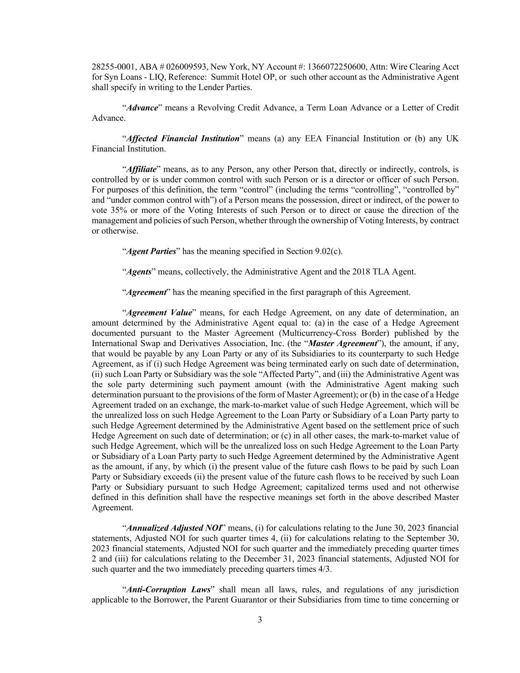 3 28255-0001, ABA # 026009593, New York, NY Account #: 1366072250600, Attn: Wire Clearing Acct for Syn Loans - LIQ, Reference: Summit Hotel OP, or such other account as the Administrative Agent shall specify in writing to the Lender Parties. “Advance” means a Revolving Credit Advance, a Term Loan Advance or a Letter of Credit Advance. “Affected Financial Institution” means (a) any EEA Financial Institution or (b) any UK Financial Institution. “Affiliate” means, as to any Person, any other Person that, directly or indirectly, controls, is controlled by or is under common control with such Person or is a director or officer of such Person. For purposes of this definition, the term “control” (including the terms “controlling”, “controlled by” and “under common control with”) of a Person means the possession, direct or indirect, of the power to vote 35% or more of the Voting Interests of such Person or to direct or cause the direction of the management and policies of such Person, whether through the ownership of Voting Interests, by contract or otherwise. “Agent Parties” has the meaning specified in Section 9.02(c). “Agents” means, collectively, the Administrative Agent and the 2018 TLA Agent. “Agreement” has the meaning specified in the first paragraph of this Agreement. “Agreement Value” means, for each Hedge Agreement, on any date of determination, an amount determined by the Administrative Agent equal to: (a) in the case of a Hedge Agreement documented pursuant to the Master Agreement (Multicurrency-Cross Border) published by the International Swap and Derivatives Association, Inc. (the “Master Agreement”), the amount, if any, that would be payable by any Loan Party or any of its Subsidiaries to its counterparty to such Hedge Agreement, as if (i) such Hedge Agreement was being terminated early on such date of determination, (ii) such Loan Party or Subsidiary was the sole “Affected Party”, and (iii) the Administrative Agent was the sole party determining such payment amount (with the Administrative Agent making such determination pursuant to the provisions of the form of Master Agreement); or (b) in the case of a Hedge Agreement traded on an exchange, the mark-to-market value of such Hedge Agreement, which will be the unrealized loss on such Hedge Agreement to the Loan Party or Subsidiary of a Loan Party party to such Hedge Agreement determined by the Administrative Agent based on the settlement price of such Hedge Agreement on such date of determination; or (c) in all other cases, the mark-to-market value of such Hedge Agreement, which will be the unrealized loss on such Hedge Agreement to the Loan Party or Subsidiary of a Loan Party party to such Hedge Agreement determined by the Administrative Agent as the amount, if any, by which (i) the present value of the future cash flows to be paid by such Loan Party or Subsidiary exceeds (ii) the present value of the future cash flows to be received by such Loan Party or Subsidiary pursuant to such Hedge Agreement; capitalized terms used and not otherwise defined in this definition shall have the respective meanings set forth in the above described Master Agreement. “Annualized Adjusted NOI” means, (i) for calculations relating to the June 30, 2023 financial statements, Adjusted NOI for such quarter times 4, (ii) for calculations relating to the September 30, 2023 financial statements, Adjusted NOI for such quarter and the immediately preceding quarter times 2 and (iii) for calculations relating to the December 31, 2023 financial statements, Adjusted NOI for such quarter and the two immediately preceding quarters times 4/3. “Anti-Corruption Laws” shall mean all laws, rules, and regulations of any jurisdiction applicable to the Borrower, the Parent Guarantor or their Subsidiaries from time to time concerning or