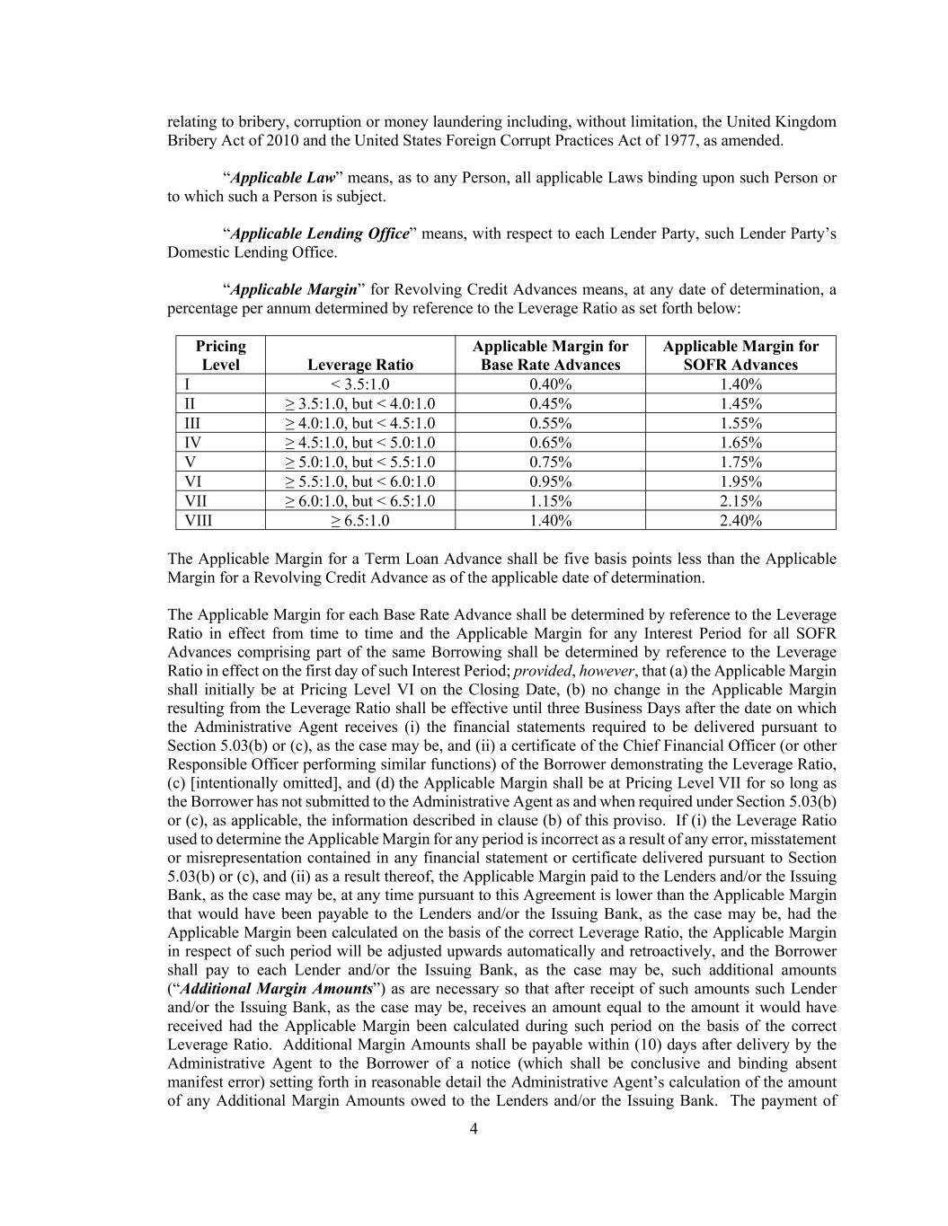 4 relating to bribery, corruption or money laundering including, without limitation, the United Kingdom Bribery Act of 2010 and the United States Foreign Corrupt Practices Act of 1977, as amended. “Applicable Law” means, as to any Person, all applicable Laws binding upon such Person or to which such a Person is subject. “Applicable Lending Office” means, with respect to each Lender Party, such Lender Party’s Domestic Lending Office. “Applicable Margin” for Revolving Credit Advances means, at any date of determination, a percentage per annum determined by reference to the Leverage Ratio as set forth below: Pricing Level Leverage Ratio Applicable Margin for Base Rate Advances Applicable Margin for SOFR Advances I < 3.5:1.0 0.40% 1.40% II ≥ 3.5:1.0, but < 4.0:1.0 0.45% 1.45% III ≥ 4.0:1.0, but < 4.5:1.0 0.55% 1.55% IV ≥ 4.5:1.0, but < 5.0:1.0 0.65% 1.65% V ≥ 5.0:1.0, but < 5.5:1.0 0.75% 1.75% VI ≥ 5.5:1.0, but < 6.0:1.0 0.95% 1.95% VII ≥ 6.0:1.0, but < 6.5:1.0 1.15% 2.15% VIII ≥ 6.5:1.0 1.40% 2.40% The Applicable Margin for a Term Loan Advance shall be five basis points less than the Applicable Margin for a Revolving Credit Advance as of the applicable date of determination. The Applicable Margin for each Base Rate Advance shall be determined by reference to the Leverage Ratio in effect from time to time and the Applicable Margin for any Interest Period for all SOFR Advances comprising part of the same Borrowing shall be determined by reference to the Leverage Ratio in effect on the first day of such Interest Period; provided, however, that (a) the Applicable Margin shall initially be at Pricing Level VI on the Closing Date, (b) no change in the Applicable Margin resulting from the Leverage Ratio shall be effective until three Business Days after the date on which the Administrative Agent receives (i) the financial statements required to be delivered pursuant to Section 5.03(b) or (c), as the case may be, and (ii) a certificate of the Chief Financial Officer (or other Responsible Officer performing similar functions) of the Borrower demonstrating the Leverage Ratio, (c) [intentionally omitted], and (d) the Applicable Margin shall be at Pricing Level VII for so long as the Borrower has not submitted to the Administrative Agent as and when required under Section 5.03(b) or (c), as applicable, the information described in clause (b) of this proviso. If (i) the Leverage Ratio used to determine the Applicable Margin for any period is incorrect as a result of any error, misstatement or misrepresentation contained in any financial statement or certificate delivered pursuant to Section 5.03(b) or (c), and (ii) as a result thereof, the Applicable Margin paid to the Lenders and/or the Issuing Bank, as the case may be, at any time pursuant to this Agreement is lower than the Applicable Margin that would have been payable to the Lenders and/or the Issuing Bank, as the case may be, had the Applicable Margin been calculated on the basis of the correct Leverage Ratio, the Applicable Margin in respect of such period will be adjusted upwards automatically and retroactively, and the Borrower shall pay to each Lender and/or the Issuing Bank, as the case may be, such additional amounts (“Additional Margin Amounts”) as are necessary so that after receipt of such amounts such Lender and/or the Issuing Bank, as the case may be, receives an amount equal to the amount it would have received had the Applicable Margin been calculated during such period on the basis of the correct Leverage Ratio. Additional Margin Amounts shall be payable within (10) days after delivery by the Administrative Agent to the Borrower of a notice (which shall be conclusive and binding absent manifest error) setting forth in reasonable detail the Administrative Agent’s calculation of the amount of any Additional Margin Amounts owed to the Lenders and/or the Issuing Bank. The payment of
