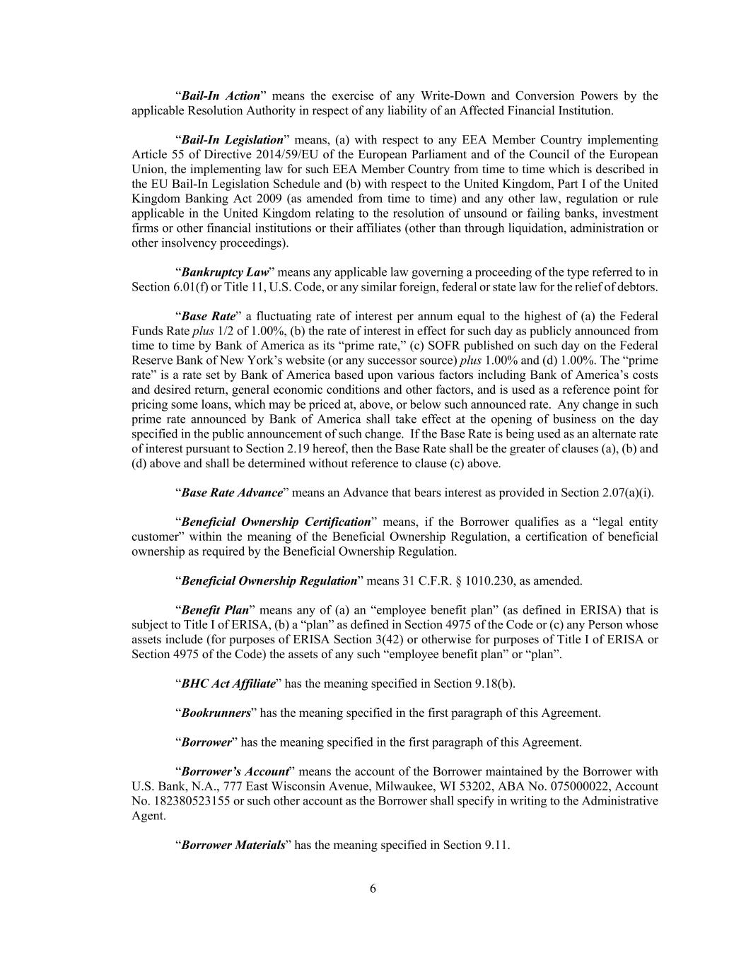 6 “Bail-In Action” means the exercise of any Write-Down and Conversion Powers by the applicable Resolution Authority in respect of any liability of an Affected Financial Institution. “Bail-In Legislation” means, (a) with respect to any EEA Member Country implementing Article 55 of Directive 2014/59/EU of the European Parliament and of the Council of the European Union, the implementing law for such EEA Member Country from time to time which is described in the EU Bail-In Legislation Schedule and (b) with respect to the United Kingdom, Part I of the United Kingdom Banking Act 2009 (as amended from time to time) and any other law, regulation or rule applicable in the United Kingdom relating to the resolution of unsound or failing banks, investment firms or other financial institutions or their affiliates (other than through liquidation, administration or other insolvency proceedings). “Bankruptcy Law” means any applicable law governing a proceeding of the type referred to in Section 6.01(f) or Title 11, U.S. Code, or any similar foreign, federal or state law for the relief of debtors. “Base Rate” a fluctuating rate of interest per annum equal to the highest of (a) the Federal Funds Rate plus 1/2 of 1.00%, (b) the rate of interest in effect for such day as publicly announced from time to time by Bank of America as its “prime rate,” (c) SOFR published on such day on the Federal Reserve Bank of New York’s website (or any successor source) plus 1.00% and (d) 1.00%. The “prime rate” is a rate set by Bank of America based upon various factors including Bank of America’s costs and desired return, general economic conditions and other factors, and is used as a reference point for pricing some loans, which may be priced at, above, or below such announced rate. Any change in such prime rate announced by Bank of America shall take effect at the opening of business on the day specified in the public announcement of such change. If the Base Rate is being used as an alternate rate of interest pursuant to Section 2.19 hereof, then the Base Rate shall be the greater of clauses (a), (b) and (d) above and shall be determined without reference to clause (c) above. “Base Rate Advance” means an Advance that bears interest as provided in Section 2.07(a)(i). “Beneficial Ownership Certification” means, if the Borrower qualifies as a “legal entity customer” within the meaning of the Beneficial Ownership Regulation, a certification of beneficial ownership as required by the Beneficial Ownership Regulation. “Beneficial Ownership Regulation” means 31 C.F.R. § 1010.230, as amended. “Benefit Plan” means any of (a) an “employee benefit plan” (as defined in ERISA) that is subject to Title I of ERISA, (b) a “plan” as defined in Section 4975 of the Code or (c) any Person whose assets include (for purposes of ERISA Section 3(42) or otherwise for purposes of Title I of ERISA or Section 4975 of the Code) the assets of any such “employee benefit plan” or “plan”. “BHC Act Affiliate” has the meaning specified in Section 9.18(b). “Bookrunners” has the meaning specified in the first paragraph of this Agreement. “Borrower” has the meaning specified in the first paragraph of this Agreement. “Borrower’s Account” means the account of the Borrower maintained by the Borrower with U.S. Bank, N.A., 777 East Wisconsin Avenue, Milwaukee, WI 53202, ABA No. 075000022, Account No. 182380523155 or such other account as the Borrower shall specify in writing to the Administrative Agent. “Borrower Materials” has the meaning specified in Section 9.11.