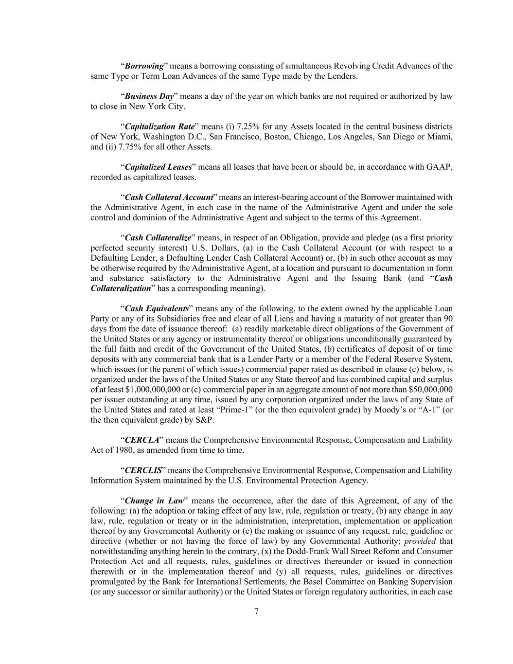 7 “Borrowing” means a borrowing consisting of simultaneous Revolving Credit Advances of the same Type or Term Loan Advances of the same Type made by the Lenders. “Business Day” means a day of the year on which banks are not required or authorized by law to close in New York City. “Capitalization Rate” means (i) 7.25% for any Assets located in the central business districts of New York, Washington D.C., San Francisco, Boston, Chicago, Los Angeles, San Diego or Miami, and (ii) 7.75% for all other Assets. “Capitalized Leases” means all leases that have been or should be, in accordance with GAAP, recorded as capitalized leases. “Cash Collateral Account” means an interest-bearing account of the Borrower maintained with the Administrative Agent, in each case in the name of the Administrative Agent and under the sole control and dominion of the Administrative Agent and subject to the terms of this Agreement. “Cash Collateralize” means, in respect of an Obligation, provide and pledge (as a first priority perfected security interest) U.S. Dollars, (a) in the Cash Collateral Account (or with respect to a Defaulting Lender, a Defaulting Lender Cash Collateral Account) or, (b) in such other account as may be otherwise required by the Administrative Agent, at a location and pursuant to documentation in form and substance satisfactory to the Administrative Agent and the Issuing Bank (and “Cash Collateralization” has a corresponding meaning). “Cash Equivalents” means any of the following, to the extent owned by the applicable Loan Party or any of its Subsidiaries free and clear of all Liens and having a maturity of not greater than 90 days from the date of issuance thereof: (a) readily marketable direct obligations of the Government of the United States or any agency or instrumentality thereof or obligations unconditionally guaranteed by the full faith and credit of the Government of the United States, (b) certificates of deposit of or time deposits with any commercial bank that is a Lender Party or a member of the Federal Reserve System, which issues (or the parent of which issues) commercial paper rated as described in clause (c) below, is organized under the laws of the United States or any State thereof and has combined capital and surplus of at least $1,000,000,000 or (c) commercial paper in an aggregate amount of not more than $50,000,000 per issuer outstanding at any time, issued by any corporation organized under the laws of any State of the United States and rated at least “Prime-1” (or the then equivalent grade) by Moody’s or “A-1” (or the then equivalent grade) by S&P. “CERCLA” means the Comprehensive Environmental Response, Compensation and Liability Act of 1980, as amended from time to time. “CERCLIS” means the Comprehensive Environmental Response, Compensation and Liability Information System maintained by the U.S. Environmental Protection Agency. “Change in Law” means the occurrence, after the date of this Agreement, of any of the following: (a) the adoption or taking effect of any law, rule, regulation or treaty, (b) any change in any law, rule, regulation or treaty or in the administration, interpretation, implementation or application thereof by any Governmental Authority or (c) the making or issuance of any request, rule, guideline or directive (whether or not having the force of law) by any Governmental Authority; provided that notwithstanding anything herein to the contrary, (x) the Dodd-Frank Wall Street Reform and Consumer Protection Act and all requests, rules, guidelines or directives thereunder or issued in connection therewith or in the implementation thereof and (y) all requests, rules, guidelines or directives promulgated by the Bank for International Settlements, the Basel Committee on Banking Supervision (or any successor or similar authority) or the United States or foreign regulatory authorities, in each case