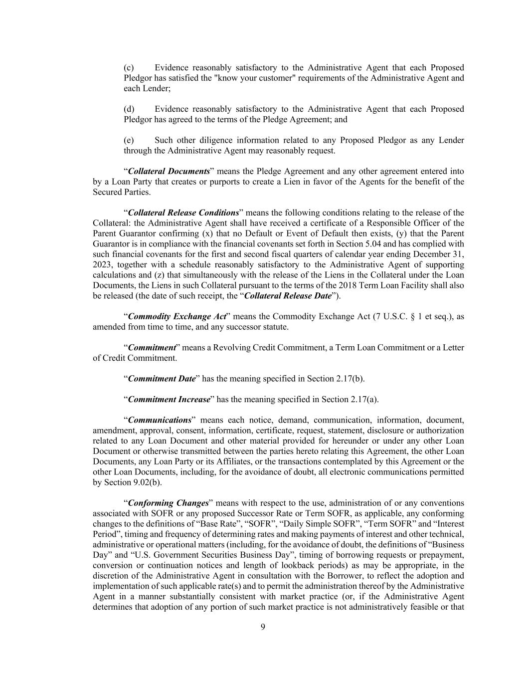 9 (c) Evidence reasonably satisfactory to the Administrative Agent that each Proposed Pledgor has satisfied the "know your customer" requirements of the Administrative Agent and each Lender; (d) Evidence reasonably satisfactory to the Administrative Agent that each Proposed Pledgor has agreed to the terms of the Pledge Agreement; and (e) Such other diligence information related to any Proposed Pledgor as any Lender through the Administrative Agent may reasonably request. “Collateral Documents” means the Pledge Agreement and any other agreement entered into by a Loan Party that creates or purports to create a Lien in favor of the Agents for the benefit of the Secured Parties. “Collateral Release Conditions” means the following conditions relating to the release of the Collateral: the Administrative Agent shall have received a certificate of a Responsible Officer of the Parent Guarantor confirming (x) that no Default or Event of Default then exists, (y) that the Parent Guarantor is in compliance with the financial covenants set forth in Section 5.04 and has complied with such financial covenants for the first and second fiscal quarters of calendar year ending December 31, 2023, together with a schedule reasonably satisfactory to the Administrative Agent of supporting calculations and (z) that simultaneously with the release of the Liens in the Collateral under the Loan Documents, the Liens in such Collateral pursuant to the terms of the 2018 Term Loan Facility shall also be released (the date of such receipt, the “Collateral Release Date”). “Commodity Exchange Act” means the Commodity Exchange Act (7 U.S.C. § 1 et seq.), as amended from time to time, and any successor statute. “Commitment” means a Revolving Credit Commitment, a Term Loan Commitment or a Letter of Credit Commitment. “Commitment Date” has the meaning specified in Section 2.17(b). “Commitment Increase” has the meaning specified in Section 2.17(a). “Communications” means each notice, demand, communication, information, document, amendment, approval, consent, information, certificate, request, statement, disclosure or authorization related to any Loan Document and other material provided for hereunder or under any other Loan Document or otherwise transmitted between the parties hereto relating this Agreement, the other Loan Documents, any Loan Party or its Affiliates, or the transactions contemplated by this Agreement or the other Loan Documents, including, for the avoidance of doubt, all electronic communications permitted by Section 9.02(b). “Conforming Changes” means with respect to the use, administration of or any conventions associated with SOFR or any proposed Successor Rate or Term SOFR, as applicable, any conforming changes to the definitions of “Base Rate”, “SOFR”, “Daily Simple SOFR”, “Term SOFR” and “Interest Period”, timing and frequency of determining rates and making payments of interest and other technical, administrative or operational matters (including, for the avoidance of doubt, the definitions of “Business Day” and “U.S. Government Securities Business Day”, timing of borrowing requests or prepayment, conversion or continuation notices and length of lookback periods) as may be appropriate, in the discretion of the Administrative Agent in consultation with the Borrower, to reflect the adoption and implementation of such applicable rate(s) and to permit the administration thereof by the Administrative Agent in a manner substantially consistent with market practice (or, if the Administrative Agent determines that adoption of any portion of such market practice is not administratively feasible or that