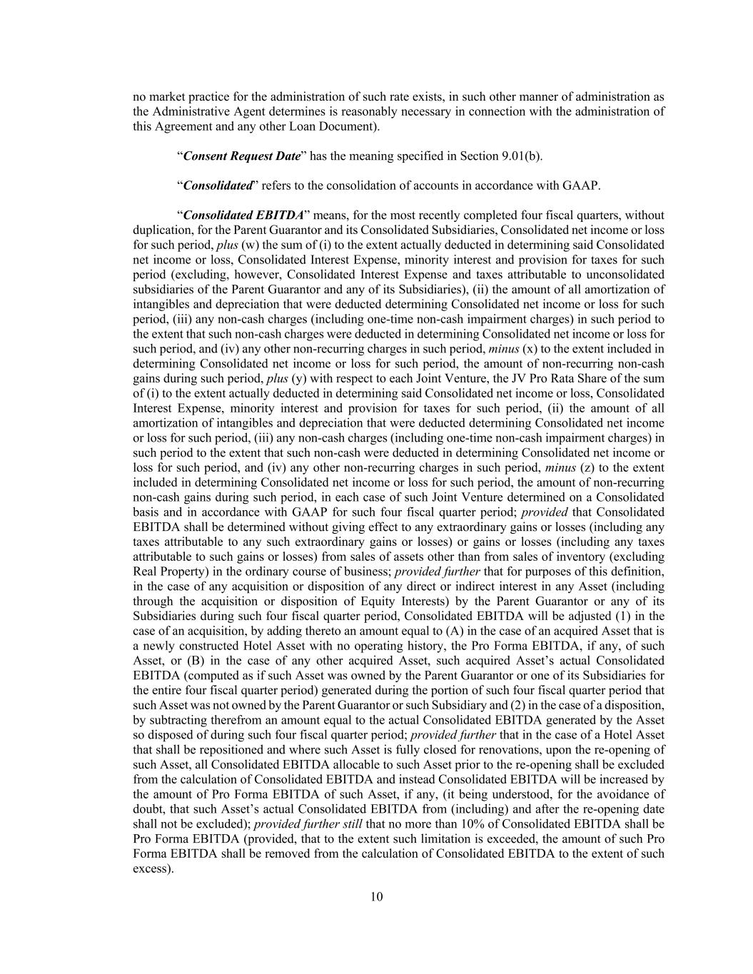 10 no market practice for the administration of such rate exists, in such other manner of administration as the Administrative Agent determines is reasonably necessary in connection with the administration of this Agreement and any other Loan Document). “Consent Request Date” has the meaning specified in Section 9.01(b). “Consolidated” refers to the consolidation of accounts in accordance with GAAP. “Consolidated EBITDA” means, for the most recently completed four fiscal quarters, without duplication, for the Parent Guarantor and its Consolidated Subsidiaries, Consolidated net income or loss for such period, plus (w) the sum of (i) to the extent actually deducted in determining said Consolidated net income or loss, Consolidated Interest Expense, minority interest and provision for taxes for such period (excluding, however, Consolidated Interest Expense and taxes attributable to unconsolidated subsidiaries of the Parent Guarantor and any of its Subsidiaries), (ii) the amount of all amortization of intangibles and depreciation that were deducted determining Consolidated net income or loss for such period, (iii) any non-cash charges (including one-time non-cash impairment charges) in such period to the extent that such non-cash charges were deducted in determining Consolidated net income or loss for such period, and (iv) any other non-recurring charges in such period, minus (x) to the extent included in determining Consolidated net income or loss for such period, the amount of non-recurring non-cash gains during such period, plus (y) with respect to each Joint Venture, the JV Pro Rata Share of the sum of (i) to the extent actually deducted in determining said Consolidated net income or loss, Consolidated Interest Expense, minority interest and provision for taxes for such period, (ii) the amount of all amortization of intangibles and depreciation that were deducted determining Consolidated net income or loss for such period, (iii) any non-cash charges (including one-time non-cash impairment charges) in such period to the extent that such non-cash were deducted in determining Consolidated net income or loss for such period, and (iv) any other non-recurring charges in such period, minus (z) to the extent included in determining Consolidated net income or loss for such period, the amount of non-recurring non-cash gains during such period, in each case of such Joint Venture determined on a Consolidated basis and in accordance with GAAP for such four fiscal quarter period; provided that Consolidated EBITDA shall be determined without giving effect to any extraordinary gains or losses (including any taxes attributable to any such extraordinary gains or losses) or gains or losses (including any taxes attributable to such gains or losses) from sales of assets other than from sales of inventory (excluding Real Property) in the ordinary course of business; provided further that for purposes of this definition, in the case of any acquisition or disposition of any direct or indirect interest in any Asset (including through the acquisition or disposition of Equity Interests) by the Parent Guarantor or any of its Subsidiaries during such four fiscal quarter period, Consolidated EBITDA will be adjusted (1) in the case of an acquisition, by adding thereto an amount equal to (A) in the case of an acquired Asset that is a newly constructed Hotel Asset with no operating history, the Pro Forma EBITDA, if any, of such Asset, or (B) in the case of any other acquired Asset, such acquired Asset’s actual Consolidated EBITDA (computed as if such Asset was owned by the Parent Guarantor or one of its Subsidiaries for the entire four fiscal quarter period) generated during the portion of such four fiscal quarter period that such Asset was not owned by the Parent Guarantor or such Subsidiary and (2) in the case of a disposition, by subtracting therefrom an amount equal to the actual Consolidated EBITDA generated by the Asset so disposed of during such four fiscal quarter period; provided further that in the case of a Hotel Asset that shall be repositioned and where such Asset is fully closed for renovations, upon the re-opening of such Asset, all Consolidated EBITDA allocable to such Asset prior to the re-opening shall be excluded from the calculation of Consolidated EBITDA and instead Consolidated EBITDA will be increased by the amount of Pro Forma EBITDA of such Asset, if any, (it being understood, for the avoidance of doubt, that such Asset’s actual Consolidated EBITDA from (including) and after the re-opening date shall not be excluded); provided further still that no more than 10% of Consolidated EBITDA shall be Pro Forma EBITDA (provided, that to the extent such limitation is exceeded, the amount of such Pro Forma EBITDA shall be removed from the calculation of Consolidated EBITDA to the extent of such excess).