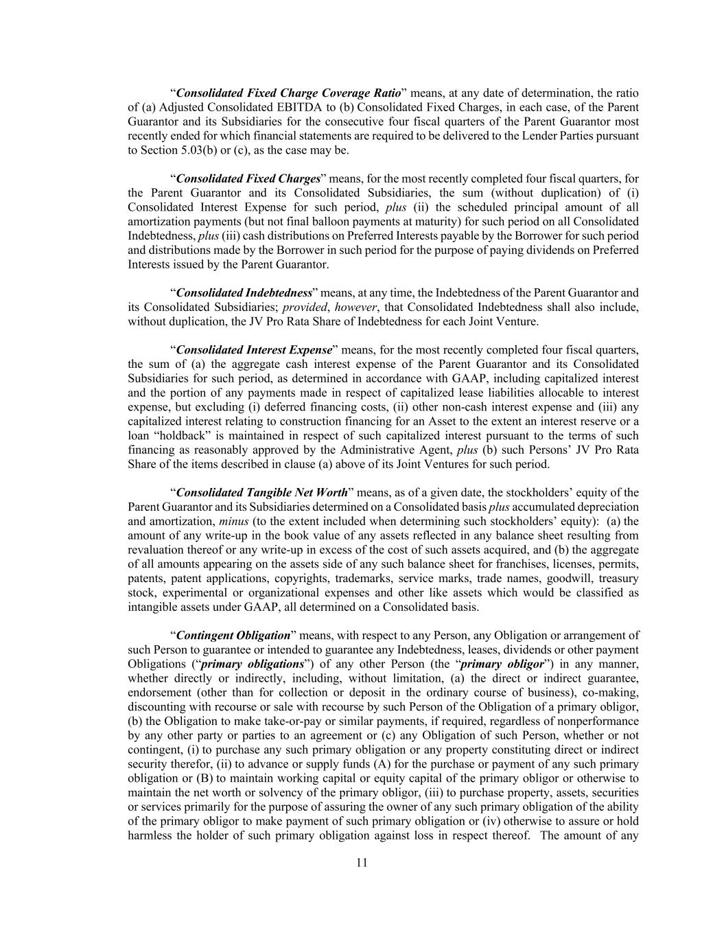 11 “Consolidated Fixed Charge Coverage Ratio” means, at any date of determination, the ratio of (a) Adjusted Consolidated EBITDA to (b) Consolidated Fixed Charges, in each case, of the Parent Guarantor and its Subsidiaries for the consecutive four fiscal quarters of the Parent Guarantor most recently ended for which financial statements are required to be delivered to the Lender Parties pursuant to Section 5.03(b) or (c), as the case may be. “Consolidated Fixed Charges” means, for the most recently completed four fiscal quarters, for the Parent Guarantor and its Consolidated Subsidiaries, the sum (without duplication) of (i) Consolidated Interest Expense for such period, plus (ii) the scheduled principal amount of all amortization payments (but not final balloon payments at maturity) for such period on all Consolidated Indebtedness, plus (iii) cash distributions on Preferred Interests payable by the Borrower for such period and distributions made by the Borrower in such period for the purpose of paying dividends on Preferred Interests issued by the Parent Guarantor. “Consolidated Indebtedness” means, at any time, the Indebtedness of the Parent Guarantor and its Consolidated Subsidiaries; provided, however, that Consolidated Indebtedness shall also include, without duplication, the JV Pro Rata Share of Indebtedness for each Joint Venture. “Consolidated Interest Expense” means, for the most recently completed four fiscal quarters, the sum of (a) the aggregate cash interest expense of the Parent Guarantor and its Consolidated Subsidiaries for such period, as determined in accordance with GAAP, including capitalized interest and the portion of any payments made in respect of capitalized lease liabilities allocable to interest expense, but excluding (i) deferred financing costs, (ii) other non-cash interest expense and (iii) any capitalized interest relating to construction financing for an Asset to the extent an interest reserve or a loan “holdback” is maintained in respect of such capitalized interest pursuant to the terms of such financing as reasonably approved by the Administrative Agent, plus (b) such Persons’ JV Pro Rata Share of the items described in clause (a) above of its Joint Ventures for such period. “Consolidated Tangible Net Worth” means, as of a given date, the stockholders’ equity of the Parent Guarantor and its Subsidiaries determined on a Consolidated basis plus accumulated depreciation and amortization, minus (to the extent included when determining such stockholders’ equity): (a) the amount of any write-up in the book value of any assets reflected in any balance sheet resulting from revaluation thereof or any write-up in excess of the cost of such assets acquired, and (b) the aggregate of all amounts appearing on the assets side of any such balance sheet for franchises, licenses, permits, patents, patent applications, copyrights, trademarks, service marks, trade names, goodwill, treasury stock, experimental or organizational expenses and other like assets which would be classified as intangible assets under GAAP, all determined on a Consolidated basis. “Contingent Obligation” means, with respect to any Person, any Obligation or arrangement of such Person to guarantee or intended to guarantee any Indebtedness, leases, dividends or other payment Obligations (“primary obligations”) of any other Person (the “primary obligor”) in any manner, whether directly or indirectly, including, without limitation, (a) the direct or indirect guarantee, endorsement (other than for collection or deposit in the ordinary course of business), co-making, discounting with recourse or sale with recourse by such Person of the Obligation of a primary obligor, (b) the Obligation to make take-or-pay or similar payments, if required, regardless of nonperformance by any other party or parties to an agreement or (c) any Obligation of such Person, whether or not contingent, (i) to purchase any such primary obligation or any property constituting direct or indirect security therefor, (ii) to advance or supply funds (A) for the purchase or payment of any such primary obligation or (B) to maintain working capital or equity capital of the primary obligor or otherwise to maintain the net worth or solvency of the primary obligor, (iii) to purchase property, assets, securities or services primarily for the purpose of assuring the owner of any such primary obligation of the ability of the primary obligor to make payment of such primary obligation or (iv) otherwise to assure or hold harmless the holder of such primary obligation against loss in respect thereof. The amount of any
