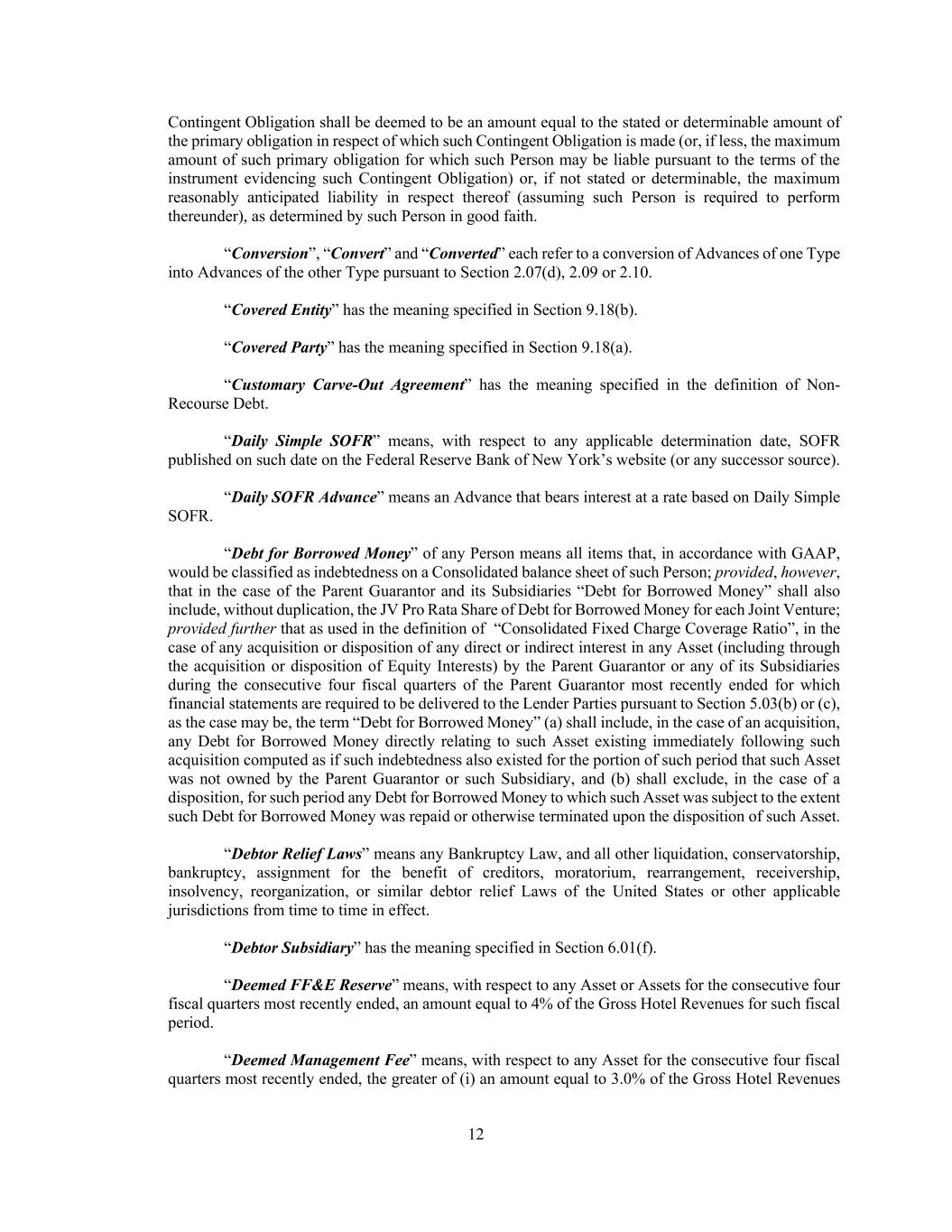 12 Contingent Obligation shall be deemed to be an amount equal to the stated or determinable amount of the primary obligation in respect of which such Contingent Obligation is made (or, if less, the maximum amount of such primary obligation for which such Person may be liable pursuant to the terms of the instrument evidencing such Contingent Obligation) or, if not stated or determinable, the maximum reasonably anticipated liability in respect thereof (assuming such Person is required to perform thereunder), as determined by such Person in good faith. “Conversion”, “Convert” and “Converted” each refer to a conversion of Advances of one Type into Advances of the other Type pursuant to Section 2.07(d), 2.09 or 2.10. “Covered Entity” has the meaning specified in Section 9.18(b). “Covered Party” has the meaning specified in Section 9.18(a). “Customary Carve-Out Agreement” has the meaning specified in the definition of Non- Recourse Debt. “Daily Simple SOFR” means, with respect to any applicable determination date, SOFR published on such date on the Federal Reserve Bank of New York’s website (or any successor source). “Daily SOFR Advance” means an Advance that bears interest at a rate based on Daily Simple SOFR. “Debt for Borrowed Money” of any Person means all items that, in accordance with GAAP, would be classified as indebtedness on a Consolidated balance sheet of such Person; provided, however, that in the case of the Parent Guarantor and its Subsidiaries “Debt for Borrowed Money” shall also include, without duplication, the JV Pro Rata Share of Debt for Borrowed Money for each Joint Venture; provided further that as used in the definition of “Consolidated Fixed Charge Coverage Ratio”, in the case of any acquisition or disposition of any direct or indirect interest in any Asset (including through the acquisition or disposition of Equity Interests) by the Parent Guarantor or any of its Subsidiaries during the consecutive four fiscal quarters of the Parent Guarantor most recently ended for which financial statements are required to be delivered to the Lender Parties pursuant to Section 5.03(b) or (c), as the case may be, the term “Debt for Borrowed Money” (a) shall include, in the case of an acquisition, any Debt for Borrowed Money directly relating to such Asset existing immediately following such acquisition computed as if such indebtedness also existed for the portion of such period that such Asset was not owned by the Parent Guarantor or such Subsidiary, and (b) shall exclude, in the case of a disposition, for such period any Debt for Borrowed Money to which such Asset was subject to the extent such Debt for Borrowed Money was repaid or otherwise terminated upon the disposition of such Asset. “Debtor Relief Laws” means any Bankruptcy Law, and all other liquidation, conservatorship, bankruptcy, assignment for the benefit of creditors, moratorium, rearrangement, receivership, insolvency, reorganization, or similar debtor relief Laws of the United States or other applicable jurisdictions from time to time in effect. “Debtor Subsidiary” has the meaning specified in Section 6.01(f). “Deemed FF&E Reserve” means, with respect to any Asset or Assets for the consecutive four fiscal quarters most recently ended, an amount equal to 4% of the Gross Hotel Revenues for such fiscal period. “Deemed Management Fee” means, with respect to any Asset for the consecutive four fiscal quarters most recently ended, the greater of (i) an amount equal to 3.0% of the Gross Hotel Revenues