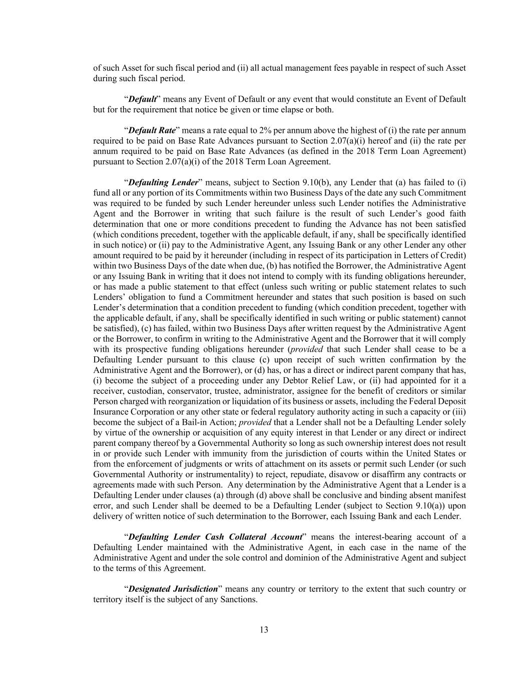 13 of such Asset for such fiscal period and (ii) all actual management fees payable in respect of such Asset during such fiscal period. “Default” means any Event of Default or any event that would constitute an Event of Default but for the requirement that notice be given or time elapse or both. “Default Rate” means a rate equal to 2% per annum above the highest of (i) the rate per annum required to be paid on Base Rate Advances pursuant to Section 2.07(a)(i) hereof and (ii) the rate per annum required to be paid on Base Rate Advances (as defined in the 2018 Term Loan Agreement) pursuant to Section 2.07(a)(i) of the 2018 Term Loan Agreement. “Defaulting Lender” means, subject to Section 9.10(b), any Lender that (a) has failed to (i) fund all or any portion of its Commitments within two Business Days of the date any such Commitment was required to be funded by such Lender hereunder unless such Lender notifies the Administrative Agent and the Borrower in writing that such failure is the result of such Lender’s good faith determination that one or more conditions precedent to funding the Advance has not been satisfied (which conditions precedent, together with the applicable default, if any, shall be specifically identified in such notice) or (ii) pay to the Administrative Agent, any Issuing Bank or any other Lender any other amount required to be paid by it hereunder (including in respect of its participation in Letters of Credit) within two Business Days of the date when due, (b) has notified the Borrower, the Administrative Agent or any Issuing Bank in writing that it does not intend to comply with its funding obligations hereunder, or has made a public statement to that effect (unless such writing or public statement relates to such Lenders’ obligation to fund a Commitment hereunder and states that such position is based on such Lender’s determination that a condition precedent to funding (which condition precedent, together with the applicable default, if any, shall be specifically identified in such writing or public statement) cannot be satisfied), (c) has failed, within two Business Days after written request by the Administrative Agent or the Borrower, to confirm in writing to the Administrative Agent and the Borrower that it will comply with its prospective funding obligations hereunder (provided that such Lender shall cease to be a Defaulting Lender pursuant to this clause (c) upon receipt of such written confirmation by the Administrative Agent and the Borrower), or (d) has, or has a direct or indirect parent company that has, (i) become the subject of a proceeding under any Debtor Relief Law, or (ii) had appointed for it a receiver, custodian, conservator, trustee, administrator, assignee for the benefit of creditors or similar Person charged with reorganization or liquidation of its business or assets, including the Federal Deposit Insurance Corporation or any other state or federal regulatory authority acting in such a capacity or (iii) become the subject of a Bail-in Action; provided that a Lender shall not be a Defaulting Lender solely by virtue of the ownership or acquisition of any equity interest in that Lender or any direct or indirect parent company thereof by a Governmental Authority so long as such ownership interest does not result in or provide such Lender with immunity from the jurisdiction of courts within the United States or from the enforcement of judgments or writs of attachment on its assets or permit such Lender (or such Governmental Authority or instrumentality) to reject, repudiate, disavow or disaffirm any contracts or agreements made with such Person. Any determination by the Administrative Agent that a Lender is a Defaulting Lender under clauses (a) through (d) above shall be conclusive and binding absent manifest error, and such Lender shall be deemed to be a Defaulting Lender (subject to Section 9.10(a)) upon delivery of written notice of such determination to the Borrower, each Issuing Bank and each Lender. “Defaulting Lender Cash Collateral Account” means the interest-bearing account of a Defaulting Lender maintained with the Administrative Agent, in each case in the name of the Administrative Agent and under the sole control and dominion of the Administrative Agent and subject to the terms of this Agreement. “Designated Jurisdiction” means any country or territory to the extent that such country or territory itself is the subject of any Sanctions.