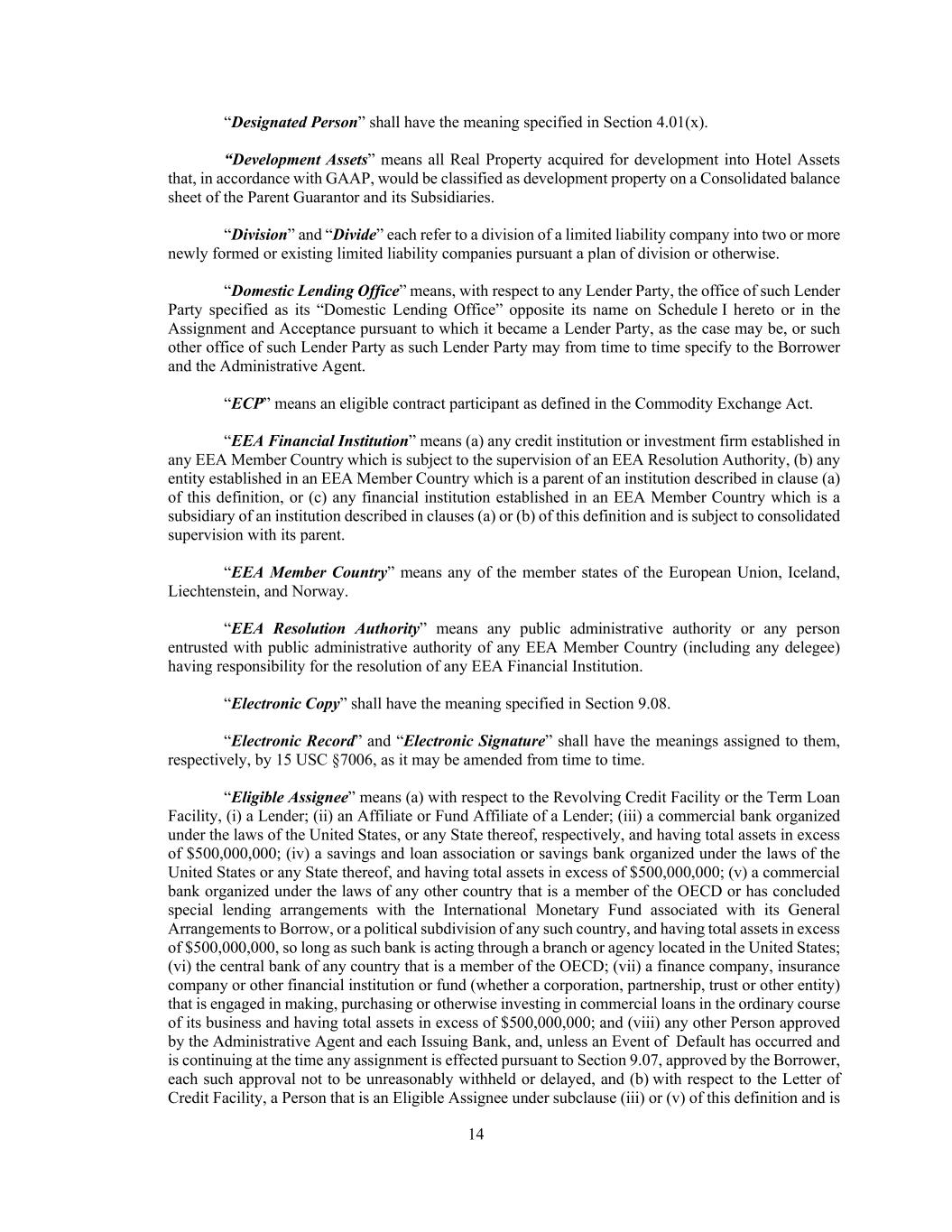 14 “Designated Person” shall have the meaning specified in Section 4.01(x). “Development Assets” means all Real Property acquired for development into Hotel Assets that, in accordance with GAAP, would be classified as development property on a Consolidated balance sheet of the Parent Guarantor and its Subsidiaries. “Division” and “Divide” each refer to a division of a limited liability company into two or more newly formed or existing limited liability companies pursuant a plan of division or otherwise. “Domestic Lending Office” means, with respect to any Lender Party, the office of such Lender Party specified as its “Domestic Lending Office” opposite its name on Schedule I hereto or in the Assignment and Acceptance pursuant to which it became a Lender Party, as the case may be, or such other office of such Lender Party as such Lender Party may from time to time specify to the Borrower and the Administrative Agent. “ECP” means an eligible contract participant as defined in the Commodity Exchange Act. “EEA Financial Institution” means (a) any credit institution or investment firm established in any EEA Member Country which is subject to the supervision of an EEA Resolution Authority, (b) any entity established in an EEA Member Country which is a parent of an institution described in clause (a) of this definition, or (c) any financial institution established in an EEA Member Country which is a subsidiary of an institution described in clauses (a) or (b) of this definition and is subject to consolidated supervision with its parent. “EEA Member Country” means any of the member states of the European Union, Iceland, Liechtenstein, and Norway. “EEA Resolution Authority” means any public administrative authority or any person entrusted with public administrative authority of any EEA Member Country (including any delegee) having responsibility for the resolution of any EEA Financial Institution. “Electronic Copy” shall have the meaning specified in Section 9.08. “Electronic Record” and “Electronic Signature” shall have the meanings assigned to them, respectively, by 15 USC §7006, as it may be amended from time to time. “Eligible Assignee” means (a) with respect to the Revolving Credit Facility or the Term Loan Facility, (i) a Lender; (ii) an Affiliate or Fund Affiliate of a Lender; (iii) a commercial bank organized under the laws of the United States, or any State thereof, respectively, and having total assets in excess of $500,000,000; (iv) a savings and loan association or savings bank organized under the laws of the United States or any State thereof, and having total assets in excess of $500,000,000; (v) a commercial bank organized under the laws of any other country that is a member of the OECD or has concluded special lending arrangements with the International Monetary Fund associated with its General Arrangements to Borrow, or a political subdivision of any such country, and having total assets in excess of $500,000,000, so long as such bank is acting through a branch or agency located in the United States; (vi) the central bank of any country that is a member of the OECD; (vii) a finance company, insurance company or other financial institution or fund (whether a corporation, partnership, trust or other entity) that is engaged in making, purchasing or otherwise investing in commercial loans in the ordinary course of its business and having total assets in excess of $500,000,000; and (viii) any other Person approved by the Administrative Agent and each Issuing Bank, and, unless an Event of Default has occurred and is continuing at the time any assignment is effected pursuant to Section 9.07, approved by the Borrower, each such approval not to be unreasonably withheld or delayed, and (b) with respect to the Letter of Credit Facility, a Person that is an Eligible Assignee under subclause (iii) or (v) of this definition and is
