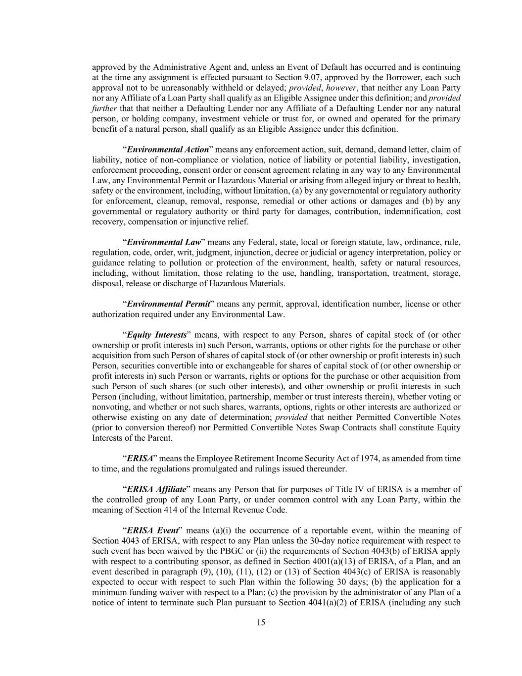 15 approved by the Administrative Agent and, unless an Event of Default has occurred and is continuing at the time any assignment is effected pursuant to Section 9.07, approved by the Borrower, each such approval not to be unreasonably withheld or delayed; provided, however, that neither any Loan Party nor any Affiliate of a Loan Party shall qualify as an Eligible Assignee under this definition; and provided further that that neither a Defaulting Lender nor any Affiliate of a Defaulting Lender nor any natural person, or holding company, investment vehicle or trust for, or owned and operated for the primary benefit of a natural person, shall qualify as an Eligible Assignee under this definition. “Environmental Action” means any enforcement action, suit, demand, demand letter, claim of liability, notice of non-compliance or violation, notice of liability or potential liability, investigation, enforcement proceeding, consent order or consent agreement relating in any way to any Environmental Law, any Environmental Permit or Hazardous Material or arising from alleged injury or threat to health, safety or the environment, including, without limitation, (a) by any governmental or regulatory authority for enforcement, cleanup, removal, response, remedial or other actions or damages and (b) by any governmental or regulatory authority or third party for damages, contribution, indemnification, cost recovery, compensation or injunctive relief. “Environmental Law” means any Federal, state, local or foreign statute, law, ordinance, rule, regulation, code, order, writ, judgment, injunction, decree or judicial or agency interpretation, policy or guidance relating to pollution or protection of the environment, health, safety or natural resources, including, without limitation, those relating to the use, handling, transportation, treatment, storage, disposal, release or discharge of Hazardous Materials. “Environmental Permit” means any permit, approval, identification number, license or other authorization required under any Environmental Law. “Equity Interests” means, with respect to any Person, shares of capital stock of (or other ownership or profit interests in) such Person, warrants, options or other rights for the purchase or other acquisition from such Person of shares of capital stock of (or other ownership or profit interests in) such Person, securities convertible into or exchangeable for shares of capital stock of (or other ownership or profit interests in) such Person or warrants, rights or options for the purchase or other acquisition from such Person of such shares (or such other interests), and other ownership or profit interests in such Person (including, without limitation, partnership, member or trust interests therein), whether voting or nonvoting, and whether or not such shares, warrants, options, rights or other interests are authorized or otherwise existing on any date of determination; provided that neither Permitted Convertible Notes (prior to conversion thereof) nor Permitted Convertible Notes Swap Contracts shall constitute Equity Interests of the Parent. “ERISA” means the Employee Retirement Income Security Act of 1974, as amended from time to time, and the regulations promulgated and rulings issued thereunder. “ERISA Affiliate” means any Person that for purposes of Title IV of ERISA is a member of the controlled group of any Loan Party, or under common control with any Loan Party, within the meaning of Section 414 of the Internal Revenue Code. “ERISA Event” means (a)(i) the occurrence of a reportable event, within the meaning of Section 4043 of ERISA, with respect to any Plan unless the 30-day notice requirement with respect to such event has been waived by the PBGC or (ii) the requirements of Section 4043(b) of ERISA apply with respect to a contributing sponsor, as defined in Section 4001(a)(13) of ERISA, of a Plan, and an event described in paragraph (9), (10), (11), (12) or (13) of Section 4043(c) of ERISA is reasonably expected to occur with respect to such Plan within the following 30 days; (b) the application for a minimum funding waiver with respect to a Plan; (c) the provision by the administrator of any Plan of a notice of intent to terminate such Plan pursuant to Section 4041(a)(2) of ERISA (including any such