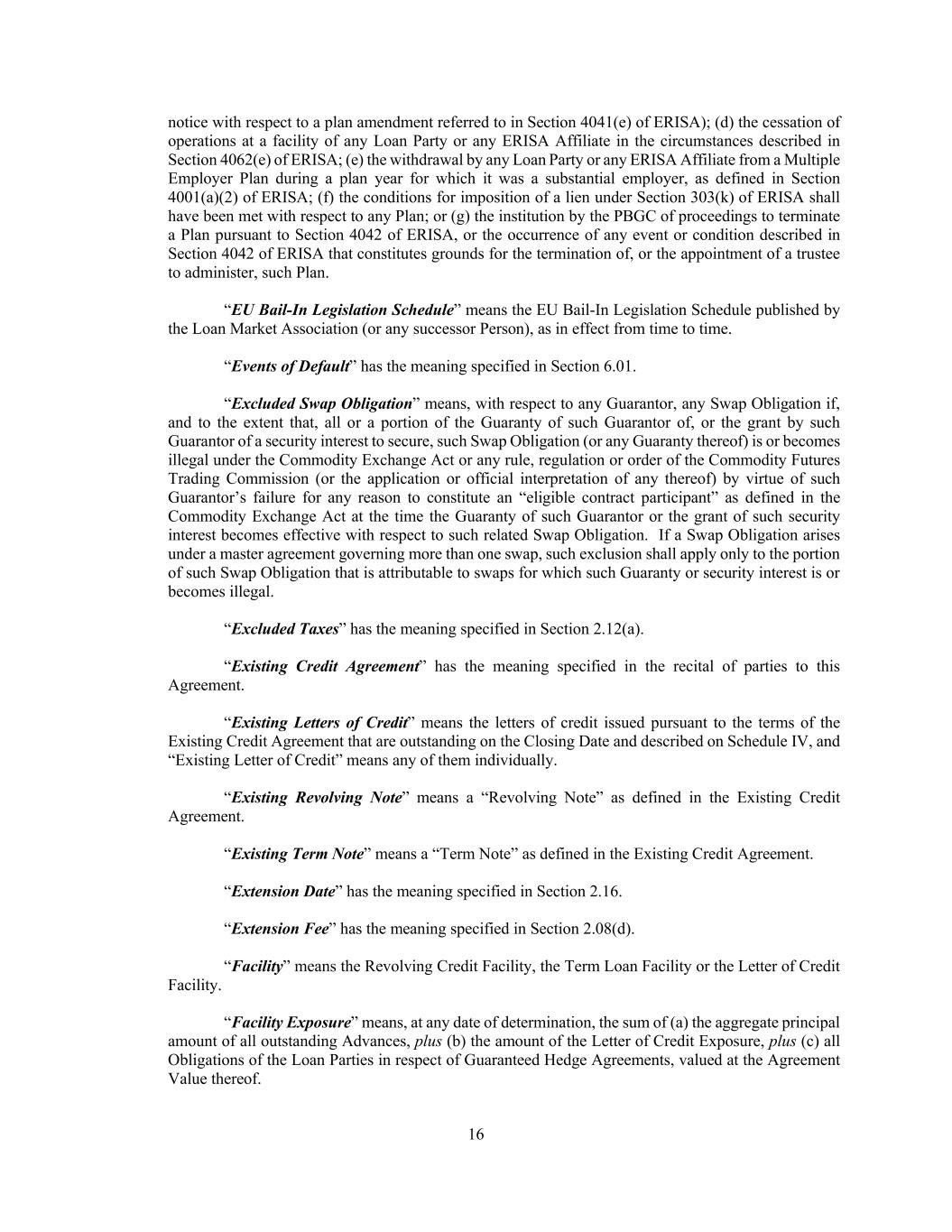 16 notice with respect to a plan amendment referred to in Section 4041(e) of ERISA); (d) the cessation of operations at a facility of any Loan Party or any ERISA Affiliate in the circumstances described in Section 4062(e) of ERISA; (e) the withdrawal by any Loan Party or any ERISA Affiliate from a Multiple Employer Plan during a plan year for which it was a substantial employer, as defined in Section 4001(a)(2) of ERISA; (f) the conditions for imposition of a lien under Section 303(k) of ERISA shall have been met with respect to any Plan; or (g) the institution by the PBGC of proceedings to terminate a Plan pursuant to Section 4042 of ERISA, or the occurrence of any event or condition described in Section 4042 of ERISA that constitutes grounds for the termination of, or the appointment of a trustee to administer, such Plan. “EU Bail-In Legislation Schedule” means the EU Bail-In Legislation Schedule published by the Loan Market Association (or any successor Person), as in effect from time to time. “Events of Default” has the meaning specified in Section 6.01. “Excluded Swap Obligation” means, with respect to any Guarantor, any Swap Obligation if, and to the extent that, all or a portion of the Guaranty of such Guarantor of, or the grant by such Guarantor of a security interest to secure, such Swap Obligation (or any Guaranty thereof) is or becomes illegal under the Commodity Exchange Act or any rule, regulation or order of the Commodity Futures Trading Commission (or the application or official interpretation of any thereof) by virtue of such Guarantor’s failure for any reason to constitute an “eligible contract participant” as defined in the Commodity Exchange Act at the time the Guaranty of such Guarantor or the grant of such security interest becomes effective with respect to such related Swap Obligation. If a Swap Obligation arises under a master agreement governing more than one swap, such exclusion shall apply only to the portion of such Swap Obligation that is attributable to swaps for which such Guaranty or security interest is or becomes illegal. “Excluded Taxes” has the meaning specified in Section 2.12(a). “Existing Credit Agreement” has the meaning specified in the recital of parties to this Agreement. “Existing Letters of Credit” means the letters of credit issued pursuant to the terms of the Existing Credit Agreement that are outstanding on the Closing Date and described on Schedule IV, and “Existing Letter of Credit” means any of them individually. “Existing Revolving Note” means a “Revolving Note” as defined in the Existing Credit Agreement. “Existing Term Note” means a “Term Note” as defined in the Existing Credit Agreement. “Extension Date” has the meaning specified in Section 2.16. “Extension Fee” has the meaning specified in Section 2.08(d). “Facility” means the Revolving Credit Facility, the Term Loan Facility or the Letter of Credit Facility. “Facility Exposure” means, at any date of determination, the sum of (a) the aggregate principal amount of all outstanding Advances, plus (b) the amount of the Letter of Credit Exposure, plus (c) all Obligations of the Loan Parties in respect of Guaranteed Hedge Agreements, valued at the Agreement Value thereof.