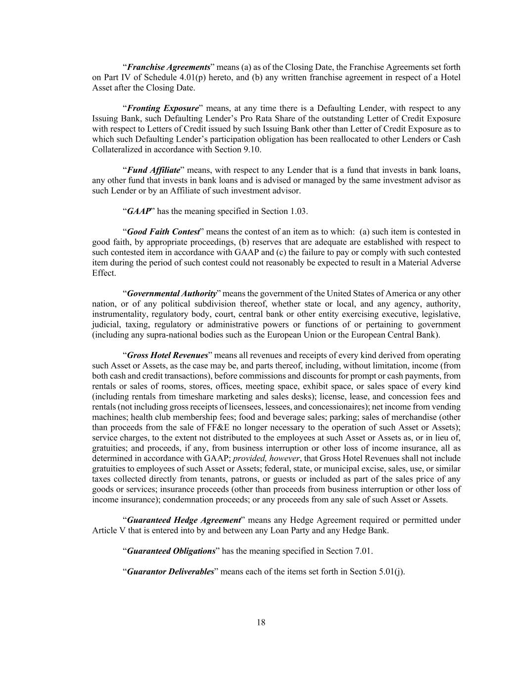 18 “Franchise Agreements” means (a) as of the Closing Date, the Franchise Agreements set forth on Part IV of Schedule 4.01(p) hereto, and (b) any written franchise agreement in respect of a Hotel Asset after the Closing Date. “Fronting Exposure” means, at any time there is a Defaulting Lender, with respect to any Issuing Bank, such Defaulting Lender’s Pro Rata Share of the outstanding Letter of Credit Exposure with respect to Letters of Credit issued by such Issuing Bank other than Letter of Credit Exposure as to which such Defaulting Lender’s participation obligation has been reallocated to other Lenders or Cash Collateralized in accordance with Section 9.10. “Fund Affiliate” means, with respect to any Lender that is a fund that invests in bank loans, any other fund that invests in bank loans and is advised or managed by the same investment advisor as such Lender or by an Affiliate of such investment advisor. “GAAP” has the meaning specified in Section 1.03. “Good Faith Contest” means the contest of an item as to which: (a) such item is contested in good faith, by appropriate proceedings, (b) reserves that are adequate are established with respect to such contested item in accordance with GAAP and (c) the failure to pay or comply with such contested item during the period of such contest could not reasonably be expected to result in a Material Adverse Effect. “Governmental Authority” means the government of the United States of America or any other nation, or of any political subdivision thereof, whether state or local, and any agency, authority, instrumentality, regulatory body, court, central bank or other entity exercising executive, legislative, judicial, taxing, regulatory or administrative powers or functions of or pertaining to government (including any supra-national bodies such as the European Union or the European Central Bank). “Gross Hotel Revenues” means all revenues and receipts of every kind derived from operating such Asset or Assets, as the case may be, and parts thereof, including, without limitation, income (from both cash and credit transactions), before commissions and discounts for prompt or cash payments, from rentals or sales of rooms, stores, offices, meeting space, exhibit space, or sales space of every kind (including rentals from timeshare marketing and sales desks); license, lease, and concession fees and rentals (not including gross receipts of licensees, lessees, and concessionaires); net income from vending machines; health club membership fees; food and beverage sales; parking; sales of merchandise (other than proceeds from the sale of FF&E no longer necessary to the operation of such Asset or Assets); service charges, to the extent not distributed to the employees at such Asset or Assets as, or in lieu of, gratuities; and proceeds, if any, from business interruption or other loss of income insurance, all as determined in accordance with GAAP; provided, however, that Gross Hotel Revenues shall not include gratuities to employees of such Asset or Assets; federal, state, or municipal excise, sales, use, or similar taxes collected directly from tenants, patrons, or guests or included as part of the sales price of any goods or services; insurance proceeds (other than proceeds from business interruption or other loss of income insurance); condemnation proceeds; or any proceeds from any sale of such Asset or Assets. “Guaranteed Hedge Agreement” means any Hedge Agreement required or permitted under Article V that is entered into by and between any Loan Party and any Hedge Bank. “Guaranteed Obligations” has the meaning specified in Section 7.01. “Guarantor Deliverables” means each of the items set forth in Section 5.01(j).