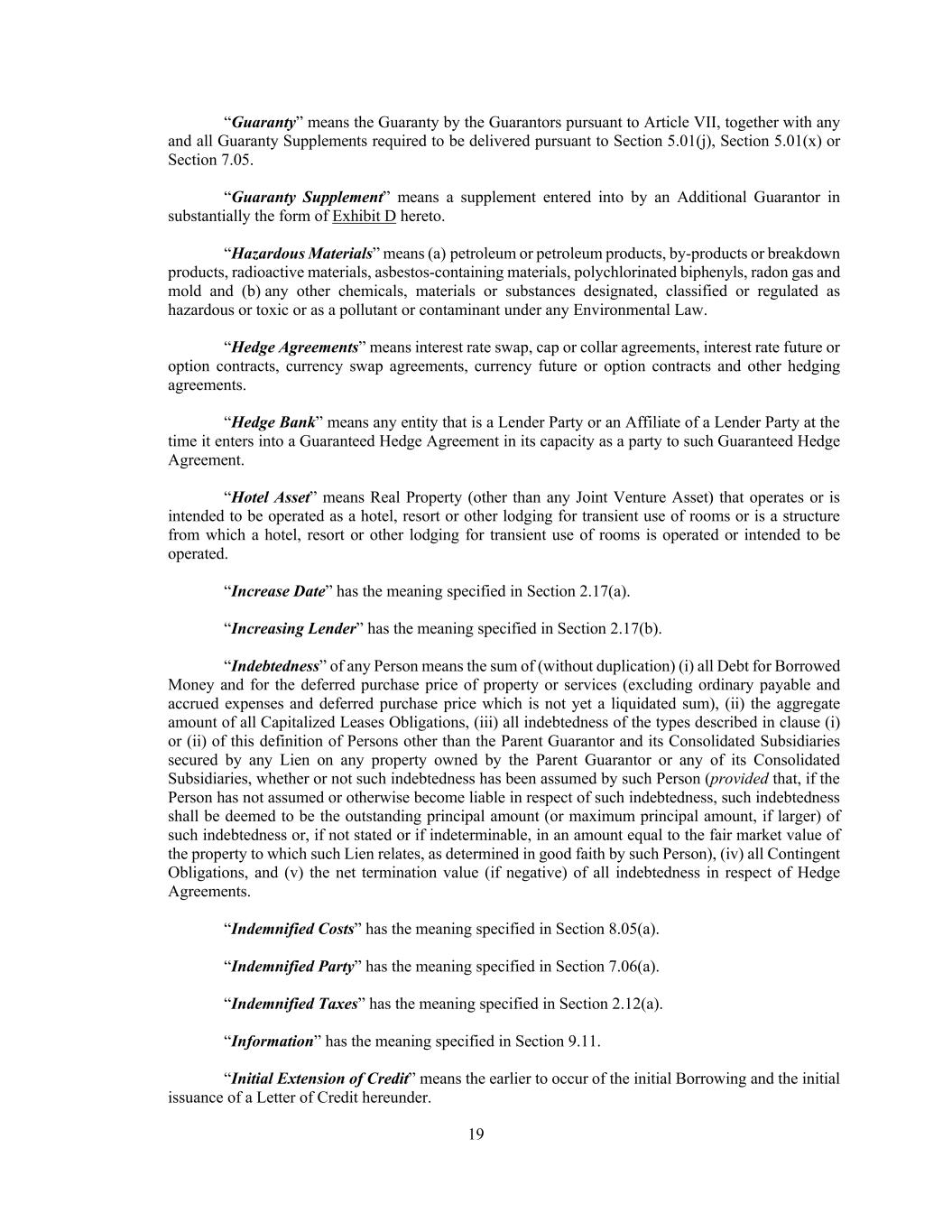 19 “Guaranty” means the Guaranty by the Guarantors pursuant to Article VII, together with any and all Guaranty Supplements required to be delivered pursuant to Section 5.01(j), Section 5.01(x) or Section 7.05. “Guaranty Supplement” means a supplement entered into by an Additional Guarantor in substantially the form of Exhibit D hereto. “Hazardous Materials” means (a) petroleum or petroleum products, by-products or breakdown products, radioactive materials, asbestos-containing materials, polychlorinated biphenyls, radon gas and mold and (b) any other chemicals, materials or substances designated, classified or regulated as hazardous or toxic or as a pollutant or contaminant under any Environmental Law. “Hedge Agreements” means interest rate swap, cap or collar agreements, interest rate future or option contracts, currency swap agreements, currency future or option contracts and other hedging agreements. “Hedge Bank” means any entity that is a Lender Party or an Affiliate of a Lender Party at the time it enters into a Guaranteed Hedge Agreement in its capacity as a party to such Guaranteed Hedge Agreement. “Hotel Asset” means Real Property (other than any Joint Venture Asset) that operates or is intended to be operated as a hotel, resort or other lodging for transient use of rooms or is a structure from which a hotel, resort or other lodging for transient use of rooms is operated or intended to be operated. “Increase Date” has the meaning specified in Section 2.17(a). “Increasing Lender” has the meaning specified in Section 2.17(b). “Indebtedness” of any Person means the sum of (without duplication) (i) all Debt for Borrowed Money and for the deferred purchase price of property or services (excluding ordinary payable and accrued expenses and deferred purchase price which is not yet a liquidated sum), (ii) the aggregate amount of all Capitalized Leases Obligations, (iii) all indebtedness of the types described in clause (i) or (ii) of this definition of Persons other than the Parent Guarantor and its Consolidated Subsidiaries secured by any Lien on any property owned by the Parent Guarantor or any of its Consolidated Subsidiaries, whether or not such indebtedness has been assumed by such Person (provided that, if the Person has not assumed or otherwise become liable in respect of such indebtedness, such indebtedness shall be deemed to be the outstanding principal amount (or maximum principal amount, if larger) of such indebtedness or, if not stated or if indeterminable, in an amount equal to the fair market value of the property to which such Lien relates, as determined in good faith by such Person), (iv) all Contingent Obligations, and (v) the net termination value (if negative) of all indebtedness in respect of Hedge Agreements. “Indemnified Costs” has the meaning specified in Section 8.05(a). “Indemnified Party” has the meaning specified in Section 7.06(a). “Indemnified Taxes” has the meaning specified in Section 2.12(a). “Information” has the meaning specified in Section 9.11. “Initial Extension of Credit” means the earlier to occur of the initial Borrowing and the initial issuance of a Letter of Credit hereunder.