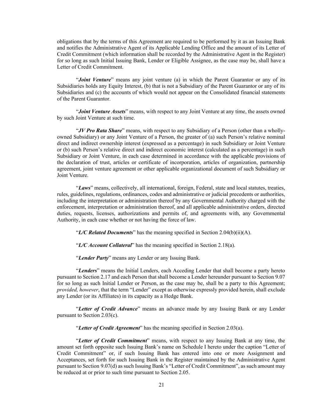 21 obligations that by the terms of this Agreement are required to be performed by it as an Issuing Bank and notifies the Administrative Agent of its Applicable Lending Office and the amount of its Letter of Credit Commitment (which information shall be recorded by the Administrative Agent in the Register) for so long as such Initial Issuing Bank, Lender or Eligible Assignee, as the case may be, shall have a Letter of Credit Commitment. “Joint Venture” means any joint venture (a) in which the Parent Guarantor or any of its Subsidiaries holds any Equity Interest, (b) that is not a Subsidiary of the Parent Guarantor or any of its Subsidiaries and (c) the accounts of which would not appear on the Consolidated financial statements of the Parent Guarantor. “Joint Venture Assets” means, with respect to any Joint Venture at any time, the assets owned by such Joint Venture at such time. “JV Pro Rata Share” means, with respect to any Subsidiary of a Person (other than a wholly- owned Subsidiary) or any Joint Venture of a Person, the greater of (a) such Person’s relative nominal direct and indirect ownership interest (expressed as a percentage) in such Subsidiary or Joint Venture or (b) such Person’s relative direct and indirect economic interest (calculated as a percentage) in such Subsidiary or Joint Venture, in each case determined in accordance with the applicable provisions of the declaration of trust, articles or certificate of incorporation, articles of organization, partnership agreement, joint venture agreement or other applicable organizational document of such Subsidiary or Joint Venture. “Laws” means, collectively, all international, foreign, Federal, state and local statutes, treaties, rules, guidelines, regulations, ordinances, codes and administrative or judicial precedents or authorities, including the interpretation or administration thereof by any Governmental Authority charged with the enforcement, interpretation or administration thereof, and all applicable administrative orders, directed duties, requests, licenses, authorizations and permits of, and agreements with, any Governmental Authority, in each case whether or not having the force of law. “L/C Related Documents” has the meaning specified in Section 2.04(b)(ii)(A). “L/C Account Collateral” has the meaning specified in Section 2.18(a). “Lender Party” means any Lender or any Issuing Bank. “Lenders” means the Initial Lenders, each Acceding Lender that shall become a party hereto pursuant to Section 2.17 and each Person that shall become a Lender hereunder pursuant to Section 9.07 for so long as such Initial Lender or Person, as the case may be, shall be a party to this Agreement; provided, however, that the term “Lender” except as otherwise expressly provided herein, shall exclude any Lender (or its Affiliates) in its capacity as a Hedge Bank. “Letter of Credit Advance” means an advance made by any Issuing Bank or any Lender pursuant to Section 2.03(c). “Letter of Credit Agreement” has the meaning specified in Section 2.03(a). “Letter of Credit Commitment” means, with respect to any Issuing Bank at any time, the amount set forth opposite such Issuing Bank’s name on Schedule I hereto under the caption “Letter of Credit Commitment” or, if such Issuing Bank has entered into one or more Assignment and Acceptances, set forth for such Issuing Bank in the Register maintained by the Administrative Agent pursuant to Section 9.07(d) as such Issuing Bank’s “Letter of Credit Commitment”, as such amount may be reduced at or prior to such time pursuant to Section 2.05.