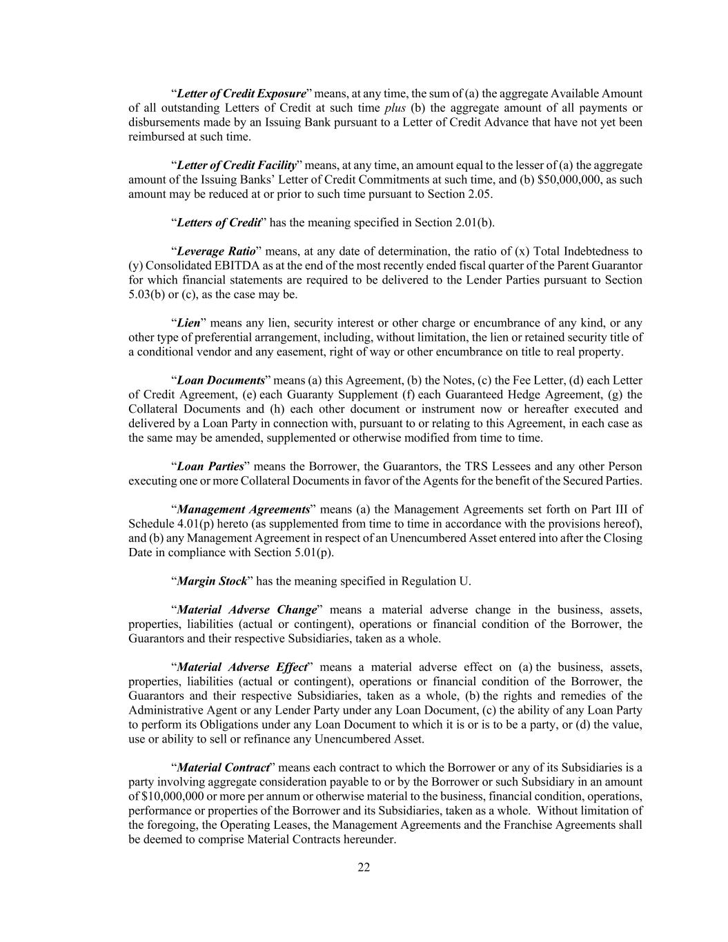 22 “Letter of Credit Exposure” means, at any time, the sum of (a) the aggregate Available Amount of all outstanding Letters of Credit at such time plus (b) the aggregate amount of all payments or disbursements made by an Issuing Bank pursuant to a Letter of Credit Advance that have not yet been reimbursed at such time. “Letter of Credit Facility” means, at any time, an amount equal to the lesser of (a) the aggregate amount of the Issuing Banks’ Letter of Credit Commitments at such time, and (b) $50,000,000, as such amount may be reduced at or prior to such time pursuant to Section 2.05. “Letters of Credit” has the meaning specified in Section 2.01(b). “Leverage Ratio” means, at any date of determination, the ratio of (x) Total Indebtedness to (y) Consolidated EBITDA as at the end of the most recently ended fiscal quarter of the Parent Guarantor for which financial statements are required to be delivered to the Lender Parties pursuant to Section 5.03(b) or (c), as the case may be. “Lien” means any lien, security interest or other charge or encumbrance of any kind, or any other type of preferential arrangement, including, without limitation, the lien or retained security title of a conditional vendor and any easement, right of way or other encumbrance on title to real property. “Loan Documents” means (a) this Agreement, (b) the Notes, (c) the Fee Letter, (d) each Letter of Credit Agreement, (e) each Guaranty Supplement (f) each Guaranteed Hedge Agreement, (g) the Collateral Documents and (h) each other document or instrument now or hereafter executed and delivered by a Loan Party in connection with, pursuant to or relating to this Agreement, in each case as the same may be amended, supplemented or otherwise modified from time to time. “Loan Parties” means the Borrower, the Guarantors, the TRS Lessees and any other Person executing one or more Collateral Documents in favor of the Agents for the benefit of the Secured Parties. “Management Agreements” means (a) the Management Agreements set forth on Part III of Schedule 4.01(p) hereto (as supplemented from time to time in accordance with the provisions hereof), and (b) any Management Agreement in respect of an Unencumbered Asset entered into after the Closing Date in compliance with Section 5.01(p). “Margin Stock” has the meaning specified in Regulation U. “Material Adverse Change” means a material adverse change in the business, assets, properties, liabilities (actual or contingent), operations or financial condition of the Borrower, the Guarantors and their respective Subsidiaries, taken as a whole. “Material Adverse Effect” means a material adverse effect on (a) the business, assets, properties, liabilities (actual or contingent), operations or financial condition of the Borrower, the Guarantors and their respective Subsidiaries, taken as a whole, (b) the rights and remedies of the Administrative Agent or any Lender Party under any Loan Document, (c) the ability of any Loan Party to perform its Obligations under any Loan Document to which it is or is to be a party, or (d) the value, use or ability to sell or refinance any Unencumbered Asset. “Material Contract” means each contract to which the Borrower or any of its Subsidiaries is a party involving aggregate consideration payable to or by the Borrower or such Subsidiary in an amount of $10,000,000 or more per annum or otherwise material to the business, financial condition, operations, performance or properties of the Borrower and its Subsidiaries, taken as a whole. Without limitation of the foregoing, the Operating Leases, the Management Agreements and the Franchise Agreements shall be deemed to comprise Material Contracts hereunder.