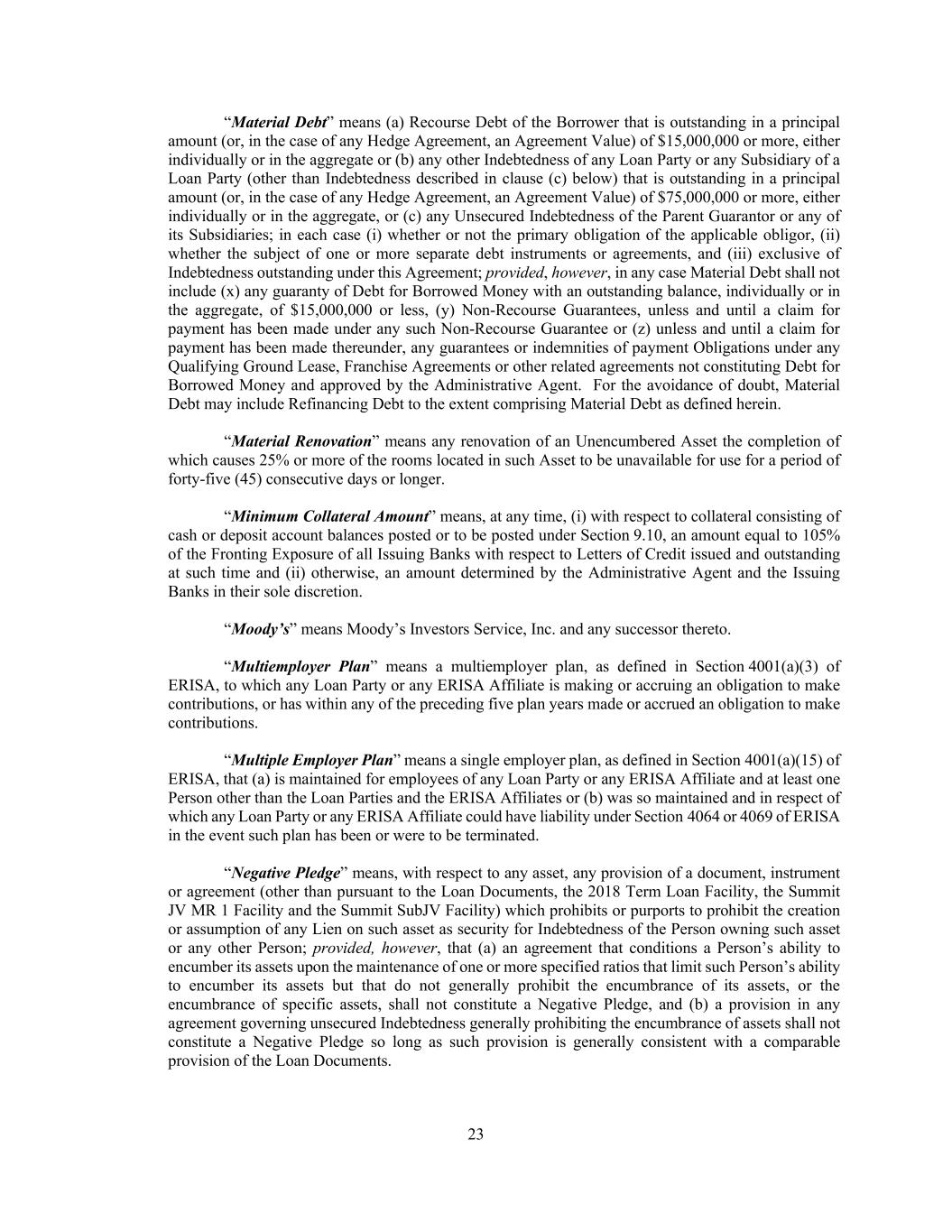 23 “Material Debt” means (a) Recourse Debt of the Borrower that is outstanding in a principal amount (or, in the case of any Hedge Agreement, an Agreement Value) of $15,000,000 or more, either individually or in the aggregate or (b) any other Indebtedness of any Loan Party or any Subsidiary of a Loan Party (other than Indebtedness described in clause (c) below) that is outstanding in a principal amount (or, in the case of any Hedge Agreement, an Agreement Value) of $75,000,000 or more, either individually or in the aggregate, or (c) any Unsecured Indebtedness of the Parent Guarantor or any of its Subsidiaries; in each case (i) whether or not the primary obligation of the applicable obligor, (ii) whether the subject of one or more separate debt instruments or agreements, and (iii) exclusive of Indebtedness outstanding under this Agreement; provided, however, in any case Material Debt shall not include (x) any guaranty of Debt for Borrowed Money with an outstanding balance, individually or in the aggregate, of $15,000,000 or less, (y) Non-Recourse Guarantees, unless and until a claim for payment has been made under any such Non-Recourse Guarantee or (z) unless and until a claim for payment has been made thereunder, any guarantees or indemnities of payment Obligations under any Qualifying Ground Lease, Franchise Agreements or other related agreements not constituting Debt for Borrowed Money and approved by the Administrative Agent. For the avoidance of doubt, Material Debt may include Refinancing Debt to the extent comprising Material Debt as defined herein. “Material Renovation” means any renovation of an Unencumbered Asset the completion of which causes 25% or more of the rooms located in such Asset to be unavailable for use for a period of forty-five (45) consecutive days or longer. “Minimum Collateral Amount” means, at any time, (i) with respect to collateral consisting of cash or deposit account balances posted or to be posted under Section 9.10, an amount equal to 105% of the Fronting Exposure of all Issuing Banks with respect to Letters of Credit issued and outstanding at such time and (ii) otherwise, an amount determined by the Administrative Agent and the Issuing Banks in their sole discretion. “Moody’s” means Moody’s Investors Service, Inc. and any successor thereto. “Multiemployer Plan” means a multiemployer plan, as defined in Section 4001(a)(3) of ERISA, to which any Loan Party or any ERISA Affiliate is making or accruing an obligation to make contributions, or has within any of the preceding five plan years made or accrued an obligation to make contributions. “Multiple Employer Plan” means a single employer plan, as defined in Section 4001(a)(15) of ERISA, that (a) is maintained for employees of any Loan Party or any ERISA Affiliate and at least one Person other than the Loan Parties and the ERISA Affiliates or (b) was so maintained and in respect of which any Loan Party or any ERISA Affiliate could have liability under Section 4064 or 4069 of ERISA in the event such plan has been or were to be terminated. “Negative Pledge” means, with respect to any asset, any provision of a document, instrument or agreement (other than pursuant to the Loan Documents, the 2018 Term Loan Facility, the Summit JV MR 1 Facility and the Summit SubJV Facility) which prohibits or purports to prohibit the creation or assumption of any Lien on such asset as security for Indebtedness of the Person owning such asset or any other Person; provided, however, that (a) an agreement that conditions a Person’s ability to encumber its assets upon the maintenance of one or more specified ratios that limit such Person’s ability to encumber its assets but that do not generally prohibit the encumbrance of its assets, or the encumbrance of specific assets, shall not constitute a Negative Pledge, and (b) a provision in any agreement governing unsecured Indebtedness generally prohibiting the encumbrance of assets shall not constitute a Negative Pledge so long as such provision is generally consistent with a comparable provision of the Loan Documents.