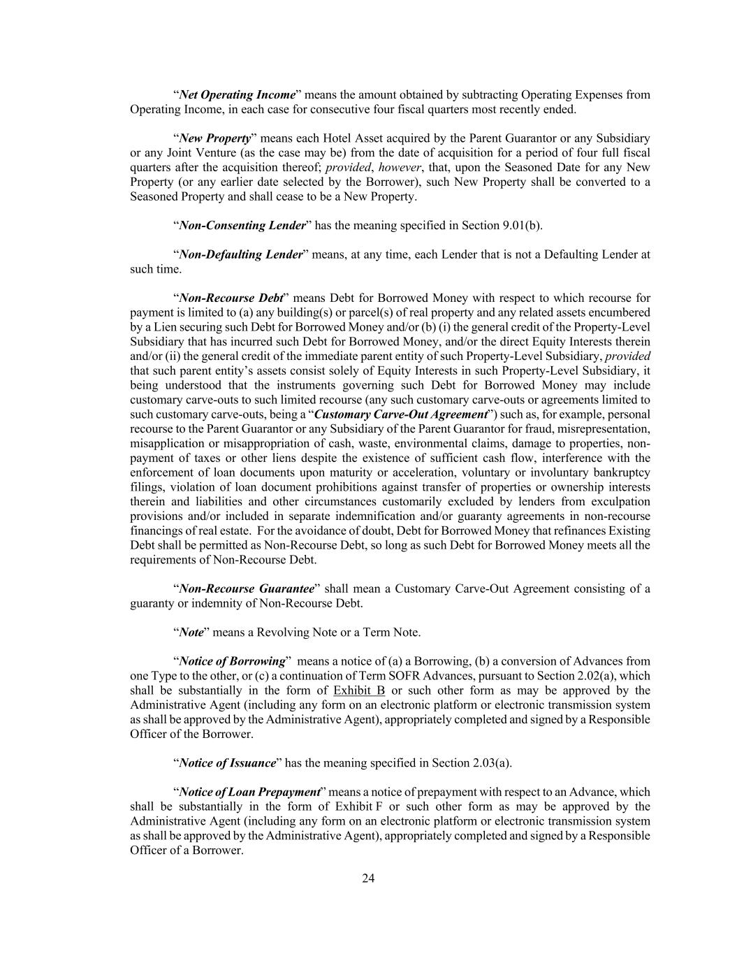 24 “Net Operating Income” means the amount obtained by subtracting Operating Expenses from Operating Income, in each case for consecutive four fiscal quarters most recently ended. “New Property” means each Hotel Asset acquired by the Parent Guarantor or any Subsidiary or any Joint Venture (as the case may be) from the date of acquisition for a period of four full fiscal quarters after the acquisition thereof; provided, however, that, upon the Seasoned Date for any New Property (or any earlier date selected by the Borrower), such New Property shall be converted to a Seasoned Property and shall cease to be a New Property. “Non-Consenting Lender” has the meaning specified in Section 9.01(b). “Non-Defaulting Lender” means, at any time, each Lender that is not a Defaulting Lender at such time. “Non-Recourse Debt” means Debt for Borrowed Money with respect to which recourse for payment is limited to (a) any building(s) or parcel(s) of real property and any related assets encumbered by a Lien securing such Debt for Borrowed Money and/or (b) (i) the general credit of the Property-Level Subsidiary that has incurred such Debt for Borrowed Money, and/or the direct Equity Interests therein and/or (ii) the general credit of the immediate parent entity of such Property-Level Subsidiary, provided that such parent entity’s assets consist solely of Equity Interests in such Property-Level Subsidiary, it being understood that the instruments governing such Debt for Borrowed Money may include customary carve-outs to such limited recourse (any such customary carve-outs or agreements limited to such customary carve-outs, being a “Customary Carve-Out Agreement”) such as, for example, personal recourse to the Parent Guarantor or any Subsidiary of the Parent Guarantor for fraud, misrepresentation, misapplication or misappropriation of cash, waste, environmental claims, damage to properties, non- payment of taxes or other liens despite the existence of sufficient cash flow, interference with the enforcement of loan documents upon maturity or acceleration, voluntary or involuntary bankruptcy filings, violation of loan document prohibitions against transfer of properties or ownership interests therein and liabilities and other circumstances customarily excluded by lenders from exculpation provisions and/or included in separate indemnification and/or guaranty agreements in non-recourse financings of real estate. For the avoidance of doubt, Debt for Borrowed Money that refinances Existing Debt shall be permitted as Non-Recourse Debt, so long as such Debt for Borrowed Money meets all the requirements of Non-Recourse Debt. “Non-Recourse Guarantee” shall mean a Customary Carve-Out Agreement consisting of a guaranty or indemnity of Non-Recourse Debt. “Note” means a Revolving Note or a Term Note. “Notice of Borrowing” means a notice of (a) a Borrowing, (b) a conversion of Advances from one Type to the other, or (c) a continuation of Term SOFR Advances, pursuant to Section 2.02(a), which shall be substantially in the form of Exhibit B or such other form as may be approved by the Administrative Agent (including any form on an electronic platform or electronic transmission system as shall be approved by the Administrative Agent), appropriately completed and signed by a Responsible Officer of the Borrower. “Notice of Issuance” has the meaning specified in Section 2.03(a). “Notice of Loan Prepayment” means a notice of prepayment with respect to an Advance, which shall be substantially in the form of Exhibit F or such other form as may be approved by the Administrative Agent (including any form on an electronic platform or electronic transmission system as shall be approved by the Administrative Agent), appropriately completed and signed by a Responsible Officer of a Borrower.