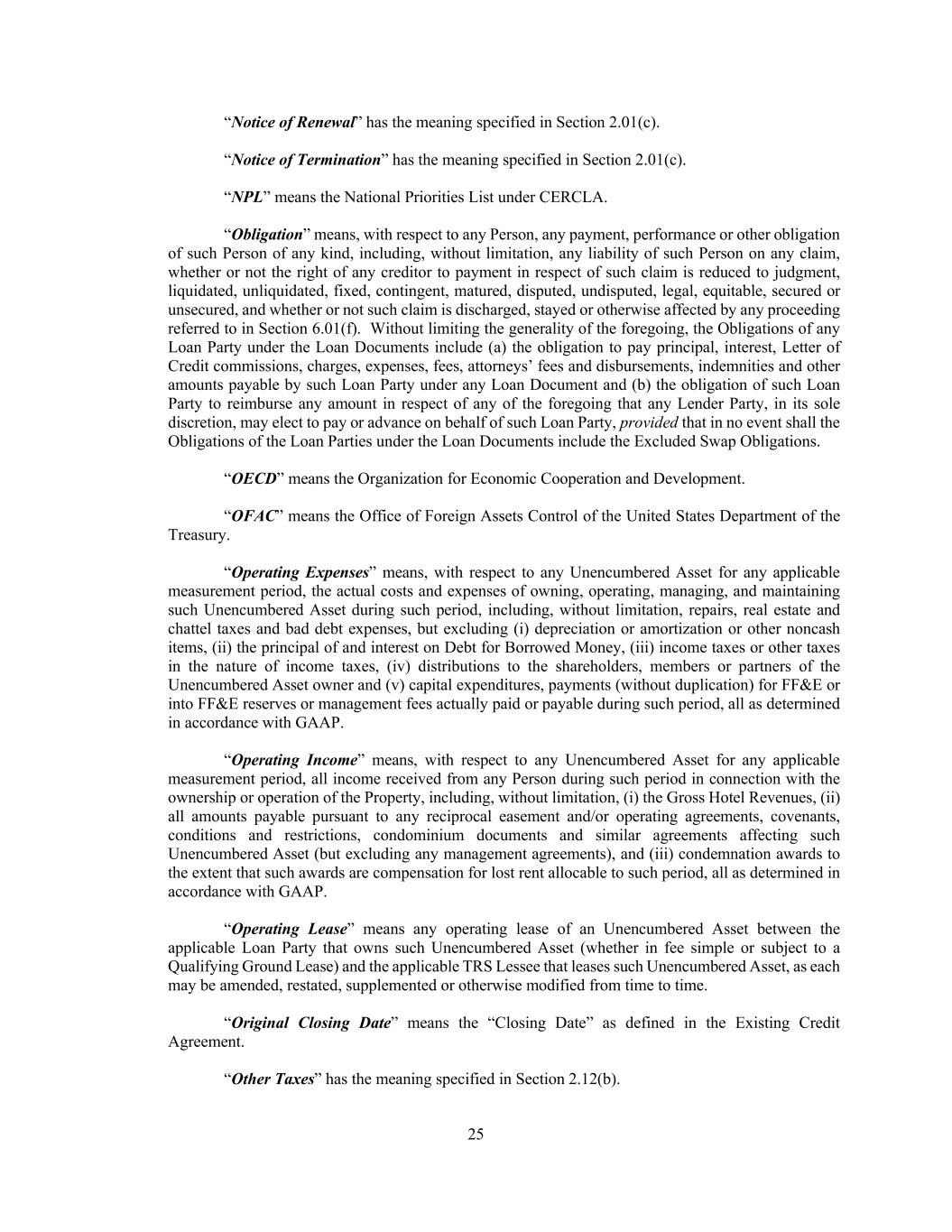 25 “Notice of Renewal” has the meaning specified in Section 2.01(c). “Notice of Termination” has the meaning specified in Section 2.01(c). “NPL” means the National Priorities List under CERCLA. “Obligation” means, with respect to any Person, any payment, performance or other obligation of such Person of any kind, including, without limitation, any liability of such Person on any claim, whether or not the right of any creditor to payment in respect of such claim is reduced to judgment, liquidated, unliquidated, fixed, contingent, matured, disputed, undisputed, legal, equitable, secured or unsecured, and whether or not such claim is discharged, stayed or otherwise affected by any proceeding referred to in Section 6.01(f). Without limiting the generality of the foregoing, the Obligations of any Loan Party under the Loan Documents include (a) the obligation to pay principal, interest, Letter of Credit commissions, charges, expenses, fees, attorneys’ fees and disbursements, indemnities and other amounts payable by such Loan Party under any Loan Document and (b) the obligation of such Loan Party to reimburse any amount in respect of any of the foregoing that any Lender Party, in its sole discretion, may elect to pay or advance on behalf of such Loan Party, provided that in no event shall the Obligations of the Loan Parties under the Loan Documents include the Excluded Swap Obligations. “OECD” means the Organization for Economic Cooperation and Development. “OFAC” means the Office of Foreign Assets Control of the United States Department of the Treasury. “Operating Expenses” means, with respect to any Unencumbered Asset for any applicable measurement period, the actual costs and expenses of owning, operating, managing, and maintaining such Unencumbered Asset during such period, including, without limitation, repairs, real estate and chattel taxes and bad debt expenses, but excluding (i) depreciation or amortization or other noncash items, (ii) the principal of and interest on Debt for Borrowed Money, (iii) income taxes or other taxes in the nature of income taxes, (iv) distributions to the shareholders, members or partners of the Unencumbered Asset owner and (v) capital expenditures, payments (without duplication) for FF&E or into FF&E reserves or management fees actually paid or payable during such period, all as determined in accordance with GAAP. “Operating Income” means, with respect to any Unencumbered Asset for any applicable measurement period, all income received from any Person during such period in connection with the ownership or operation of the Property, including, without limitation, (i) the Gross Hotel Revenues, (ii) all amounts payable pursuant to any reciprocal easement and/or operating agreements, covenants, conditions and restrictions, condominium documents and similar agreements affecting such Unencumbered Asset (but excluding any management agreements), and (iii) condemnation awards to the extent that such awards are compensation for lost rent allocable to such period, all as determined in accordance with GAAP. “Operating Lease” means any operating lease of an Unencumbered Asset between the applicable Loan Party that owns such Unencumbered Asset (whether in fee simple or subject to a Qualifying Ground Lease) and the applicable TRS Lessee that leases such Unencumbered Asset, as each may be amended, restated, supplemented or otherwise modified from time to time. “Original Closing Date” means the “Closing Date” as defined in the Existing Credit Agreement. “Other Taxes” has the meaning specified in Section 2.12(b).