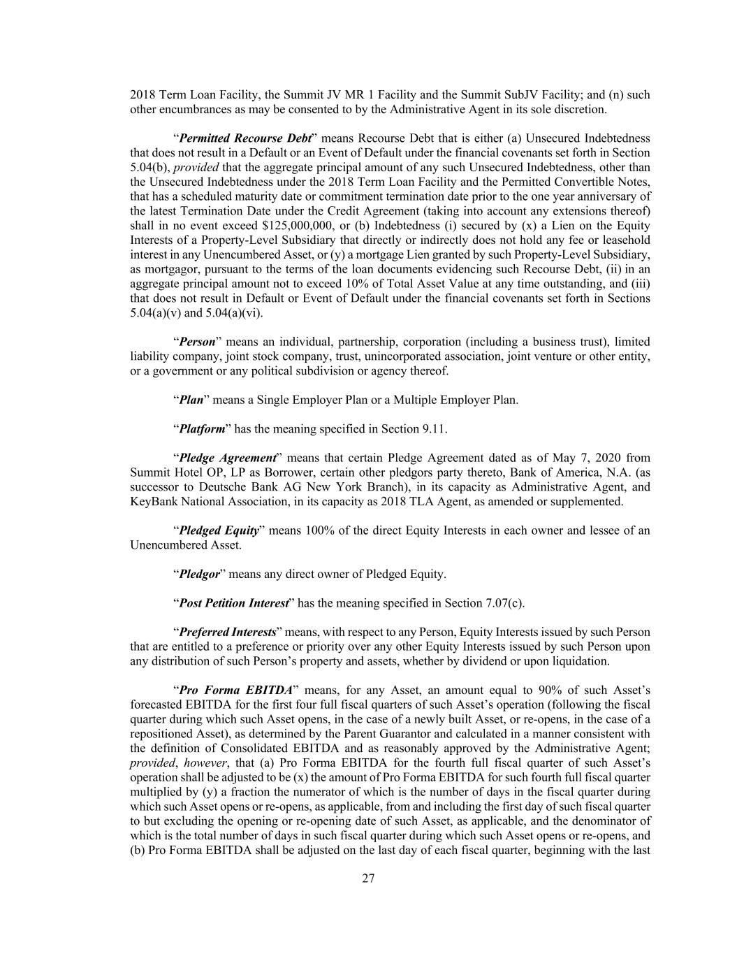 27 2018 Term Loan Facility, the Summit JV MR 1 Facility and the Summit SubJV Facility; and (n) such other encumbrances as may be consented to by the Administrative Agent in its sole discretion. “Permitted Recourse Debt” means Recourse Debt that is either (a) Unsecured Indebtedness that does not result in a Default or an Event of Default under the financial covenants set forth in Section 5.04(b), provided that the aggregate principal amount of any such Unsecured Indebtedness, other than the Unsecured Indebtedness under the 2018 Term Loan Facility and the Permitted Convertible Notes, that has a scheduled maturity date or commitment termination date prior to the one year anniversary of the latest Termination Date under the Credit Agreement (taking into account any extensions thereof) shall in no event exceed $125,000,000, or (b) Indebtedness (i) secured by (x) a Lien on the Equity Interests of a Property-Level Subsidiary that directly or indirectly does not hold any fee or leasehold interest in any Unencumbered Asset, or (y) a mortgage Lien granted by such Property-Level Subsidiary, as mortgagor, pursuant to the terms of the loan documents evidencing such Recourse Debt, (ii) in an aggregate principal amount not to exceed 10% of Total Asset Value at any time outstanding, and (iii) that does not result in Default or Event of Default under the financial covenants set forth in Sections 5.04(a)(v) and 5.04(a)(vi). “Person” means an individual, partnership, corporation (including a business trust), limited liability company, joint stock company, trust, unincorporated association, joint venture or other entity, or a government or any political subdivision or agency thereof. “Plan” means a Single Employer Plan or a Multiple Employer Plan. “Platform” has the meaning specified in Section 9.11. “Pledge Agreement” means that certain Pledge Agreement dated as of May 7, 2020 from Summit Hotel OP, LP as Borrower, certain other pledgors party thereto, Bank of America, N.A. (as successor to Deutsche Bank AG New York Branch), in its capacity as Administrative Agent, and KeyBank National Association, in its capacity as 2018 TLA Agent, as amended or supplemented. “Pledged Equity” means 100% of the direct Equity Interests in each owner and lessee of an Unencumbered Asset. “Pledgor” means any direct owner of Pledged Equity. “Post Petition Interest” has the meaning specified in Section 7.07(c). “Preferred Interests” means, with respect to any Person, Equity Interests issued by such Person that are entitled to a preference or priority over any other Equity Interests issued by such Person upon any distribution of such Person’s property and assets, whether by dividend or upon liquidation. “Pro Forma EBITDA” means, for any Asset, an amount equal to 90% of such Asset’s forecasted EBITDA for the first four full fiscal quarters of such Asset’s operation (following the fiscal quarter during which such Asset opens, in the case of a newly built Asset, or re-opens, in the case of a repositioned Asset), as determined by the Parent Guarantor and calculated in a manner consistent with the definition of Consolidated EBITDA and as reasonably approved by the Administrative Agent; provided, however, that (a) Pro Forma EBITDA for the fourth full fiscal quarter of such Asset’s operation shall be adjusted to be (x) the amount of Pro Forma EBITDA for such fourth full fiscal quarter multiplied by (y) a fraction the numerator of which is the number of days in the fiscal quarter during which such Asset opens or re-opens, as applicable, from and including the first day of such fiscal quarter to but excluding the opening or re-opening date of such Asset, as applicable, and the denominator of which is the total number of days in such fiscal quarter during which such Asset opens or re-opens, and (b) Pro Forma EBITDA shall be adjusted on the last day of each fiscal quarter, beginning with the last