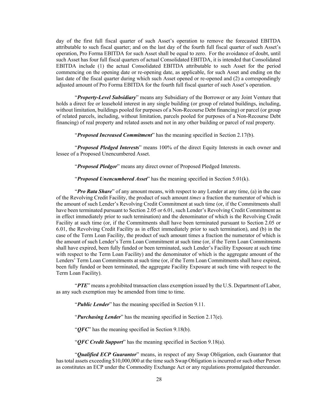 28 day of the first full fiscal quarter of such Asset’s operation to remove the forecasted EBITDA attributable to such fiscal quarter; and on the last day of the fourth full fiscal quarter of such Asset’s operation, Pro Forma EBITDA for such Asset shall be equal to zero. For the avoidance of doubt, until such Asset has four full fiscal quarters of actual Consolidated EBITDA, it is intended that Consolidated EBITDA include (1) the actual Consolidated EBITDA attributable to such Asset for the period commencing on the opening date or re-opening date, as applicable, for such Asset and ending on the last date of the fiscal quarter during which such Asset opened or re-opened and (2) a correspondingly adjusted amount of Pro Forma EBITDA for the fourth full fiscal quarter of such Asset’s operation. “Property-Level Subsidiary” means any Subsidiary of the Borrower or any Joint Venture that holds a direct fee or leasehold interest in any single building (or group of related buildings, including, without limitation, buildings pooled for purposes of a Non-Recourse Debt financing) or parcel (or group of related parcels, including, without limitation, parcels pooled for purposes of a Non-Recourse Debt financing) of real property and related assets and not in any other building or parcel of real property. “Proposed Increased Commitment” has the meaning specified in Section 2.17(b). “Proposed Pledged Interests” means 100% of the direct Equity Interests in each owner and lessee of a Proposed Unencumbered Asset. “Proposed Pledgor” means any direct owner of Proposed Pledged Interests. “Proposed Unencumbered Asset” has the meaning specified in Section 5.01(k). “Pro Rata Share” of any amount means, with respect to any Lender at any time, (a) in the case of the Revolving Credit Facility, the product of such amount times a fraction the numerator of which is the amount of such Lender’s Revolving Credit Commitment at such time (or, if the Commitments shall have been terminated pursuant to Section 2.05 or 6.01, such Lender’s Revolving Credit Commitment as in effect immediately prior to such termination) and the denominator of which is the Revolving Credit Facility at such time (or, if the Commitments shall have been terminated pursuant to Section 2.05 or 6.01, the Revolving Credit Facility as in effect immediately prior to such termination), and (b) in the case of the Term Loan Facility, the product of such amount times a fraction the numerator of which is the amount of such Lender’s Term Loan Commitment at such time (or, if the Term Loan Commitments shall have expired, been fully funded or been terminated, such Lender’s Facility Exposure at such time with respect to the Term Loan Facility) and the denominator of which is the aggregate amount of the Lenders’ Term Loan Commitments at such time (or, if the Term Loan Commitments shall have expired, been fully funded or been terminated, the aggregate Facility Exposure at such time with respect to the Term Loan Facility). “PTE” means a prohibited transaction class exemption issued by the U.S. Department of Labor, as any such exemption may be amended from time to time. “Public Lender” has the meaning specified in Section 9.11. “Purchasing Lender” has the meaning specified in Section 2.17(e). “QFC” has the meaning specified in Section 9.18(b). “QFC Credit Support” has the meaning specified in Section 9.18(a). “Qualified ECP Guarantor” means, in respect of any Swap Obligation, each Guarantor that has total assets exceeding $10,000,000 at the time such Swap Obligation is incurred or such other Person as constitutes an ECP under the Commodity Exchange Act or any regulations promulgated thereunder.