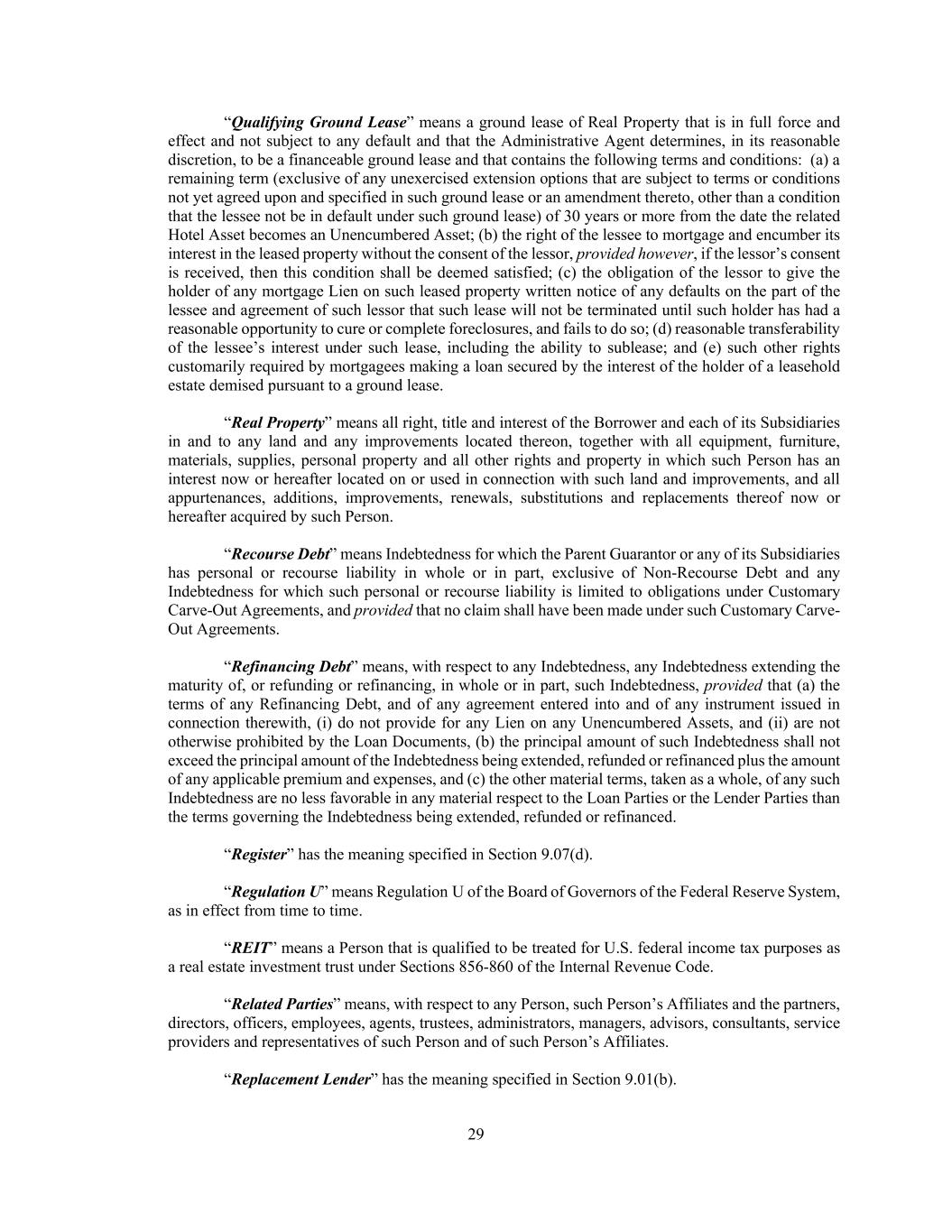 29 “Qualifying Ground Lease” means a ground lease of Real Property that is in full force and effect and not subject to any default and that the Administrative Agent determines, in its reasonable discretion, to be a financeable ground lease and that contains the following terms and conditions: (a) a remaining term (exclusive of any unexercised extension options that are subject to terms or conditions not yet agreed upon and specified in such ground lease or an amendment thereto, other than a condition that the lessee not be in default under such ground lease) of 30 years or more from the date the related Hotel Asset becomes an Unencumbered Asset; (b) the right of the lessee to mortgage and encumber its interest in the leased property without the consent of the lessor, provided however, if the lessor’s consent is received, then this condition shall be deemed satisfied; (c) the obligation of the lessor to give the holder of any mortgage Lien on such leased property written notice of any defaults on the part of the lessee and agreement of such lessor that such lease will not be terminated until such holder has had a reasonable opportunity to cure or complete foreclosures, and fails to do so; (d) reasonable transferability of the lessee’s interest under such lease, including the ability to sublease; and (e) such other rights customarily required by mortgagees making a loan secured by the interest of the holder of a leasehold estate demised pursuant to a ground lease. “Real Property” means all right, title and interest of the Borrower and each of its Subsidiaries in and to any land and any improvements located thereon, together with all equipment, furniture, materials, supplies, personal property and all other rights and property in which such Person has an interest now or hereafter located on or used in connection with such land and improvements, and all appurtenances, additions, improvements, renewals, substitutions and replacements thereof now or hereafter acquired by such Person. “Recourse Debt” means Indebtedness for which the Parent Guarantor or any of its Subsidiaries has personal or recourse liability in whole or in part, exclusive of Non-Recourse Debt and any Indebtedness for which such personal or recourse liability is limited to obligations under Customary Carve-Out Agreements, and provided that no claim shall have been made under such Customary Carve- Out Agreements. “Refinancing Debt” means, with respect to any Indebtedness, any Indebtedness extending the maturity of, or refunding or refinancing, in whole or in part, such Indebtedness, provided that (a) the terms of any Refinancing Debt, and of any agreement entered into and of any instrument issued in connection therewith, (i) do not provide for any Lien on any Unencumbered Assets, and (ii) are not otherwise prohibited by the Loan Documents, (b) the principal amount of such Indebtedness shall not exceed the principal amount of the Indebtedness being extended, refunded or refinanced plus the amount of any applicable premium and expenses, and (c) the other material terms, taken as a whole, of any such Indebtedness are no less favorable in any material respect to the Loan Parties or the Lender Parties than the terms governing the Indebtedness being extended, refunded or refinanced. “Register” has the meaning specified in Section 9.07(d). “Regulation U” means Regulation U of the Board of Governors of the Federal Reserve System, as in effect from time to time. “REIT” means a Person that is qualified to be treated for U.S. federal income tax purposes as a real estate investment trust under Sections 856-860 of the Internal Revenue Code. “Related Parties” means, with respect to any Person, such Person’s Affiliates and the partners, directors, officers, employees, agents, trustees, administrators, managers, advisors, consultants, service providers and representatives of such Person and of such Person’s Affiliates. “Replacement Lender” has the meaning specified in Section 9.01(b).