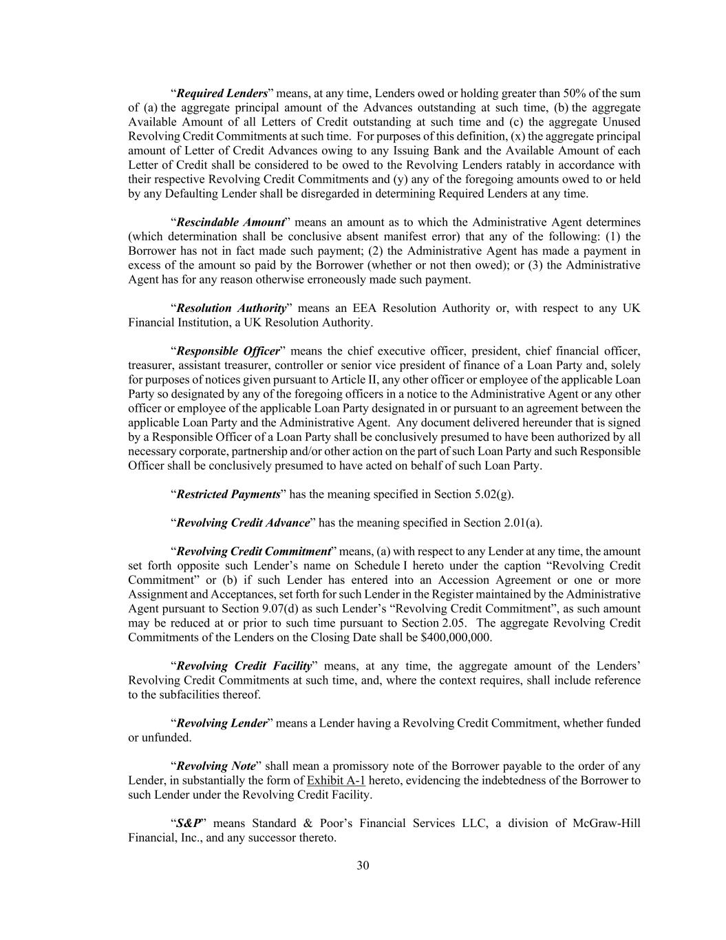 30 “Required Lenders” means, at any time, Lenders owed or holding greater than 50% of the sum of (a) the aggregate principal amount of the Advances outstanding at such time, (b) the aggregate Available Amount of all Letters of Credit outstanding at such time and (c) the aggregate Unused Revolving Credit Commitments at such time. For purposes of this definition, (x) the aggregate principal amount of Letter of Credit Advances owing to any Issuing Bank and the Available Amount of each Letter of Credit shall be considered to be owed to the Revolving Lenders ratably in accordance with their respective Revolving Credit Commitments and (y) any of the foregoing amounts owed to or held by any Defaulting Lender shall be disregarded in determining Required Lenders at any time. “Rescindable Amount” means an amount as to which the Administrative Agent determines (which determination shall be conclusive absent manifest error) that any of the following: (1) the Borrower has not in fact made such payment; (2) the Administrative Agent has made a payment in excess of the amount so paid by the Borrower (whether or not then owed); or (3) the Administrative Agent has for any reason otherwise erroneously made such payment. “Resolution Authority” means an EEA Resolution Authority or, with respect to any UK Financial Institution, a UK Resolution Authority. “Responsible Officer” means the chief executive officer, president, chief financial officer, treasurer, assistant treasurer, controller or senior vice president of finance of a Loan Party and, solely for purposes of notices given pursuant to Article II, any other officer or employee of the applicable Loan Party so designated by any of the foregoing officers in a notice to the Administrative Agent or any other officer or employee of the applicable Loan Party designated in or pursuant to an agreement between the applicable Loan Party and the Administrative Agent. Any document delivered hereunder that is signed by a Responsible Officer of a Loan Party shall be conclusively presumed to have been authorized by all necessary corporate, partnership and/or other action on the part of such Loan Party and such Responsible Officer shall be conclusively presumed to have acted on behalf of such Loan Party. “Restricted Payments” has the meaning specified in Section 5.02(g). “Revolving Credit Advance” has the meaning specified in Section 2.01(a). “Revolving Credit Commitment” means, (a) with respect to any Lender at any time, the amount set forth opposite such Lender’s name on Schedule I hereto under the caption “Revolving Credit Commitment” or (b) if such Lender has entered into an Accession Agreement or one or more Assignment and Acceptances, set forth for such Lender in the Register maintained by the Administrative Agent pursuant to Section 9.07(d) as such Lender’s “Revolving Credit Commitment”, as such amount may be reduced at or prior to such time pursuant to Section 2.05. The aggregate Revolving Credit Commitments of the Lenders on the Closing Date shall be $400,000,000. “Revolving Credit Facility” means, at any time, the aggregate amount of the Lenders’ Revolving Credit Commitments at such time, and, where the context requires, shall include reference to the subfacilities thereof. “Revolving Lender” means a Lender having a Revolving Credit Commitment, whether funded or unfunded. “Revolving Note” shall mean a promissory note of the Borrower payable to the order of any Lender, in substantially the form of Exhibit A-1 hereto, evidencing the indebtedness of the Borrower to such Lender under the Revolving Credit Facility. “S&P” means Standard & Poor’s Financial Services LLC, a division of McGraw-Hill Financial, Inc., and any successor thereto.