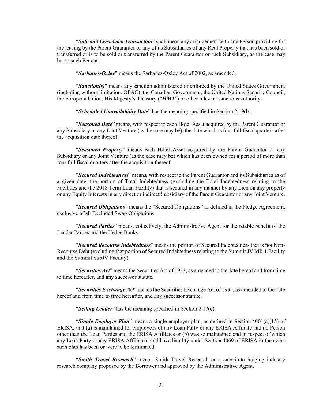 31 “Sale and Leaseback Transaction” shall mean any arrangement with any Person providing for the leasing by the Parent Guarantor or any of its Subsidiaries of any Real Property that has been sold or transferred or is to be sold or transferred by the Parent Guarantor or such Subsidiary, as the case may be, to such Person. “Sarbanes-Oxley” means the Sarbanes-Oxley Act of 2002, as amended. “Sanction(s)” means any sanction administered or enforced by the United States Government (including without limitation, OFAC), the Canadian Government, the United Nations Security Council, the European Union, His Majesty’s Treasury (“HMT”) or other relevant sanctions authority. “Scheduled Unavailability Date” has the meaning specified in Section 2.19(b). “Seasoned Date” means, with respect to each Hotel Asset acquired by the Parent Guarantor or any Subsidiary or any Joint Venture (as the case may be), the date which is four full fiscal quarters after the acquisition date thereof. “Seasoned Property” means each Hotel Asset acquired by the Parent Guarantor or any Subsidiary or any Joint Venture (as the case may be) which has been owned for a period of more than four full fiscal quarters after the acquisition thereof. “Secured Indebtedness” means, with respect to the Parent Guarantor and its Subsidiaries as of a given date, the portion of Total Indebtedness (excluding the Total Indebtedness relating to the Facilities and the 2018 Term Loan Facility) that is secured in any manner by any Lien on any property or any Equity Interests in any direct or indirect Subsidiary of the Parent Guarantor or any Joint Venture. “Secured Obligations” means the “Secured Obligations” as defined in the Pledge Agreement, exclusive of all Excluded Swap Obligations. “Secured Parties” means, collectively, the Administrative Agent for the ratable benefit of the Lender Parties and the Hedge Banks. “Secured Recourse Indebtedness” means the portion of Secured Indebtedness that is not Non- Recourse Debt (excluding that portion of Secured Indebtedness relating to the Summit JV MR 1 Facility and the Summit SubJV Facility). “Securities Act” means the Securities Act of 1933, as amended to the date hereof and from time to time hereafter, and any successor statute. “Securities Exchange Act” means the Securities Exchange Act of 1934, as amended to the date hereof and from time to time hereafter, and any successor statute. “Selling Lender” has the meaning specified in Section 2.17(e). “Single Employer Plan” means a single employer plan, as defined in Section 4001(a)(15) of ERISA, that (a) is maintained for employees of any Loan Party or any ERISA Affiliate and no Person other than the Loan Parties and the ERISA Affiliates or (b) was so maintained and in respect of which any Loan Party or any ERISA Affiliate could have liability under Section 4069 of ERISA in the event such plan has been or were to be terminated. “Smith Travel Research” means Smith Travel Research or a substitute lodging industry research company proposed by the Borrower and approved by the Administrative Agent.
