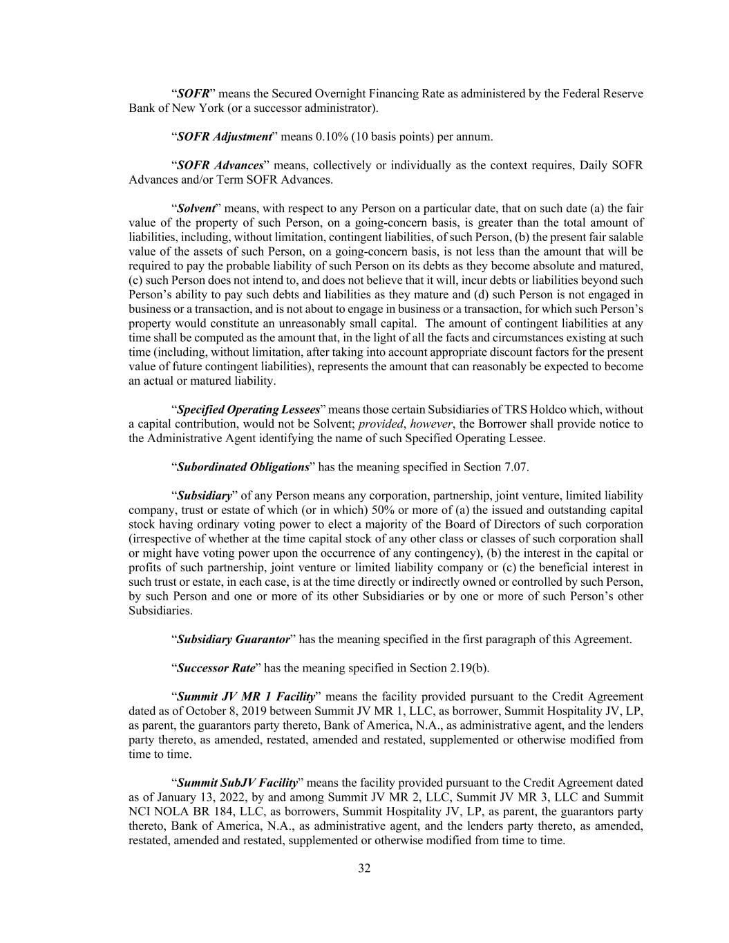 32 “SOFR” means the Secured Overnight Financing Rate as administered by the Federal Reserve Bank of New York (or a successor administrator). “SOFR Adjustment” means 0.10% (10 basis points) per annum. “SOFR Advances” means, collectively or individually as the context requires, Daily SOFR Advances and/or Term SOFR Advances. “Solvent” means, with respect to any Person on a particular date, that on such date (a) the fair value of the property of such Person, on a going-concern basis, is greater than the total amount of liabilities, including, without limitation, contingent liabilities, of such Person, (b) the present fair salable value of the assets of such Person, on a going-concern basis, is not less than the amount that will be required to pay the probable liability of such Person on its debts as they become absolute and matured, (c) such Person does not intend to, and does not believe that it will, incur debts or liabilities beyond such Person’s ability to pay such debts and liabilities as they mature and (d) such Person is not engaged in business or a transaction, and is not about to engage in business or a transaction, for which such Person’s property would constitute an unreasonably small capital. The amount of contingent liabilities at any time shall be computed as the amount that, in the light of all the facts and circumstances existing at such time (including, without limitation, after taking into account appropriate discount factors for the present value of future contingent liabilities), represents the amount that can reasonably be expected to become an actual or matured liability. “Specified Operating Lessees” means those certain Subsidiaries of TRS Holdco which, without a capital contribution, would not be Solvent; provided, however, the Borrower shall provide notice to the Administrative Agent identifying the name of such Specified Operating Lessee. “Subordinated Obligations” has the meaning specified in Section 7.07. “Subsidiary” of any Person means any corporation, partnership, joint venture, limited liability company, trust or estate of which (or in which) 50% or more of (a) the issued and outstanding capital stock having ordinary voting power to elect a majority of the Board of Directors of such corporation (irrespective of whether at the time capital stock of any other class or classes of such corporation shall or might have voting power upon the occurrence of any contingency), (b) the interest in the capital or profits of such partnership, joint venture or limited liability company or (c) the beneficial interest in such trust or estate, in each case, is at the time directly or indirectly owned or controlled by such Person, by such Person and one or more of its other Subsidiaries or by one or more of such Person’s other Subsidiaries. “Subsidiary Guarantor” has the meaning specified in the first paragraph of this Agreement. “Successor Rate” has the meaning specified in Section 2.19(b). “Summit JV MR 1 Facility” means the facility provided pursuant to the Credit Agreement dated as of October 8, 2019 between Summit JV MR 1, LLC, as borrower, Summit Hospitality JV, LP, as parent, the guarantors party thereto, Bank of America, N.A., as administrative agent, and the lenders party thereto, as amended, restated, amended and restated, supplemented or otherwise modified from time to time. “Summit SubJV Facility” means the facility provided pursuant to the Credit Agreement dated as of January 13, 2022, by and among Summit JV MR 2, LLC, Summit JV MR 3, LLC and Summit NCI NOLA BR 184, LLC, as borrowers, Summit Hospitality JV, LP, as parent, the guarantors party thereto, Bank of America, N.A., as administrative agent, and the lenders party thereto, as amended, restated, amended and restated, supplemented or otherwise modified from time to time.