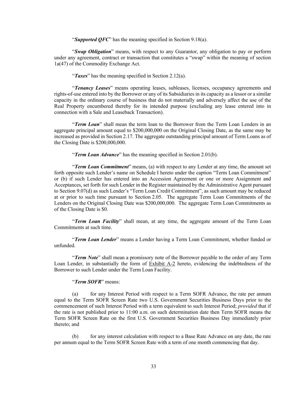 33 “Supported QFC” has the meaning specified in Section 9.18(a). “Swap Obligation” means, with respect to any Guarantor, any obligation to pay or perform under any agreement, contract or transaction that constitutes a “swap” within the meaning of section 1a(47) of the Commodity Exchange Act. “Taxes” has the meaning specified in Section 2.12(a). “Tenancy Leases” means operating leases, subleases, licenses, occupancy agreements and rights-of-use entered into by the Borrower or any of its Subsidiaries in its capacity as a lessor or a similar capacity in the ordinary course of business that do not materially and adversely affect the use of the Real Property encumbered thereby for its intended purpose (excluding any lease entered into in connection with a Sale and Leaseback Transaction). “Term Loan” shall mean the term loan to the Borrower from the Term Loan Lenders in an aggregate principal amount equal to $200,000,000 on the Original Closing Date, as the same may be increased as provided in Section 2.17. The aggregate outstanding principal amount of Term Loans as of the Closing Date is $200,000,000. “Term Loan Advance” has the meaning specified in Section 2.01(b). “Term Loan Commitment” means, (a) with respect to any Lender at any time, the amount set forth opposite such Lender’s name on Schedule I hereto under the caption “Term Loan Commitment” or (b) if such Lender has entered into an Accession Agreement or one or more Assignment and Acceptances, set forth for such Lender in the Register maintained by the Administrative Agent pursuant to Section 9.07(d) as such Lender’s “Term Loan Credit Commitment”, as such amount may be reduced at or prior to such time pursuant to Section 2.05. The aggregate Term Loan Commitments of the Lenders on the Original Closing Date was $200,000,000. The aggregate Term Loan Commitments as of the Closing Date is $0. “Term Loan Facility” shall mean, at any time, the aggregate amount of the Term Loan Commitments at such time. “Term Loan Lender” means a Lender having a Term Loan Commitment, whether funded or unfunded. “Term Note” shall mean a promissory note of the Borrower payable to the order of any Term Loan Lender, in substantially the form of Exhibit A-2 hereto, evidencing the indebtedness of the Borrower to such Lender under the Term Loan Facility. “Term SOFR” means: (a) for any Interest Period with respect to a Term SOFR Advance, the rate per annum equal to the Term SOFR Screen Rate two U.S. Government Securities Business Days prior to the commencement of such Interest Period with a term equivalent to such Interest Period; provided that if the rate is not published prior to 11:00 a.m. on such determination date then Term SOFR means the Term SOFR Screen Rate on the first U.S. Government Securities Business Day immediately prior thereto; and (b) for any interest calculation with respect to a Base Rate Advance on any date, the rate per annum equal to the Term SOFR Screen Rate with a term of one month commencing that day.