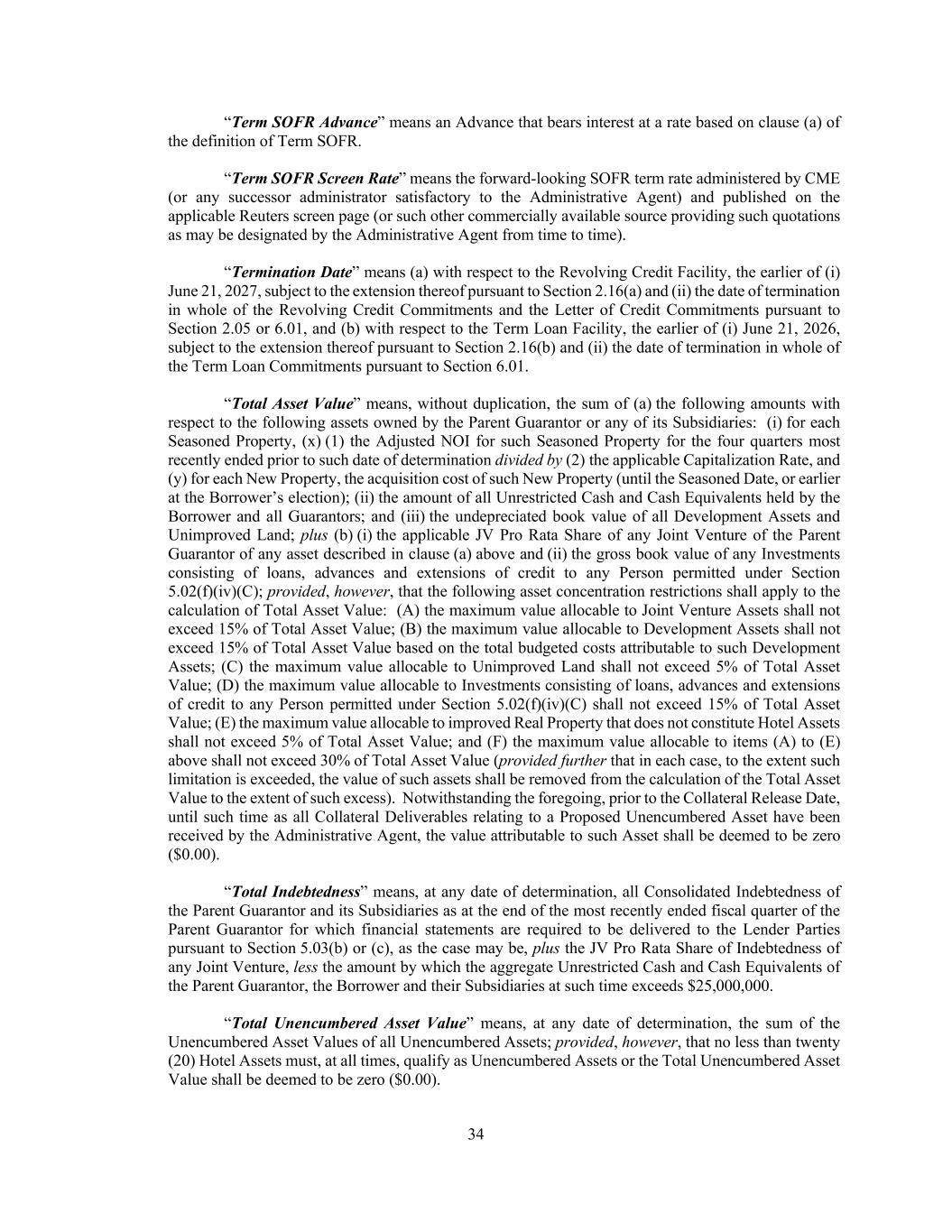 34 “Term SOFR Advance” means an Advance that bears interest at a rate based on clause (a) of the definition of Term SOFR. “Term SOFR Screen Rate” means the forward-looking SOFR term rate administered by CME (or any successor administrator satisfactory to the Administrative Agent) and published on the applicable Reuters screen page (or such other commercially available source providing such quotations as may be designated by the Administrative Agent from time to time). “Termination Date” means (a) with respect to the Revolving Credit Facility, the earlier of (i) June 21, 2027, subject to the extension thereof pursuant to Section 2.16(a) and (ii) the date of termination in whole of the Revolving Credit Commitments and the Letter of Credit Commitments pursuant to Section 2.05 or 6.01, and (b) with respect to the Term Loan Facility, the earlier of (i) June 21, 2026, subject to the extension thereof pursuant to Section 2.16(b) and (ii) the date of termination in whole of the Term Loan Commitments pursuant to Section 6.01. “Total Asset Value” means, without duplication, the sum of (a) the following amounts with respect to the following assets owned by the Parent Guarantor or any of its Subsidiaries: (i) for each Seasoned Property, (x) (1) the Adjusted NOI for such Seasoned Property for the four quarters most recently ended prior to such date of determination divided by (2) the applicable Capitalization Rate, and (y) for each New Property, the acquisition cost of such New Property (until the Seasoned Date, or earlier at the Borrower’s election); (ii) the amount of all Unrestricted Cash and Cash Equivalents held by the Borrower and all Guarantors; and (iii) the undepreciated book value of all Development Assets and Unimproved Land; plus (b) (i) the applicable JV Pro Rata Share of any Joint Venture of the Parent Guarantor of any asset described in clause (a) above and (ii) the gross book value of any Investments consisting of loans, advances and extensions of credit to any Person permitted under Section 5.02(f)(iv)(C); provided, however, that the following asset concentration restrictions shall apply to the calculation of Total Asset Value: (A) the maximum value allocable to Joint Venture Assets shall not exceed 15% of Total Asset Value; (B) the maximum value allocable to Development Assets shall not exceed 15% of Total Asset Value based on the total budgeted costs attributable to such Development Assets; (C) the maximum value allocable to Unimproved Land shall not exceed 5% of Total Asset Value; (D) the maximum value allocable to Investments consisting of loans, advances and extensions of credit to any Person permitted under Section 5.02(f)(iv)(C) shall not exceed 15% of Total Asset Value; (E) the maximum value allocable to improved Real Property that does not constitute Hotel Assets shall not exceed 5% of Total Asset Value; and (F) the maximum value allocable to items (A) to (E) above shall not exceed 30% of Total Asset Value (provided further that in each case, to the extent such limitation is exceeded, the value of such assets shall be removed from the calculation of the Total Asset Value to the extent of such excess). Notwithstanding the foregoing, prior to the Collateral Release Date, until such time as all Collateral Deliverables relating to a Proposed Unencumbered Asset have been received by the Administrative Agent, the value attributable to such Asset shall be deemed to be zero ($0.00). “Total Indebtedness” means, at any date of determination, all Consolidated Indebtedness of the Parent Guarantor and its Subsidiaries as at the end of the most recently ended fiscal quarter of the Parent Guarantor for which financial statements are required to be delivered to the Lender Parties pursuant to Section 5.03(b) or (c), as the case may be, plus the JV Pro Rata Share of Indebtedness of any Joint Venture, less the amount by which the aggregate Unrestricted Cash and Cash Equivalents of the Parent Guarantor, the Borrower and their Subsidiaries at such time exceeds $25,000,000. “Total Unencumbered Asset Value” means, at any date of determination, the sum of the Unencumbered Asset Values of all Unencumbered Assets; provided, however, that no less than twenty (20) Hotel Assets must, at all times, qualify as Unencumbered Assets or the Total Unencumbered Asset Value shall be deemed to be zero ($0.00).