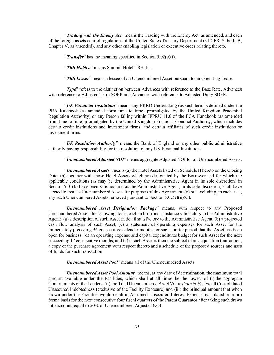 35 “Trading with the Enemy Act” means the Trading with the Enemy Act, as amended, and each of the foreign assets control regulations of the United States Treasury Department (31 CFR, Subtitle B, Chapter V, as amended), and any other enabling legislation or executive order relating thereto. “Transfer” has the meaning specified in Section 5.02(e)(i). “TRS Holdco” means Summit Hotel TRS, Inc. “TRS Lessee” means a lessee of an Unencumbered Asset pursuant to an Operating Lease. “Type” refers to the distinction between Advances with reference to the Base Rate, Advances with reference to Adjusted Term SOFR and Advances with reference to Adjusted Daily SOFR. “UK Financial Institution” means any BRRD Undertaking (as such term is defined under the PRA Rulebook (as amended form time to time) promulgated by the United Kingdom Prudential Regulation Authority) or any Person falling within IFPRU 11.6 of the FCA Handbook (as amended from time to time) promulgated by the United Kingdom Financial Conduct Authority, which includes certain credit institutions and investment firms, and certain affiliates of such credit institutions or investment firms. “UK Resolution Authority” means the Bank of England or any other public administrative authority having responsibility for the resolution of any UK Financial Institution. “Unencumbered Adjusted NOI” means aggregate Adjusted NOI for all Unencumbered Assets. “Unencumbered Assets” means (a) the Hotel Assets listed on Schedule II hereto on the Closing Date, (b) together with those Hotel Assets which are designated by the Borrower and for which the applicable conditions (as may be determined by the Administrative Agent in its sole discretion) in Section 5.01(k) have been satisfied and as the Administrative Agent, in its sole discretion, shall have elected to treat as Unencumbered Assets for purposes of this Agreement, (c) but excluding, in each case, any such Unencumbered Assets removed pursuant to Section 5.02(e)(ii)(C). “Unencumbered Asset Designation Package” means, with respect to any Proposed Unencumbered Asset, the following items, each in form and substance satisfactory to the Administrative Agent: (a) a description of such Asset in detail satisfactory to the Administrative Agent, (b) a projected cash flow analysis of such Asset, (c) a statement of operating expenses for such Asset for the immediately preceding 36 consecutive calendar months, or such shorter period that the Asset has been open for business, (d) an operating expense and capital expenditures budget for such Asset for the next succeeding 12 consecutive months, and (e) if such Asset is then the subject of an acquisition transaction, a copy of the purchase agreement with respect thereto and a schedule of the proposed sources and uses of funds for such transaction. “Unencumbered Asset Pool” means all of the Unencumbered Assets. “Unencumbered Asset Pool Amount” means, at any date of determination, the maximum total amount available under the Facilities, which shall at all times be the lowest of (i) the aggregate Commitments of the Lenders, (ii) the Total Unencumbered Asset Value times 60%, less all Consolidated Unsecured Indebtedness (exclusive of the Facility Exposure) and (iii) the principal amount that when drawn under the Facilities would result in Assumed Unsecured Interest Expense, calculated on a pro forma basis for the next consecutive four fiscal quarters of the Parent Guarantor after taking such draws into account, equal to 50% of Unencumbered Adjusted NOI.