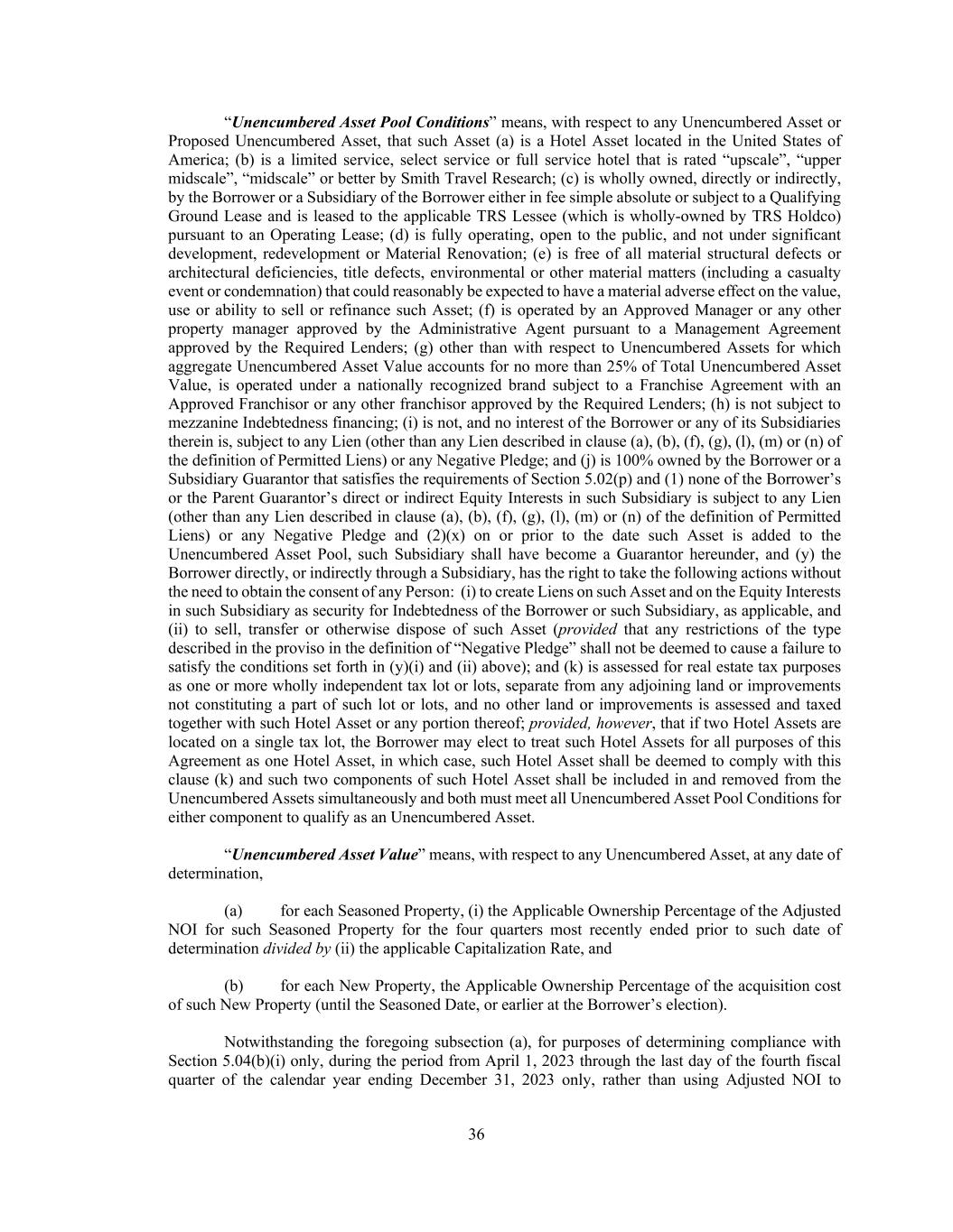 36 “Unencumbered Asset Pool Conditions” means, with respect to any Unencumbered Asset or Proposed Unencumbered Asset, that such Asset (a) is a Hotel Asset located in the United States of America; (b) is a limited service, select service or full service hotel that is rated “upscale”, “upper midscale”, “midscale” or better by Smith Travel Research; (c) is wholly owned, directly or indirectly, by the Borrower or a Subsidiary of the Borrower either in fee simple absolute or subject to a Qualifying Ground Lease and is leased to the applicable TRS Lessee (which is wholly-owned by TRS Holdco) pursuant to an Operating Lease; (d) is fully operating, open to the public, and not under significant development, redevelopment or Material Renovation; (e) is free of all material structural defects or architectural deficiencies, title defects, environmental or other material matters (including a casualty event or condemnation) that could reasonably be expected to have a material adverse effect on the value, use or ability to sell or refinance such Asset; (f) is operated by an Approved Manager or any other property manager approved by the Administrative Agent pursuant to a Management Agreement approved by the Required Lenders; (g) other than with respect to Unencumbered Assets for which aggregate Unencumbered Asset Value accounts for no more than 25% of Total Unencumbered Asset Value, is operated under a nationally recognized brand subject to a Franchise Agreement with an Approved Franchisor or any other franchisor approved by the Required Lenders; (h) is not subject to mezzanine Indebtedness financing; (i) is not, and no interest of the Borrower or any of its Subsidiaries therein is, subject to any Lien (other than any Lien described in clause (a), (b), (f), (g), (l), (m) or (n) of the definition of Permitted Liens) or any Negative Pledge; and (j) is 100% owned by the Borrower or a Subsidiary Guarantor that satisfies the requirements of Section 5.02(p) and (1) none of the Borrower’s or the Parent Guarantor’s direct or indirect Equity Interests in such Subsidiary is subject to any Lien (other than any Lien described in clause (a), (b), (f), (g), (l), (m) or (n) of the definition of Permitted Liens) or any Negative Pledge and (2)(x) on or prior to the date such Asset is added to the Unencumbered Asset Pool, such Subsidiary shall have become a Guarantor hereunder, and (y) the Borrower directly, or indirectly through a Subsidiary, has the right to take the following actions without the need to obtain the consent of any Person: (i) to create Liens on such Asset and on the Equity Interests in such Subsidiary as security for Indebtedness of the Borrower or such Subsidiary, as applicable, and (ii) to sell, transfer or otherwise dispose of such Asset (provided that any restrictions of the type described in the proviso in the definition of “Negative Pledge” shall not be deemed to cause a failure to satisfy the conditions set forth in (y)(i) and (ii) above); and (k) is assessed for real estate tax purposes as one or more wholly independent tax lot or lots, separate from any adjoining land or improvements not constituting a part of such lot or lots, and no other land or improvements is assessed and taxed together with such Hotel Asset or any portion thereof; provided, however, that if two Hotel Assets are located on a single tax lot, the Borrower may elect to treat such Hotel Assets for all purposes of this Agreement as one Hotel Asset, in which case, such Hotel Asset shall be deemed to comply with this clause (k) and such two components of such Hotel Asset shall be included in and removed from the Unencumbered Assets simultaneously and both must meet all Unencumbered Asset Pool Conditions for either component to qualify as an Unencumbered Asset. “Unencumbered Asset Value” means, with respect to any Unencumbered Asset, at any date of determination, (a) for each Seasoned Property, (i) the Applicable Ownership Percentage of the Adjusted NOI for such Seasoned Property for the four quarters most recently ended prior to such date of determination divided by (ii) the applicable Capitalization Rate, and (b) for each New Property, the Applicable Ownership Percentage of the acquisition cost of such New Property (until the Seasoned Date, or earlier at the Borrower’s election). Notwithstanding the foregoing subsection (a), for purposes of determining compliance with Section 5.04(b)(i) only, during the period from April 1, 2023 through the last day of the fourth fiscal quarter of the calendar year ending December 31, 2023 only, rather than using Adjusted NOI to
