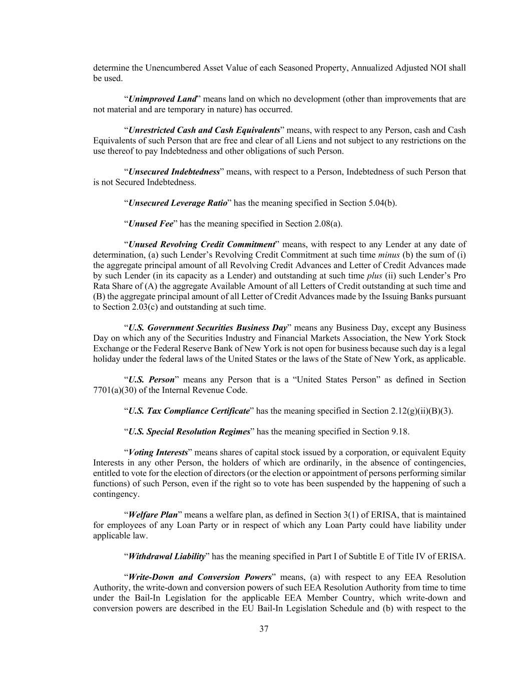 37 determine the Unencumbered Asset Value of each Seasoned Property, Annualized Adjusted NOI shall be used. “Unimproved Land” means land on which no development (other than improvements that are not material and are temporary in nature) has occurred. “Unrestricted Cash and Cash Equivalents” means, with respect to any Person, cash and Cash Equivalents of such Person that are free and clear of all Liens and not subject to any restrictions on the use thereof to pay Indebtedness and other obligations of such Person. “Unsecured Indebtedness” means, with respect to a Person, Indebtedness of such Person that is not Secured Indebtedness. “Unsecured Leverage Ratio” has the meaning specified in Section 5.04(b). “Unused Fee” has the meaning specified in Section 2.08(a). “Unused Revolving Credit Commitment” means, with respect to any Lender at any date of determination, (a) such Lender’s Revolving Credit Commitment at such time minus (b) the sum of (i) the aggregate principal amount of all Revolving Credit Advances and Letter of Credit Advances made by such Lender (in its capacity as a Lender) and outstanding at such time plus (ii) such Lender’s Pro Rata Share of (A) the aggregate Available Amount of all Letters of Credit outstanding at such time and (B) the aggregate principal amount of all Letter of Credit Advances made by the Issuing Banks pursuant to Section 2.03(c) and outstanding at such time. “U.S. Government Securities Business Day” means any Business Day, except any Business Day on which any of the Securities Industry and Financial Markets Association, the New York Stock Exchange or the Federal Reserve Bank of New York is not open for business because such day is a legal holiday under the federal laws of the United States or the laws of the State of New York, as applicable. “U.S. Person” means any Person that is a “United States Person” as defined in Section 7701(a)(30) of the Internal Revenue Code. “U.S. Tax Compliance Certificate” has the meaning specified in Section 2.12(g)(ii)(B)(3). “U.S. Special Resolution Regimes” has the meaning specified in Section 9.18. “Voting Interests” means shares of capital stock issued by a corporation, or equivalent Equity Interests in any other Person, the holders of which are ordinarily, in the absence of contingencies, entitled to vote for the election of directors (or the election or appointment of persons performing similar functions) of such Person, even if the right so to vote has been suspended by the happening of such a contingency. “Welfare Plan” means a welfare plan, as defined in Section 3(1) of ERISA, that is maintained for employees of any Loan Party or in respect of which any Loan Party could have liability under applicable law. “Withdrawal Liability” has the meaning specified in Part I of Subtitle E of Title IV of ERISA. “Write-Down and Conversion Powers” means, (a) with respect to any EEA Resolution Authority, the write-down and conversion powers of such EEA Resolution Authority from time to time under the Bail-In Legislation for the applicable EEA Member Country, which write-down and conversion powers are described in the EU Bail-In Legislation Schedule and (b) with respect to the
