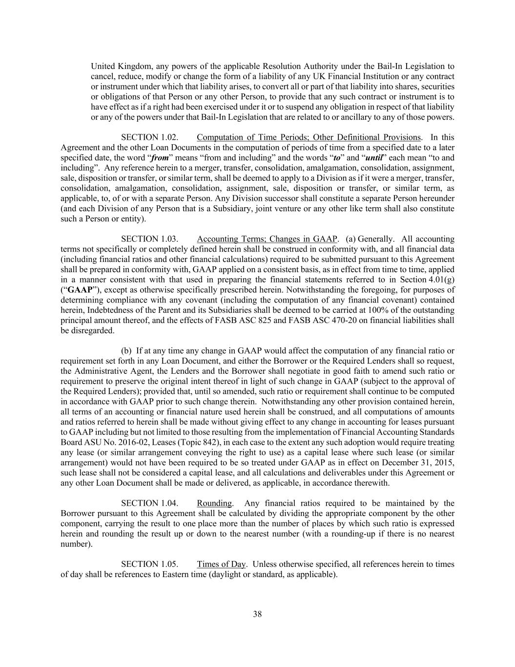 38 United Kingdom, any powers of the applicable Resolution Authority under the Bail-In Legislation to cancel, reduce, modify or change the form of a liability of any UK Financial Institution or any contract or instrument under which that liability arises, to convert all or part of that liability into shares, securities or obligations of that Person or any other Person, to provide that any such contract or instrument is to have effect as if a right had been exercised under it or to suspend any obligation in respect of that liability or any of the powers under that Bail-In Legislation that are related to or ancillary to any of those powers. SECTION 1.02. Computation of Time Periods; Other Definitional Provisions. In this Agreement and the other Loan Documents in the computation of periods of time from a specified date to a later specified date, the word “from” means “from and including” and the words “to” and “until” each mean “to and including”. Any reference herein to a merger, transfer, consolidation, amalgamation, consolidation, assignment, sale, disposition or transfer, or similar term, shall be deemed to apply to a Division as if it were a merger, transfer, consolidation, amalgamation, consolidation, assignment, sale, disposition or transfer, or similar term, as applicable, to, of or with a separate Person. Any Division successor shall constitute a separate Person hereunder (and each Division of any Person that is a Subsidiary, joint venture or any other like term shall also constitute such a Person or entity). SECTION 1.03. Accounting Terms; Changes in GAAP. (a) Generally. All accounting terms not specifically or completely defined herein shall be construed in conformity with, and all financial data (including financial ratios and other financial calculations) required to be submitted pursuant to this Agreement shall be prepared in conformity with, GAAP applied on a consistent basis, as in effect from time to time, applied in a manner consistent with that used in preparing the financial statements referred to in Section 4.01(g) (“GAAP”), except as otherwise specifically prescribed herein. Notwithstanding the foregoing, for purposes of determining compliance with any covenant (including the computation of any financial covenant) contained herein, Indebtedness of the Parent and its Subsidiaries shall be deemed to be carried at 100% of the outstanding principal amount thereof, and the effects of FASB ASC 825 and FASB ASC 470-20 on financial liabilities shall be disregarded. (b) If at any time any change in GAAP would affect the computation of any financial ratio or requirement set forth in any Loan Document, and either the Borrower or the Required Lenders shall so request, the Administrative Agent, the Lenders and the Borrower shall negotiate in good faith to amend such ratio or requirement to preserve the original intent thereof in light of such change in GAAP (subject to the approval of the Required Lenders); provided that, until so amended, such ratio or requirement shall continue to be computed in accordance with GAAP prior to such change therein. Notwithstanding any other provision contained herein, all terms of an accounting or financial nature used herein shall be construed, and all computations of amounts and ratios referred to herein shall be made without giving effect to any change in accounting for leases pursuant to GAAP including but not limited to those resulting from the implementation of Financial Accounting Standards Board ASU No. 2016-02, Leases (Topic 842), in each case to the extent any such adoption would require treating any lease (or similar arrangement conveying the right to use) as a capital lease where such lease (or similar arrangement) would not have been required to be so treated under GAAP as in effect on December 31, 2015, such lease shall not be considered a capital lease, and all calculations and deliverables under this Agreement or any other Loan Document shall be made or delivered, as applicable, in accordance therewith. SECTION 1.04. Rounding. Any financial ratios required to be maintained by the Borrower pursuant to this Agreement shall be calculated by dividing the appropriate component by the other component, carrying the result to one place more than the number of places by which such ratio is expressed herein and rounding the result up or down to the nearest number (with a rounding-up if there is no nearest number). SECTION 1.05. Times of Day. Unless otherwise specified, all references herein to times of day shall be references to Eastern time (daylight or standard, as applicable).