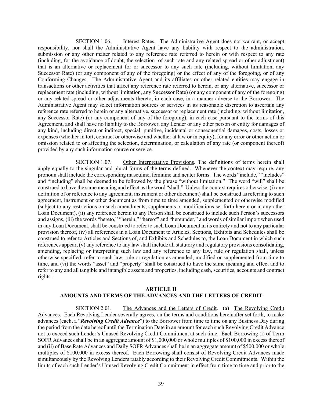 39 SECTION 1.06. Interest Rates. The Administrative Agent does not warrant, or accept responsibility, nor shall the Administrative Agent have any liability with respect to the administration, submission or any other matter related to any reference rate referred to herein or with respect to any rate (including, for the avoidance of doubt, the selection of such rate and any related spread or other adjustment) that is an alternative or replacement for or successor to any such rate (including, without limitation, any Successor Rate) (or any component of any of the foregoing) or the effect of any of the foregoing, or of any Conforming Changes. The Administrative Agent and its affiliates or other related entities may engage in transactions or other activities that affect any reference rate referred to herein, or any alternative, successor or replacement rate (including, without limitation, any Successor Rate) (or any component of any of the foregoing) or any related spread or other adjustments thereto, in each case, in a manner adverse to the Borrower. The Administrative Agent may select information sources or services in its reasonable discretion to ascertain any reference rate referred to herein or any alternative, successor or replacement rate (including, without limitation, any Successor Rate) (or any component of any of the foregoing), in each case pursuant to the terms of this Agreement, and shall have no liability to the Borrower, any Lender or any other person or entity for damages of any kind, including direct or indirect, special, punitive, incidental or consequential damages, costs, losses or expenses (whether in tort, contract or otherwise and whether at law or in equity), for any error or other action or omission related to or affecting the selection, determination, or calculation of any rate (or component thereof) provided by any such information source or service. SECTION 1.07. Other Interpretative Provisions. The definitions of terms herein shall apply equally to the singular and plural forms of the terms defined. Whenever the context may require, any pronoun shall include the corresponding masculine, feminine and neuter forms. The words “include,” “includes” and “including” shall be deemed to be followed by the phrase “without limitation.” The word “will” shall be construed to have the same meaning and effect as the word “shall.” Unless the context requires otherwise, (i) any definition of or reference to any agreement, instrument or other document) shall be construed as referring to such agreement, instrument or other document as from time to time amended, supplemented or otherwise modified (subject to any restrictions on such amendments, supplements or modifications set forth herein or in any other Loan Document), (ii) any reference herein to any Person shall be construed to include such Person’s successors and assigns, (iii) the words “hereto,” “herein,” “hereof” and “hereunder,” and words of similar import when used in any Loan Document, shall be construed to refer to such Loan Document in its entirety and not to any particular provision thereof, (iv) all references in a Loan Document to Articles, Sections, Exhibits and Schedules shall be construed to refer to Articles and Sections of, and Exhibits and Schedules to, the Loan Document in which such references appear, (v) any reference to any law shall include all statutory and regulatory provisions consolidating, amending, replacing or interpreting such law and any reference to any law, rule or regulation shall, unless otherwise specified, refer to such law, rule or regulation as amended, modified or supplemented from time to time, and (vi) the words “asset” and “property” shall be construed to have the same meaning and effect and to refer to any and all tangible and intangible assets and properties, including cash, securities, accounts and contract rights. ARTICLE II AMOUNTS AND TERMS OF THE ADVANCES AND THE LETTERS OF CREDIT SECTION 2.01. The Advances and the Letters of Credit. (a) The Revolving Credit Advances. Each Revolving Lender severally agrees, on the terms and conditions hereinafter set forth, to make advances (each, a “Revolving Credit Advance”) to the Borrower from time to time on any Business Day during the period from the date hereof until the Termination Date in an amount for each such Revolving Credit Advance not to exceed such Lender’s Unused Revolving Credit Commitment at such time. Each Borrowing (i) of Term SOFR Advances shall be in an aggregate amount of $1,000,000 or whole multiples of $100,000 in excess thereof and (ii) of Base Rate Advances and Daily SOFR Advances shall be in an aggregate amount of $500,000 or whole multiples of $100,000 in excess thereof. Each Borrowing shall consist of Revolving Credit Advances made simultaneously by the Revolving Lenders ratably according to their Revolving Credit Commitments. Within the limits of each such Lender’s Unused Revolving Credit Commitment in effect from time to time and prior to the