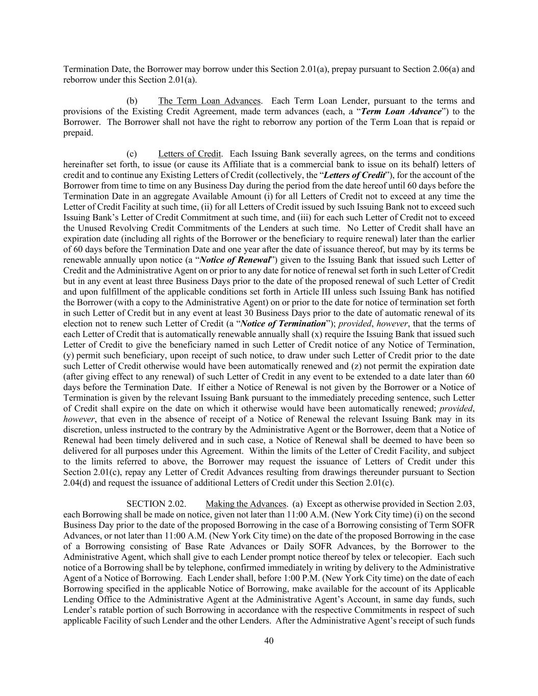 40 Termination Date, the Borrower may borrow under this Section 2.01(a), prepay pursuant to Section 2.06(a) and reborrow under this Section 2.01(a). (b) The Term Loan Advances. Each Term Loan Lender, pursuant to the terms and provisions of the Existing Credit Agreement, made term advances (each, a “Term Loan Advance”) to the Borrower. The Borrower shall not have the right to reborrow any portion of the Term Loan that is repaid or prepaid. (c) Letters of Credit. Each Issuing Bank severally agrees, on the terms and conditions hereinafter set forth, to issue (or cause its Affiliate that is a commercial bank to issue on its behalf) letters of credit and to continue any Existing Letters of Credit (collectively, the “Letters of Credit”), for the account of the Borrower from time to time on any Business Day during the period from the date hereof until 60 days before the Termination Date in an aggregate Available Amount (i) for all Letters of Credit not to exceed at any time the Letter of Credit Facility at such time, (ii) for all Letters of Credit issued by such Issuing Bank not to exceed such Issuing Bank’s Letter of Credit Commitment at such time, and (iii) for each such Letter of Credit not to exceed the Unused Revolving Credit Commitments of the Lenders at such time. No Letter of Credit shall have an expiration date (including all rights of the Borrower or the beneficiary to require renewal) later than the earlier of 60 days before the Termination Date and one year after the date of issuance thereof, but may by its terms be renewable annually upon notice (a “Notice of Renewal”) given to the Issuing Bank that issued such Letter of Credit and the Administrative Agent on or prior to any date for notice of renewal set forth in such Letter of Credit but in any event at least three Business Days prior to the date of the proposed renewal of such Letter of Credit and upon fulfillment of the applicable conditions set forth in Article III unless such Issuing Bank has notified the Borrower (with a copy to the Administrative Agent) on or prior to the date for notice of termination set forth in such Letter of Credit but in any event at least 30 Business Days prior to the date of automatic renewal of its election not to renew such Letter of Credit (a “Notice of Termination”); provided, however, that the terms of each Letter of Credit that is automatically renewable annually shall (x) require the Issuing Bank that issued such Letter of Credit to give the beneficiary named in such Letter of Credit notice of any Notice of Termination, (y) permit such beneficiary, upon receipt of such notice, to draw under such Letter of Credit prior to the date such Letter of Credit otherwise would have been automatically renewed and (z) not permit the expiration date (after giving effect to any renewal) of such Letter of Credit in any event to be extended to a date later than 60 days before the Termination Date. If either a Notice of Renewal is not given by the Borrower or a Notice of Termination is given by the relevant Issuing Bank pursuant to the immediately preceding sentence, such Letter of Credit shall expire on the date on which it otherwise would have been automatically renewed; provided, however, that even in the absence of receipt of a Notice of Renewal the relevant Issuing Bank may in its discretion, unless instructed to the contrary by the Administrative Agent or the Borrower, deem that a Notice of Renewal had been timely delivered and in such case, a Notice of Renewal shall be deemed to have been so delivered for all purposes under this Agreement. Within the limits of the Letter of Credit Facility, and subject to the limits referred to above, the Borrower may request the issuance of Letters of Credit under this Section 2.01(c), repay any Letter of Credit Advances resulting from drawings thereunder pursuant to Section 2.04(d) and request the issuance of additional Letters of Credit under this Section 2.01(c). SECTION 2.02. Making the Advances. (a) Except as otherwise provided in Section 2.03, each Borrowing shall be made on notice, given not later than 11:00 A.M. (New York City time) (i) on the second Business Day prior to the date of the proposed Borrowing in the case of a Borrowing consisting of Term SOFR Advances, or not later than 11:00 A.M. (New York City time) on the date of the proposed Borrowing in the case of a Borrowing consisting of Base Rate Advances or Daily SOFR Advances, by the Borrower to the Administrative Agent, which shall give to each Lender prompt notice thereof by telex or telecopier. Each such notice of a Borrowing shall be by telephone, confirmed immediately in writing by delivery to the Administrative Agent of a Notice of Borrowing. Each Lender shall, before 1:00 P.M. (New York City time) on the date of each Borrowing specified in the applicable Notice of Borrowing, make available for the account of its Applicable Lending Office to the Administrative Agent at the Administrative Agent’s Account, in same day funds, such Lender’s ratable portion of such Borrowing in accordance with the respective Commitments in respect of such applicable Facility of such Lender and the other Lenders. After the Administrative Agent’s receipt of such funds
