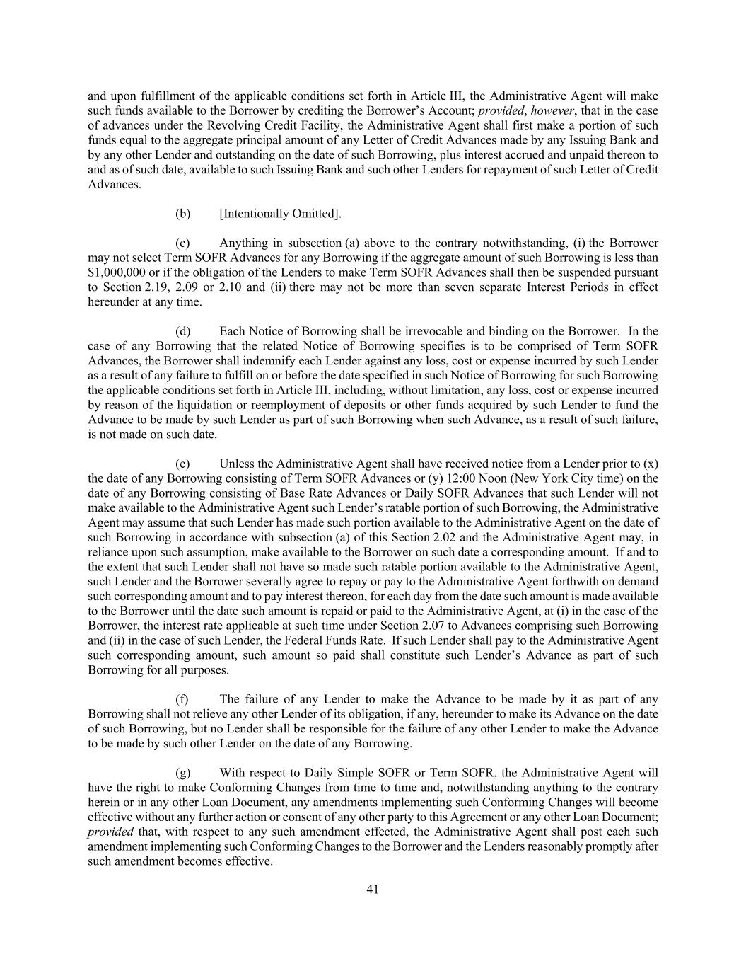 41 and upon fulfillment of the applicable conditions set forth in Article III, the Administrative Agent will make such funds available to the Borrower by crediting the Borrower’s Account; provided, however, that in the case of advances under the Revolving Credit Facility, the Administrative Agent shall first make a portion of such funds equal to the aggregate principal amount of any Letter of Credit Advances made by any Issuing Bank and by any other Lender and outstanding on the date of such Borrowing, plus interest accrued and unpaid thereon to and as of such date, available to such Issuing Bank and such other Lenders for repayment of such Letter of Credit Advances. (b) [Intentionally Omitted]. (c) Anything in subsection (a) above to the contrary notwithstanding, (i) the Borrower may not select Term SOFR Advances for any Borrowing if the aggregate amount of such Borrowing is less than $1,000,000 or if the obligation of the Lenders to make Term SOFR Advances shall then be suspended pursuant to Section 2.19, 2.09 or 2.10 and (ii) there may not be more than seven separate Interest Periods in effect hereunder at any time. (d) Each Notice of Borrowing shall be irrevocable and binding on the Borrower. In the case of any Borrowing that the related Notice of Borrowing specifies is to be comprised of Term SOFR Advances, the Borrower shall indemnify each Lender against any loss, cost or expense incurred by such Lender as a result of any failure to fulfill on or before the date specified in such Notice of Borrowing for such Borrowing the applicable conditions set forth in Article III, including, without limitation, any loss, cost or expense incurred by reason of the liquidation or reemployment of deposits or other funds acquired by such Lender to fund the Advance to be made by such Lender as part of such Borrowing when such Advance, as a result of such failure, is not made on such date. (e) Unless the Administrative Agent shall have received notice from a Lender prior to (x) the date of any Borrowing consisting of Term SOFR Advances or (y) 12:00 Noon (New York City time) on the date of any Borrowing consisting of Base Rate Advances or Daily SOFR Advances that such Lender will not make available to the Administrative Agent such Lender’s ratable portion of such Borrowing, the Administrative Agent may assume that such Lender has made such portion available to the Administrative Agent on the date of such Borrowing in accordance with subsection (a) of this Section 2.02 and the Administrative Agent may, in reliance upon such assumption, make available to the Borrower on such date a corresponding amount. If and to the extent that such Lender shall not have so made such ratable portion available to the Administrative Agent, such Lender and the Borrower severally agree to repay or pay to the Administrative Agent forthwith on demand such corresponding amount and to pay interest thereon, for each day from the date such amount is made available to the Borrower until the date such amount is repaid or paid to the Administrative Agent, at (i) in the case of the Borrower, the interest rate applicable at such time under Section 2.07 to Advances comprising such Borrowing and (ii) in the case of such Lender, the Federal Funds Rate. If such Lender shall pay to the Administrative Agent such corresponding amount, such amount so paid shall constitute such Lender’s Advance as part of such Borrowing for all purposes. (f) The failure of any Lender to make the Advance to be made by it as part of any Borrowing shall not relieve any other Lender of its obligation, if any, hereunder to make its Advance on the date of such Borrowing, but no Lender shall be responsible for the failure of any other Lender to make the Advance to be made by such other Lender on the date of any Borrowing. (g) With respect to Daily Simple SOFR or Term SOFR, the Administrative Agent will have the right to make Conforming Changes from time to time and, notwithstanding anything to the contrary herein or in any other Loan Document, any amendments implementing such Conforming Changes will become effective without any further action or consent of any other party to this Agreement or any other Loan Document; provided that, with respect to any such amendment effected, the Administrative Agent shall post each such amendment implementing such Conforming Changes to the Borrower and the Lenders reasonably promptly after such amendment becomes effective.