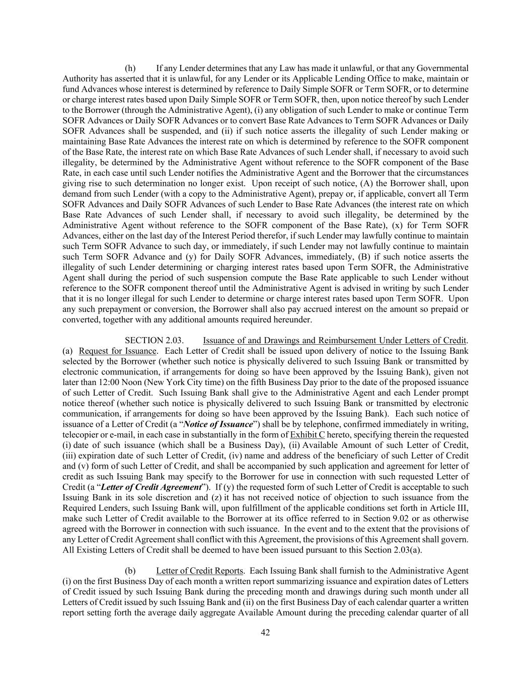 42 (h) If any Lender determines that any Law has made it unlawful, or that any Governmental Authority has asserted that it is unlawful, for any Lender or its Applicable Lending Office to make, maintain or fund Advances whose interest is determined by reference to Daily Simple SOFR or Term SOFR, or to determine or charge interest rates based upon Daily Simple SOFR or Term SOFR, then, upon notice thereof by such Lender to the Borrower (through the Administrative Agent), (i) any obligation of such Lender to make or continue Term SOFR Advances or Daily SOFR Advances or to convert Base Rate Advances to Term SOFR Advances or Daily SOFR Advances shall be suspended, and (ii) if such notice asserts the illegality of such Lender making or maintaining Base Rate Advances the interest rate on which is determined by reference to the SOFR component of the Base Rate, the interest rate on which Base Rate Advances of such Lender shall, if necessary to avoid such illegality, be determined by the Administrative Agent without reference to the SOFR component of the Base Rate, in each case until such Lender notifies the Administrative Agent and the Borrower that the circumstances giving rise to such determination no longer exist. Upon receipt of such notice, (A) the Borrower shall, upon demand from such Lender (with a copy to the Administrative Agent), prepay or, if applicable, convert all Term SOFR Advances and Daily SOFR Advances of such Lender to Base Rate Advances (the interest rate on which Base Rate Advances of such Lender shall, if necessary to avoid such illegality, be determined by the Administrative Agent without reference to the SOFR component of the Base Rate), (x) for Term SOFR Advances, either on the last day of the Interest Period therefor, if such Lender may lawfully continue to maintain such Term SOFR Advance to such day, or immediately, if such Lender may not lawfully continue to maintain such Term SOFR Advance and (y) for Daily SOFR Advances, immediately, (B) if such notice asserts the illegality of such Lender determining or charging interest rates based upon Term SOFR, the Administrative Agent shall during the period of such suspension compute the Base Rate applicable to such Lender without reference to the SOFR component thereof until the Administrative Agent is advised in writing by such Lender that it is no longer illegal for such Lender to determine or charge interest rates based upon Term SOFR. Upon any such prepayment or conversion, the Borrower shall also pay accrued interest on the amount so prepaid or converted, together with any additional amounts required hereunder. SECTION 2.03. Issuance of and Drawings and Reimbursement Under Letters of Credit. (a) Request for Issuance. Each Letter of Credit shall be issued upon delivery of notice to the Issuing Bank selected by the Borrower (whether such notice is physically delivered to such Issuing Bank or transmitted by electronic communication, if arrangements for doing so have been approved by the Issuing Bank), given not later than 12:00 Noon (New York City time) on the fifth Business Day prior to the date of the proposed issuance of such Letter of Credit. Such Issuing Bank shall give to the Administrative Agent and each Lender prompt notice thereof (whether such notice is physically delivered to such Issuing Bank or transmitted by electronic communication, if arrangements for doing so have been approved by the Issuing Bank). Each such notice of issuance of a Letter of Credit (a “Notice of Issuance”) shall be by telephone, confirmed immediately in writing, telecopier or e-mail, in each case in substantially in the form of Exhibit C hereto, specifying therein the requested (i) date of such issuance (which shall be a Business Day), (ii) Available Amount of such Letter of Credit, (iii) expiration date of such Letter of Credit, (iv) name and address of the beneficiary of such Letter of Credit and (v) form of such Letter of Credit, and shall be accompanied by such application and agreement for letter of credit as such Issuing Bank may specify to the Borrower for use in connection with such requested Letter of Credit (a “Letter of Credit Agreement”). If (y) the requested form of such Letter of Credit is acceptable to such Issuing Bank in its sole discretion and (z) it has not received notice of objection to such issuance from the Required Lenders, such Issuing Bank will, upon fulfillment of the applicable conditions set forth in Article III, make such Letter of Credit available to the Borrower at its office referred to in Section 9.02 or as otherwise agreed with the Borrower in connection with such issuance. In the event and to the extent that the provisions of any Letter of Credit Agreement shall conflict with this Agreement, the provisions of this Agreement shall govern. All Existing Letters of Credit shall be deemed to have been issued pursuant to this Section 2.03(a). (b) Letter of Credit Reports. Each Issuing Bank shall furnish to the Administrative Agent (i) on the first Business Day of each month a written report summarizing issuance and expiration dates of Letters of Credit issued by such Issuing Bank during the preceding month and drawings during such month under all Letters of Credit issued by such Issuing Bank and (ii) on the first Business Day of each calendar quarter a written report setting forth the average daily aggregate Available Amount during the preceding calendar quarter of all