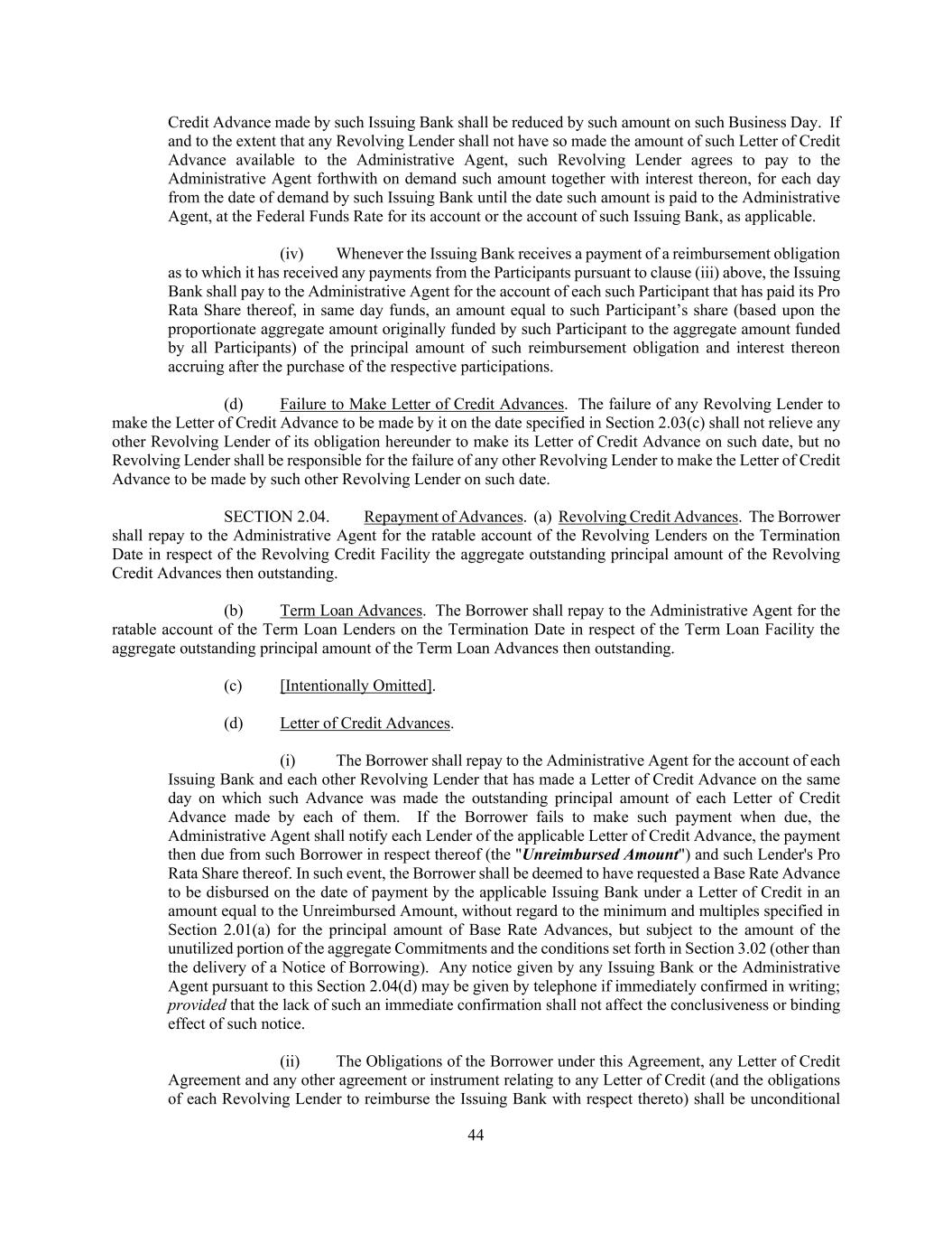 44 Credit Advance made by such Issuing Bank shall be reduced by such amount on such Business Day. If and to the extent that any Revolving Lender shall not have so made the amount of such Letter of Credit Advance available to the Administrative Agent, such Revolving Lender agrees to pay to the Administrative Agent forthwith on demand such amount together with interest thereon, for each day from the date of demand by such Issuing Bank until the date such amount is paid to the Administrative Agent, at the Federal Funds Rate for its account or the account of such Issuing Bank, as applicable. (iv) Whenever the Issuing Bank receives a payment of a reimbursement obligation as to which it has received any payments from the Participants pursuant to clause (iii) above, the Issuing Bank shall pay to the Administrative Agent for the account of each such Participant that has paid its Pro Rata Share thereof, in same day funds, an amount equal to such Participant’s share (based upon the proportionate aggregate amount originally funded by such Participant to the aggregate amount funded by all Participants) of the principal amount of such reimbursement obligation and interest thereon accruing after the purchase of the respective participations. (d) Failure to Make Letter of Credit Advances. The failure of any Revolving Lender to make the Letter of Credit Advance to be made by it on the date specified in Section 2.03(c) shall not relieve any other Revolving Lender of its obligation hereunder to make its Letter of Credit Advance on such date, but no Revolving Lender shall be responsible for the failure of any other Revolving Lender to make the Letter of Credit Advance to be made by such other Revolving Lender on such date. SECTION 2.04. Repayment of Advances. (a) Revolving Credit Advances. The Borrower shall repay to the Administrative Agent for the ratable account of the Revolving Lenders on the Termination Date in respect of the Revolving Credit Facility the aggregate outstanding principal amount of the Revolving Credit Advances then outstanding. (b) Term Loan Advances. The Borrower shall repay to the Administrative Agent for the ratable account of the Term Loan Lenders on the Termination Date in respect of the Term Loan Facility the aggregate outstanding principal amount of the Term Loan Advances then outstanding. (c) [Intentionally Omitted]. (d) Letter of Credit Advances. (i) The Borrower shall repay to the Administrative Agent for the account of each Issuing Bank and each other Revolving Lender that has made a Letter of Credit Advance on the same day on which such Advance was made the outstanding principal amount of each Letter of Credit Advance made by each of them. If the Borrower fails to make such payment when due, the Administrative Agent shall notify each Lender of the applicable Letter of Credit Advance, the payment then due from such Borrower in respect thereof (the "Unreimbursed Amount") and such Lender's Pro Rata Share thereof. In such event, the Borrower shall be deemed to have requested a Base Rate Advance to be disbursed on the date of payment by the applicable Issuing Bank under a Letter of Credit in an amount equal to the Unreimbursed Amount, without regard to the minimum and multiples specified in Section 2.01(a) for the principal amount of Base Rate Advances, but subject to the amount of the unutilized portion of the aggregate Commitments and the conditions set forth in Section 3.02 (other than the delivery of a Notice of Borrowing). Any notice given by any Issuing Bank or the Administrative Agent pursuant to this Section 2.04(d) may be given by telephone if immediately confirmed in writing; provided that the lack of such an immediate confirmation shall not affect the conclusiveness or binding effect of such notice. (ii) The Obligations of the Borrower under this Agreement, any Letter of Credit Agreement and any other agreement or instrument relating to any Letter of Credit (and the obligations of each Revolving Lender to reimburse the Issuing Bank with respect thereto) shall be unconditional