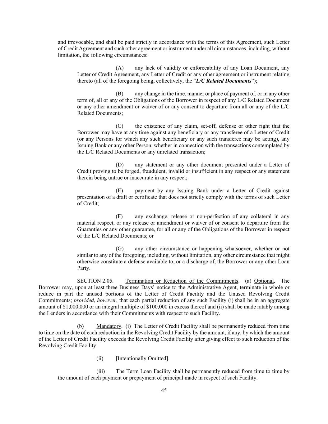 45 and irrevocable, and shall be paid strictly in accordance with the terms of this Agreement, such Letter of Credit Agreement and such other agreement or instrument under all circumstances, including, without limitation, the following circumstances: (A) any lack of validity or enforceability of any Loan Document, any Letter of Credit Agreement, any Letter of Credit or any other agreement or instrument relating thereto (all of the foregoing being, collectively, the “L/C Related Documents”); (B) any change in the time, manner or place of payment of, or in any other term of, all or any of the Obligations of the Borrower in respect of any L/C Related Document or any other amendment or waiver of or any consent to departure from all or any of the L/C Related Documents; (C) the existence of any claim, set-off, defense or other right that the Borrower may have at any time against any beneficiary or any transferee of a Letter of Credit (or any Persons for which any such beneficiary or any such transferee may be acting), any Issuing Bank or any other Person, whether in connection with the transactions contemplated by the L/C Related Documents or any unrelated transaction; (D) any statement or any other document presented under a Letter of Credit proving to be forged, fraudulent, invalid or insufficient in any respect or any statement therein being untrue or inaccurate in any respect; (E) payment by any Issuing Bank under a Letter of Credit against presentation of a draft or certificate that does not strictly comply with the terms of such Letter of Credit; (F) any exchange, release or non-perfection of any collateral in any material respect, or any release or amendment or waiver of or consent to departure from the Guaranties or any other guarantee, for all or any of the Obligations of the Borrower in respect of the L/C Related Documents; or (G) any other circumstance or happening whatsoever, whether or not similar to any of the foregoing, including, without limitation, any other circumstance that might otherwise constitute a defense available to, or a discharge of, the Borrower or any other Loan Party. SECTION 2.05. Termination or Reduction of the Commitments. (a) Optional. The Borrower may, upon at least three Business Days’ notice to the Administrative Agent, terminate in whole or reduce in part the unused portions of the Letter of Credit Facility and the Unused Revolving Credit Commitments; provided, however, that each partial reduction of any such Facility (i) shall be in an aggregate amount of $1,000,000 or an integral multiple of $100,000 in excess thereof and (ii) shall be made ratably among the Lenders in accordance with their Commitments with respect to such Facility. (b) Mandatory. (i) The Letter of Credit Facility shall be permanently reduced from time to time on the date of each reduction in the Revolving Credit Facility by the amount, if any, by which the amount of the Letter of Credit Facility exceeds the Revolving Credit Facility after giving effect to such reduction of the Revolving Credit Facility. (ii) [Intentionally Omitted]. (iii) The Term Loan Facility shall be permanently reduced from time to time by the amount of each payment or prepayment of principal made in respect of such Facility.