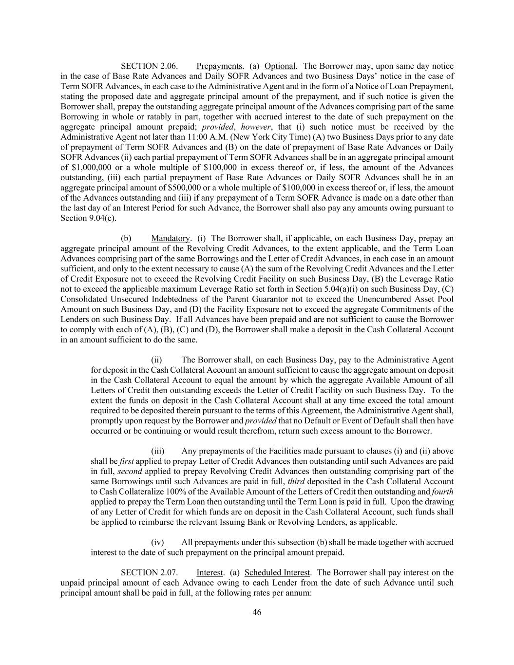 46 SECTION 2.06. Prepayments. (a) Optional. The Borrower may, upon same day notice in the case of Base Rate Advances and Daily SOFR Advances and two Business Days’ notice in the case of Term SOFR Advances, in each case to the Administrative Agent and in the form of a Notice of Loan Prepayment, stating the proposed date and aggregate principal amount of the prepayment, and if such notice is given the Borrower shall, prepay the outstanding aggregate principal amount of the Advances comprising part of the same Borrowing in whole or ratably in part, together with accrued interest to the date of such prepayment on the aggregate principal amount prepaid; provided, however, that (i) such notice must be received by the Administrative Agent not later than 11:00 A.M. (New York City Time) (A) two Business Days prior to any date of prepayment of Term SOFR Advances and (B) on the date of prepayment of Base Rate Advances or Daily SOFR Advances (ii) each partial prepayment of Term SOFR Advances shall be in an aggregate principal amount of $1,000,000 or a whole multiple of $100,000 in excess thereof or, if less, the amount of the Advances outstanding, (iii) each partial prepayment of Base Rate Advances or Daily SOFR Advances shall be in an aggregate principal amount of $500,000 or a whole multiple of $100,000 in excess thereof or, if less, the amount of the Advances outstanding and (iii) if any prepayment of a Term SOFR Advance is made on a date other than the last day of an Interest Period for such Advance, the Borrower shall also pay any amounts owing pursuant to Section 9.04(c). (b) Mandatory. (i) The Borrower shall, if applicable, on each Business Day, prepay an aggregate principal amount of the Revolving Credit Advances, to the extent applicable, and the Term Loan Advances comprising part of the same Borrowings and the Letter of Credit Advances, in each case in an amount sufficient, and only to the extent necessary to cause (A) the sum of the Revolving Credit Advances and the Letter of Credit Exposure not to exceed the Revolving Credit Facility on such Business Day, (B) the Leverage Ratio not to exceed the applicable maximum Leverage Ratio set forth in Section 5.04(a)(i) on such Business Day, (C) Consolidated Unsecured Indebtedness of the Parent Guarantor not to exceed the Unencumbered Asset Pool Amount on such Business Day, and (D) the Facility Exposure not to exceed the aggregate Commitments of the Lenders on such Business Day. If all Advances have been prepaid and are not sufficient to cause the Borrower to comply with each of (A), (B), (C) and (D), the Borrower shall make a deposit in the Cash Collateral Account in an amount sufficient to do the same. (ii) The Borrower shall, on each Business Day, pay to the Administrative Agent for deposit in the Cash Collateral Account an amount sufficient to cause the aggregate amount on deposit in the Cash Collateral Account to equal the amount by which the aggregate Available Amount of all Letters of Credit then outstanding exceeds the Letter of Credit Facility on such Business Day. To the extent the funds on deposit in the Cash Collateral Account shall at any time exceed the total amount required to be deposited therein pursuant to the terms of this Agreement, the Administrative Agent shall, promptly upon request by the Borrower and provided that no Default or Event of Default shall then have occurred or be continuing or would result therefrom, return such excess amount to the Borrower. (iii) Any prepayments of the Facilities made pursuant to clauses (i) and (ii) above shall be first applied to prepay Letter of Credit Advances then outstanding until such Advances are paid in full, second applied to prepay Revolving Credit Advances then outstanding comprising part of the same Borrowings until such Advances are paid in full, third deposited in the Cash Collateral Account to Cash Collateralize 100% of the Available Amount of the Letters of Credit then outstanding and fourth applied to prepay the Term Loan then outstanding until the Term Loan is paid in full. Upon the drawing of any Letter of Credit for which funds are on deposit in the Cash Collateral Account, such funds shall be applied to reimburse the relevant Issuing Bank or Revolving Lenders, as applicable. (iv) All prepayments under this subsection (b) shall be made together with accrued interest to the date of such prepayment on the principal amount prepaid. SECTION 2.07. Interest. (a) Scheduled Interest. The Borrower shall pay interest on the unpaid principal amount of each Advance owing to each Lender from the date of such Advance until such principal amount shall be paid in full, at the following rates per annum: